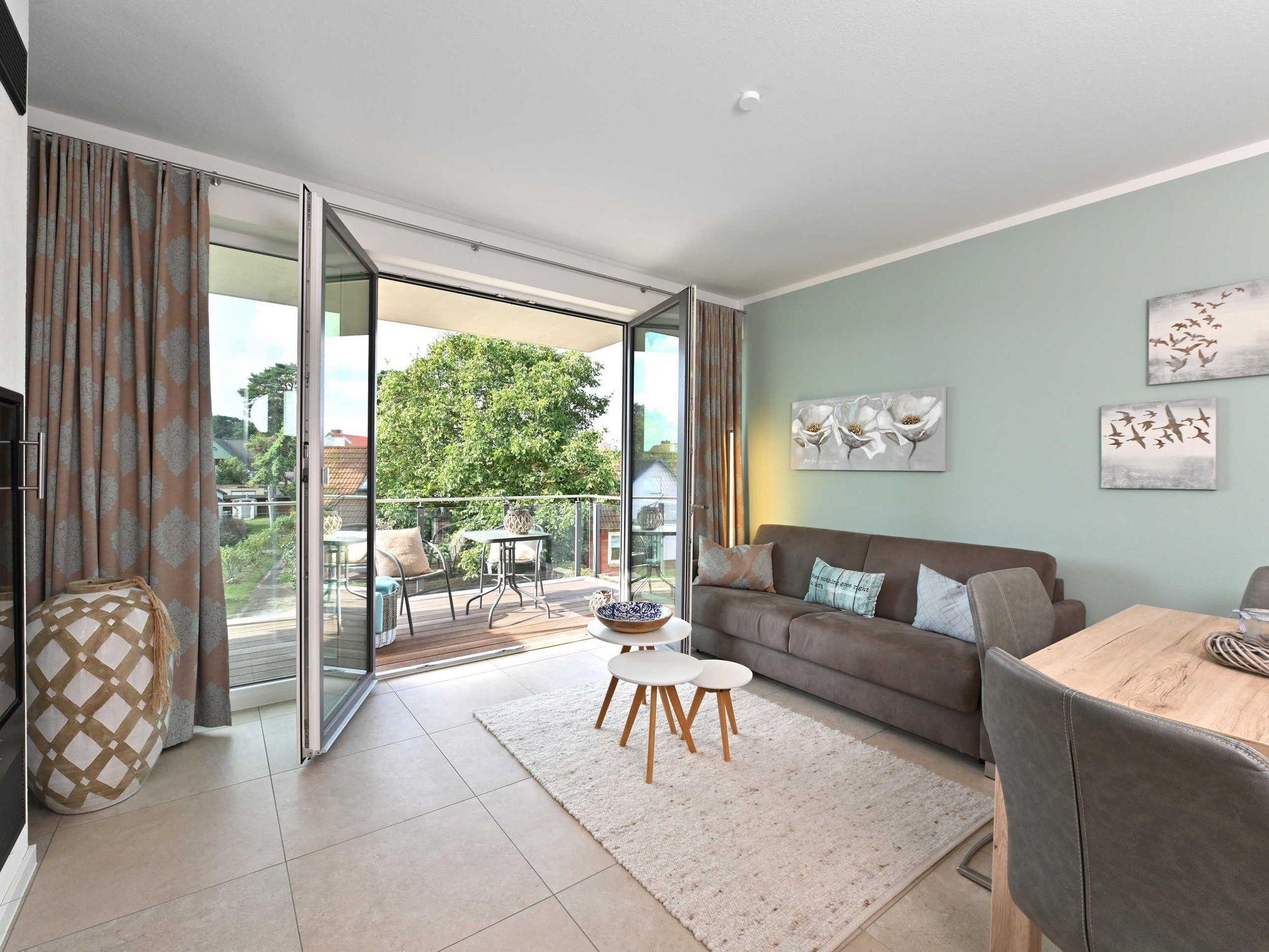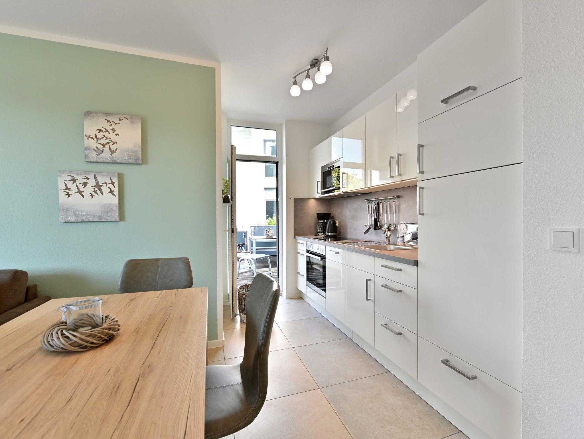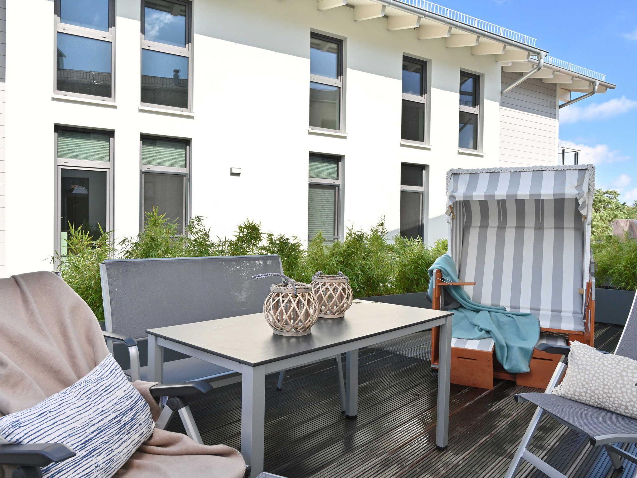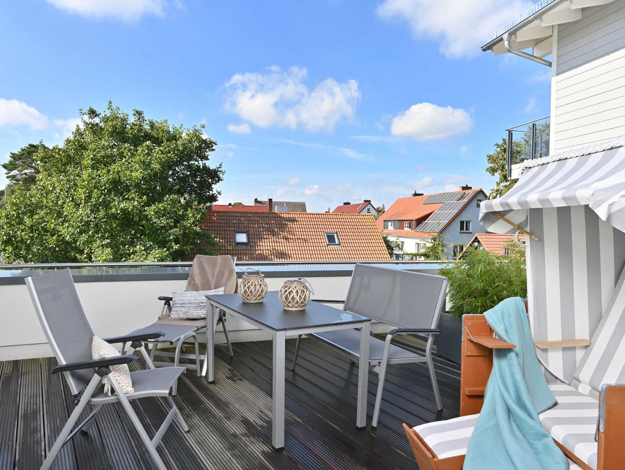 Die Trauminsel verfügt über einen Balkon wie auch über eine große Dachterrasse. Aus dem Wohnbereich erreichen Sie den Balkon wie auch die großzügige Dachterrasse. Ein Strandkorb und weitere Gartenmöbel laden hier zum verweilen ein.