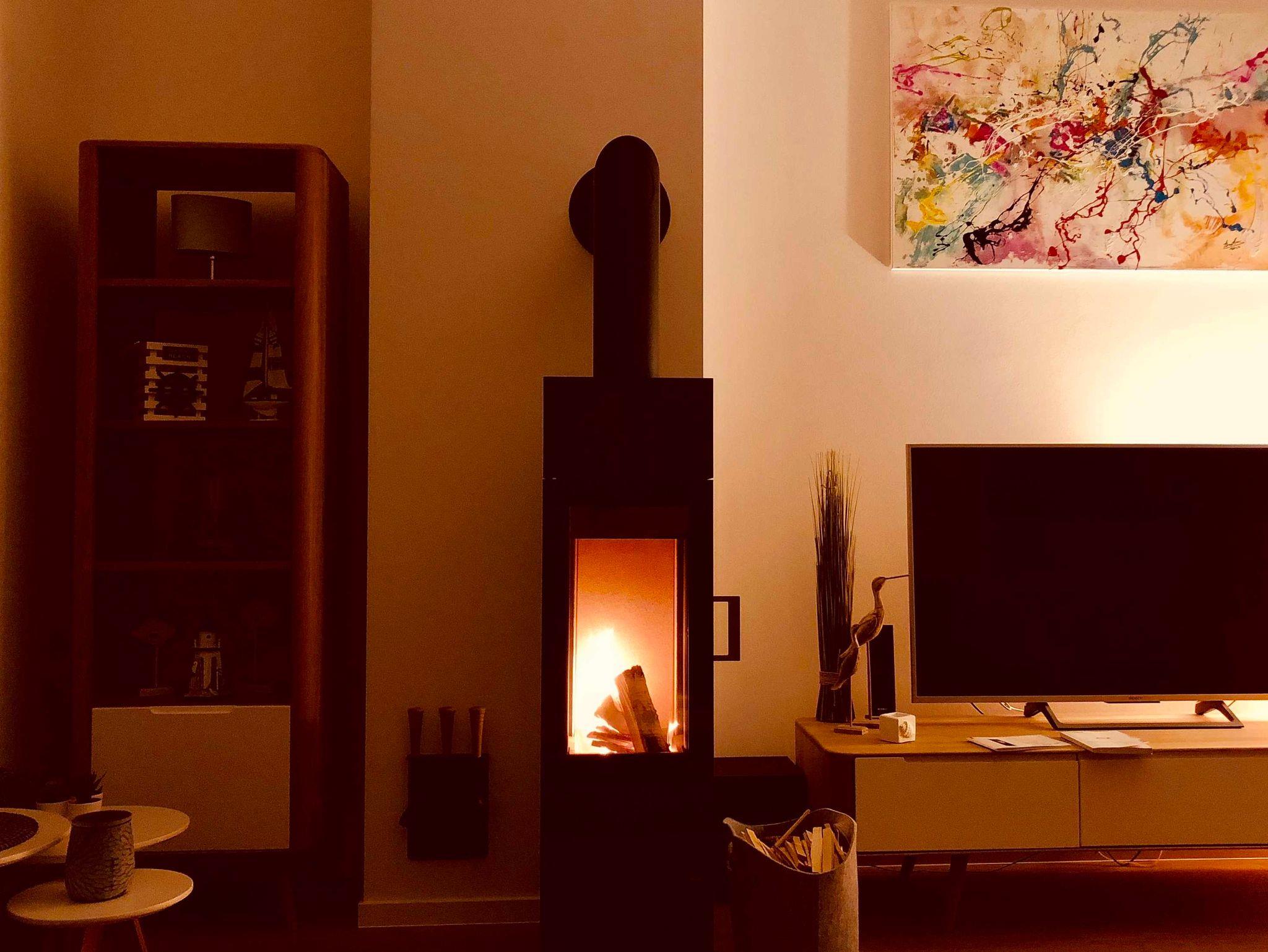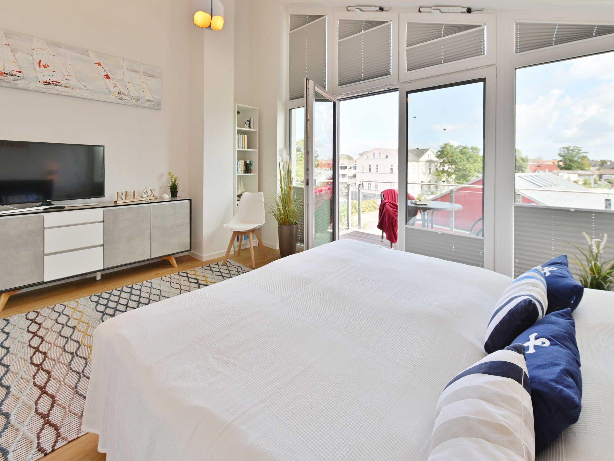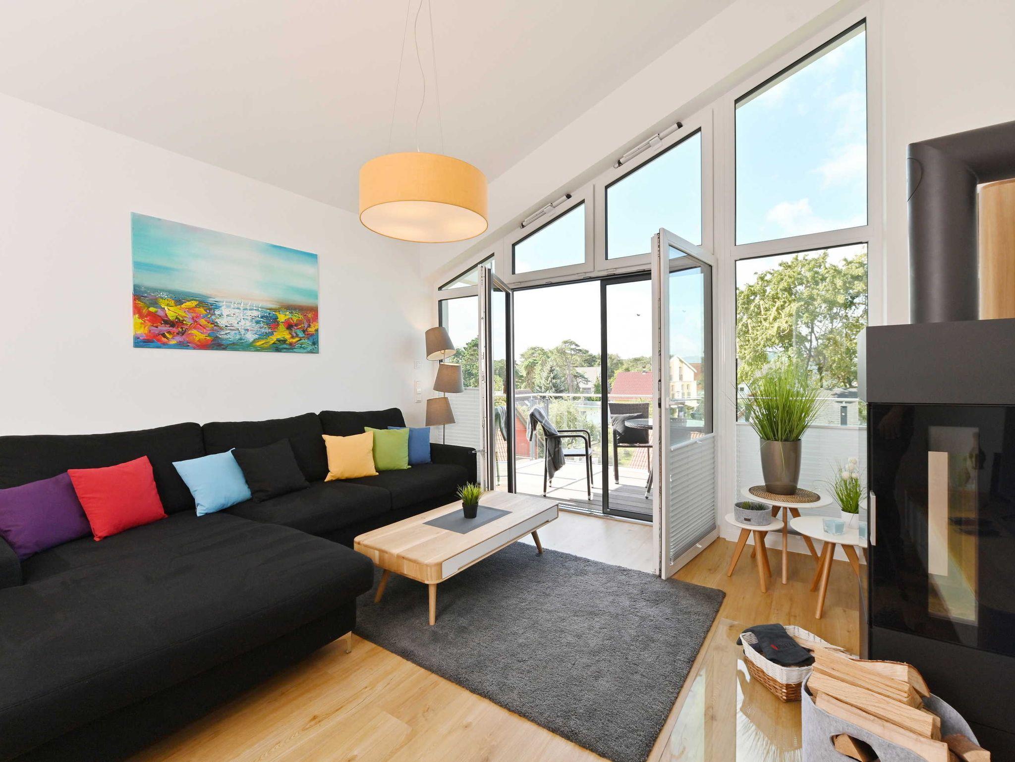Die Wohnung bietet auf 80qm einen gemütlichen Wohnraum mit Kamin und integrierter Küche, zwei Schlafräume mit je einem Doppelbett (180x200m bzw. 160x200) und ein Bad mit Dusche. Der Nordbalkon ist aus dem Wohnbereich zu erreichen, der Südbalkon aus einem Schlafzimmer.
