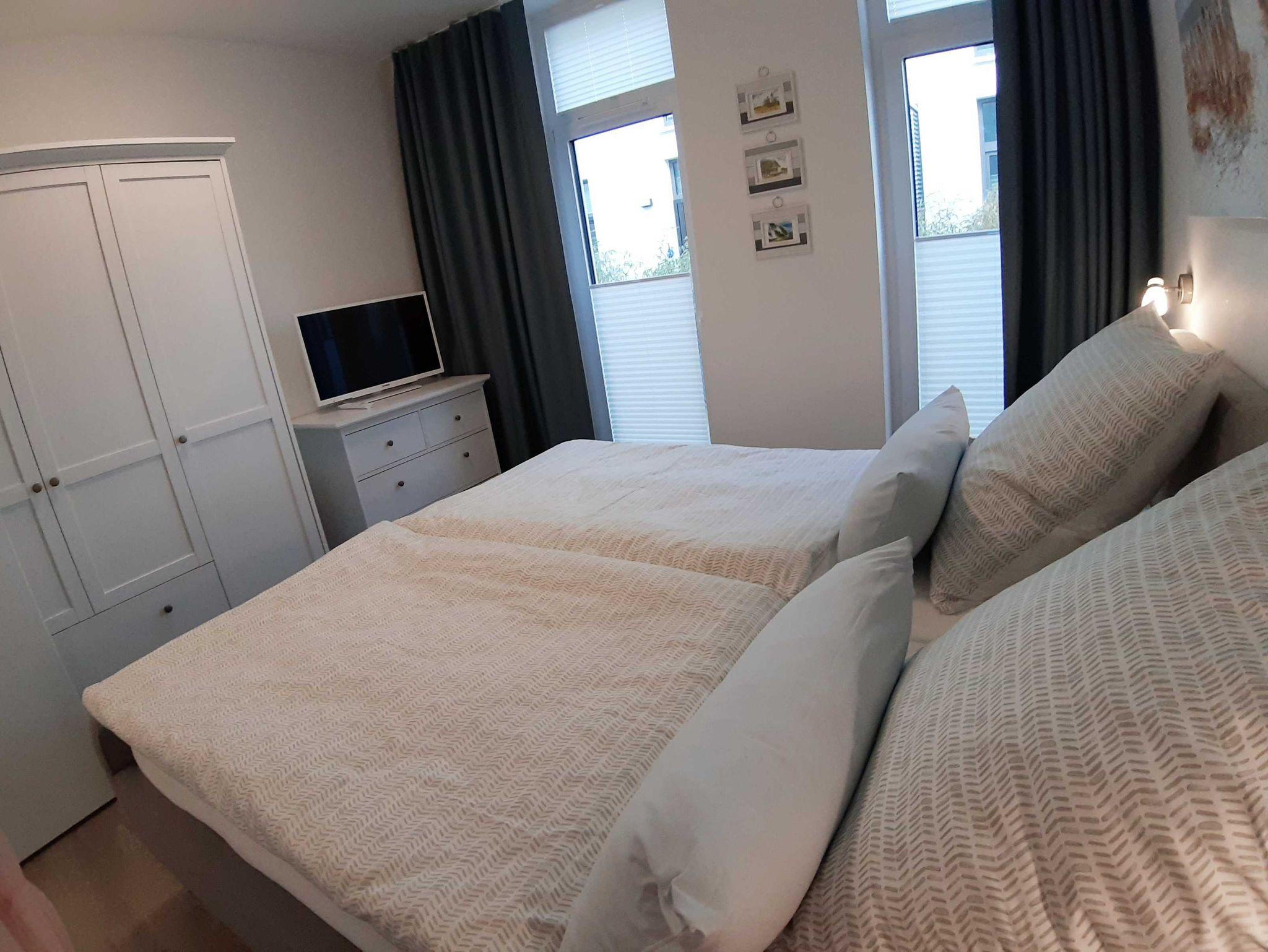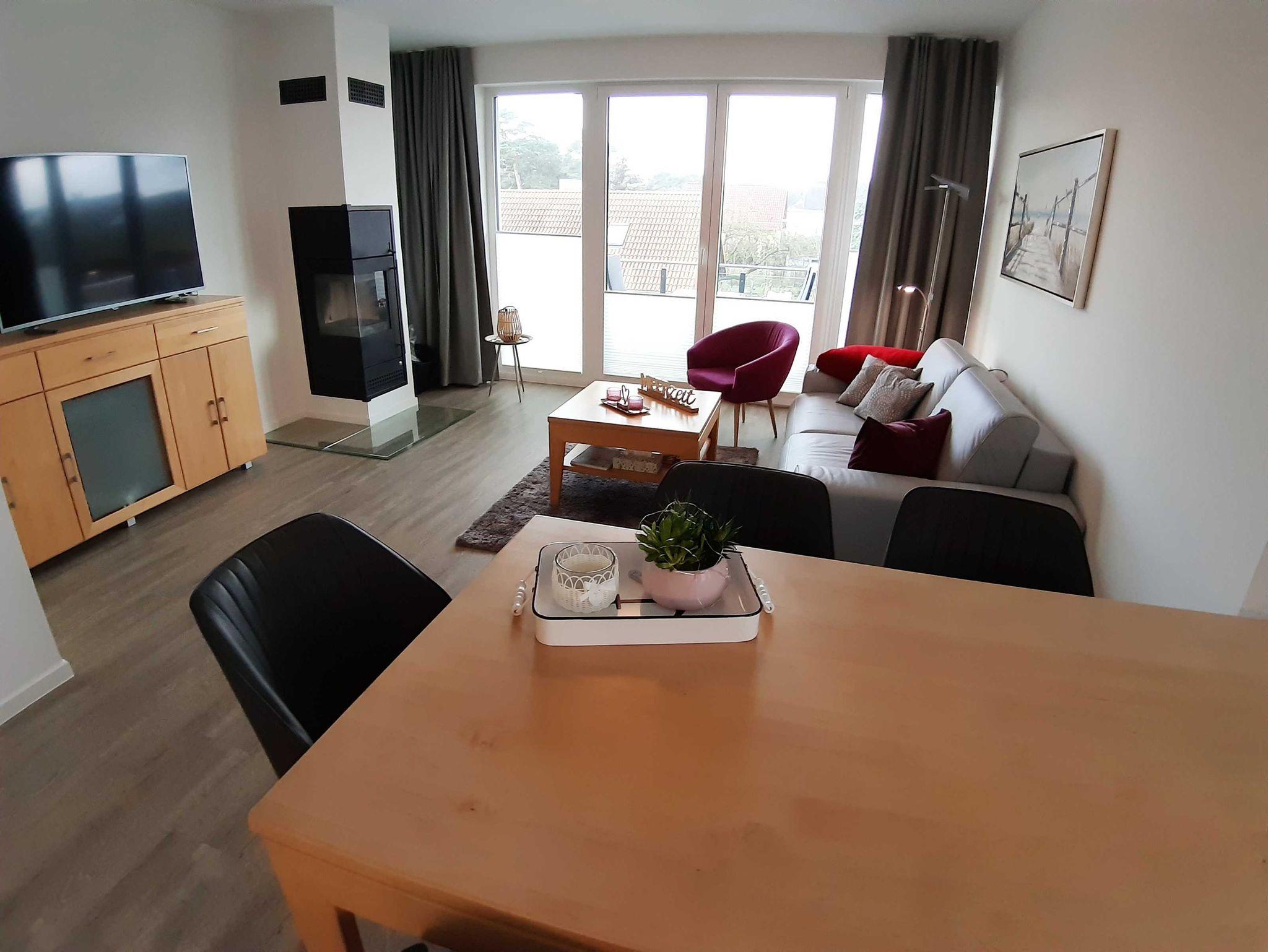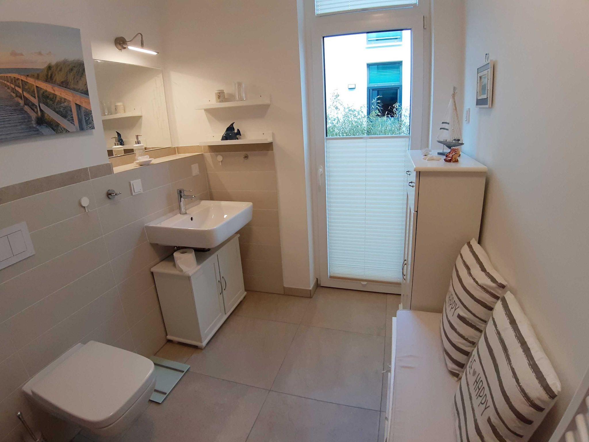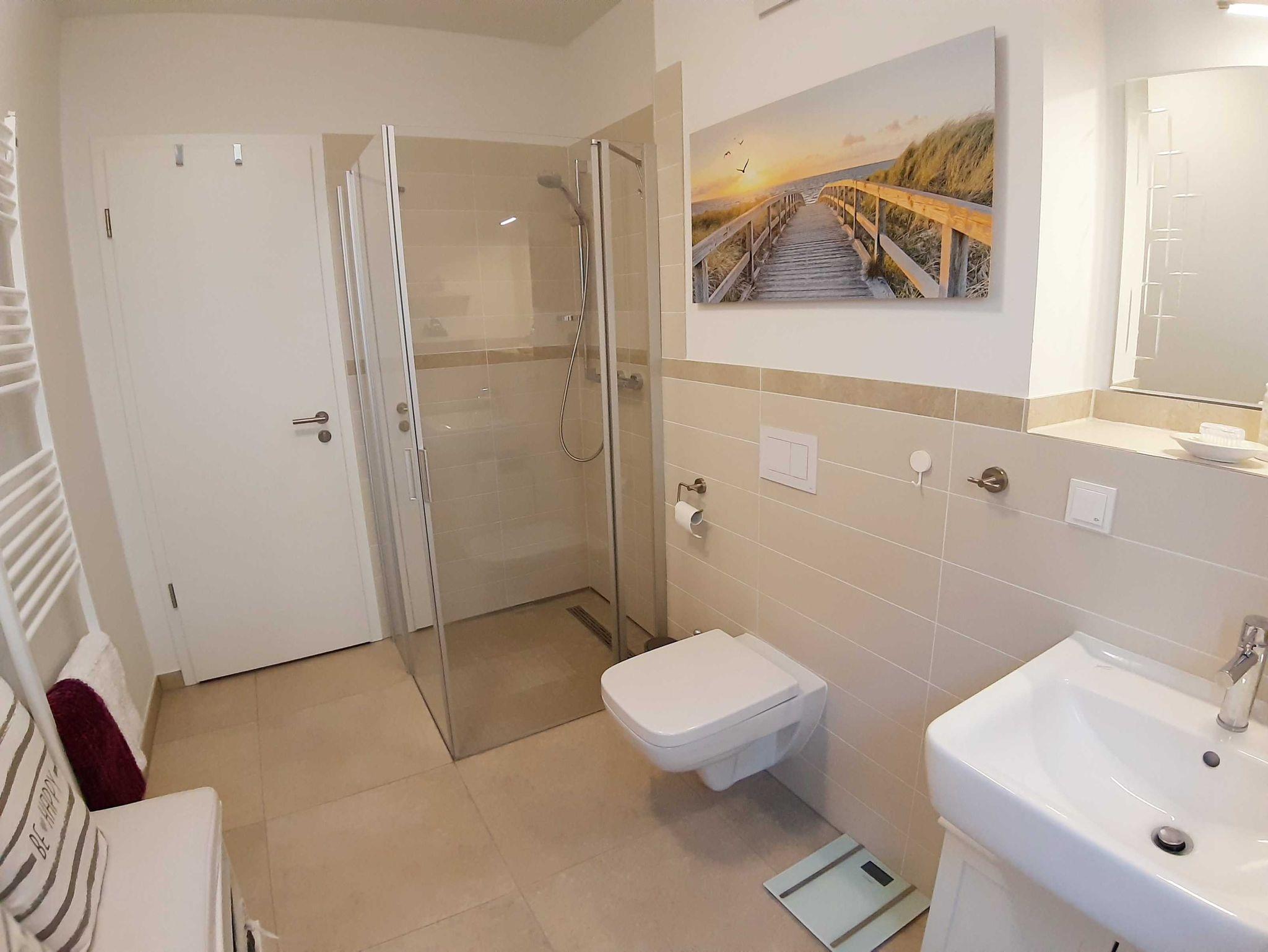 Die Wohnung Riecht nach Meer besitzt 2 Schlafzimmer, ein Bad mit Dusche, ein Gäste-WC und einen Wohnbereich mit Essbereich, Kamin und integrierter Küche, außerdem einen Balkon und eine riesige Dachterrasse mit Strandkorb. Zur Wohnung gehört ein Tiefgaragenstellplatz. Im Gebäude steht Ihnen eine Gemeinschaftssauna (kostenfrei) sowie ein Waschsalon (kostenpflichtig) mit Waschmaschine und Trockner zur Verfügung. Ihre Drahtesel parken Sie im abschließbaren Fahrradraum. Unsere Minis vergnügen sich auf einem kleinen Spielplatz.