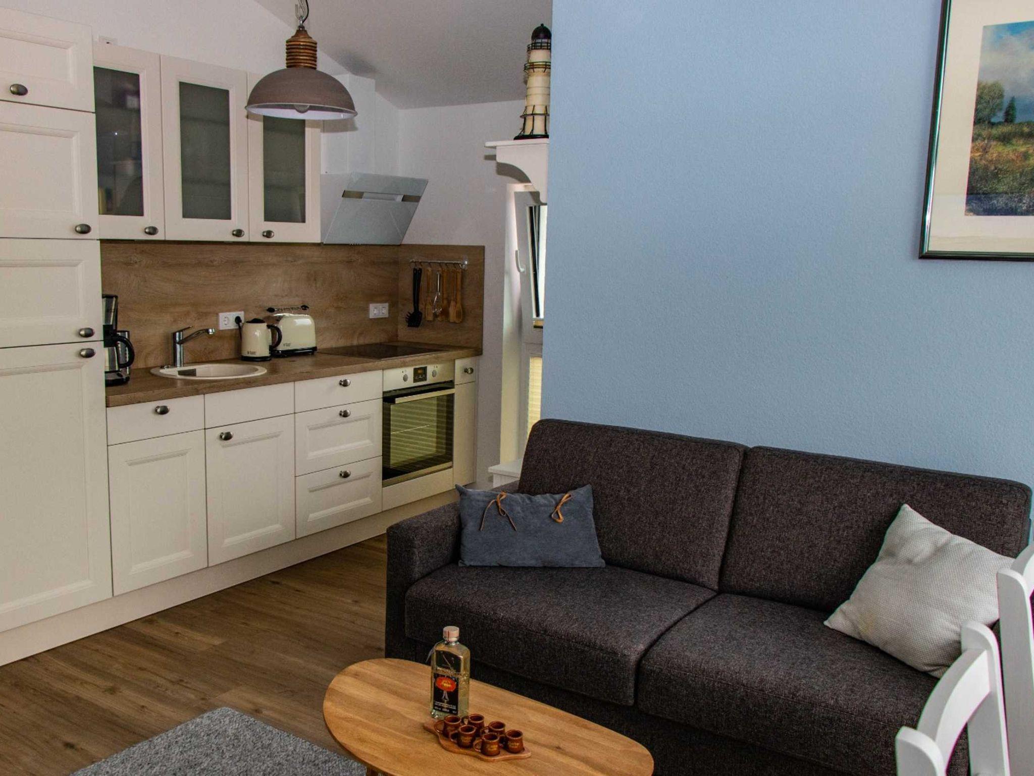 Die Wohnung bietet auf 50qm einen gemütlichen Wohnraum mit integrierter Küche, einen Schlafraum mit Doppelbett und ein Bad mit Dusche. Der Balkon ist aus dem Wohnbereich begehbar. Er bietet einen weiten Blick bis zum Großen Jasmunder Bodden.