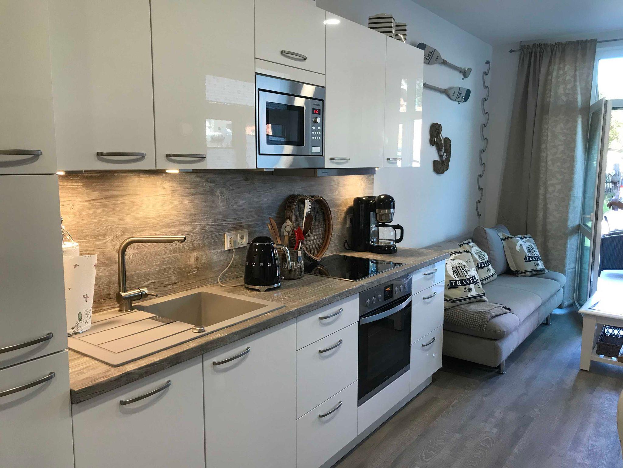 Küche mit Spülmaschine, Backofen, Mikrowelle, Kaffeefiltermaschine