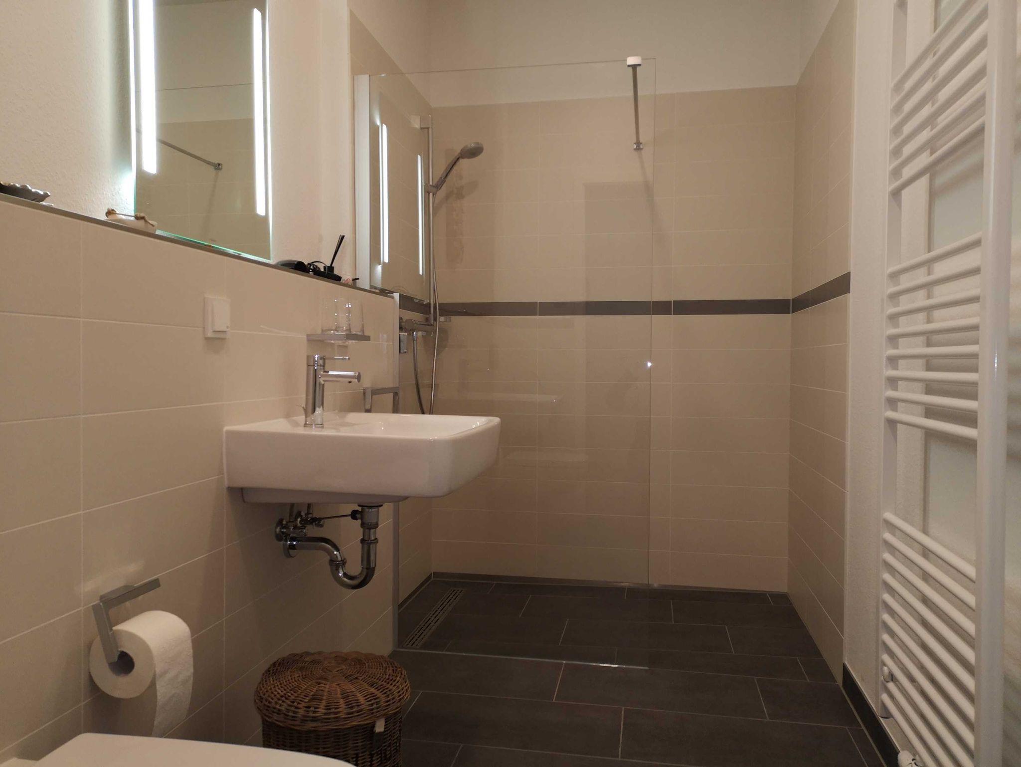 Das Schlafzimmer verfügt über ein Doppelbett und im Wohnbereich befindet sich eine Schlafcouch für die dritte Person. Das Bad ist mit einer ebenerdigen Dusche ausgestattet.