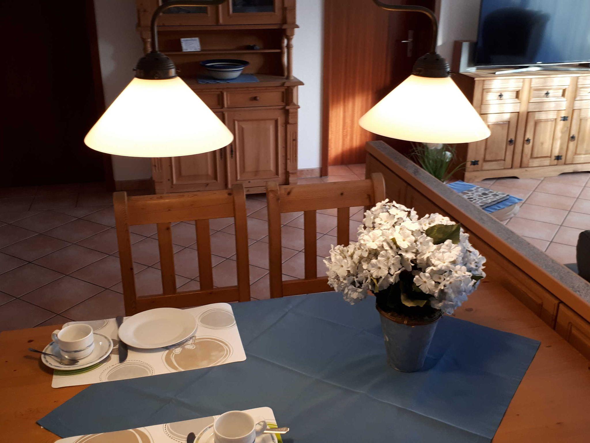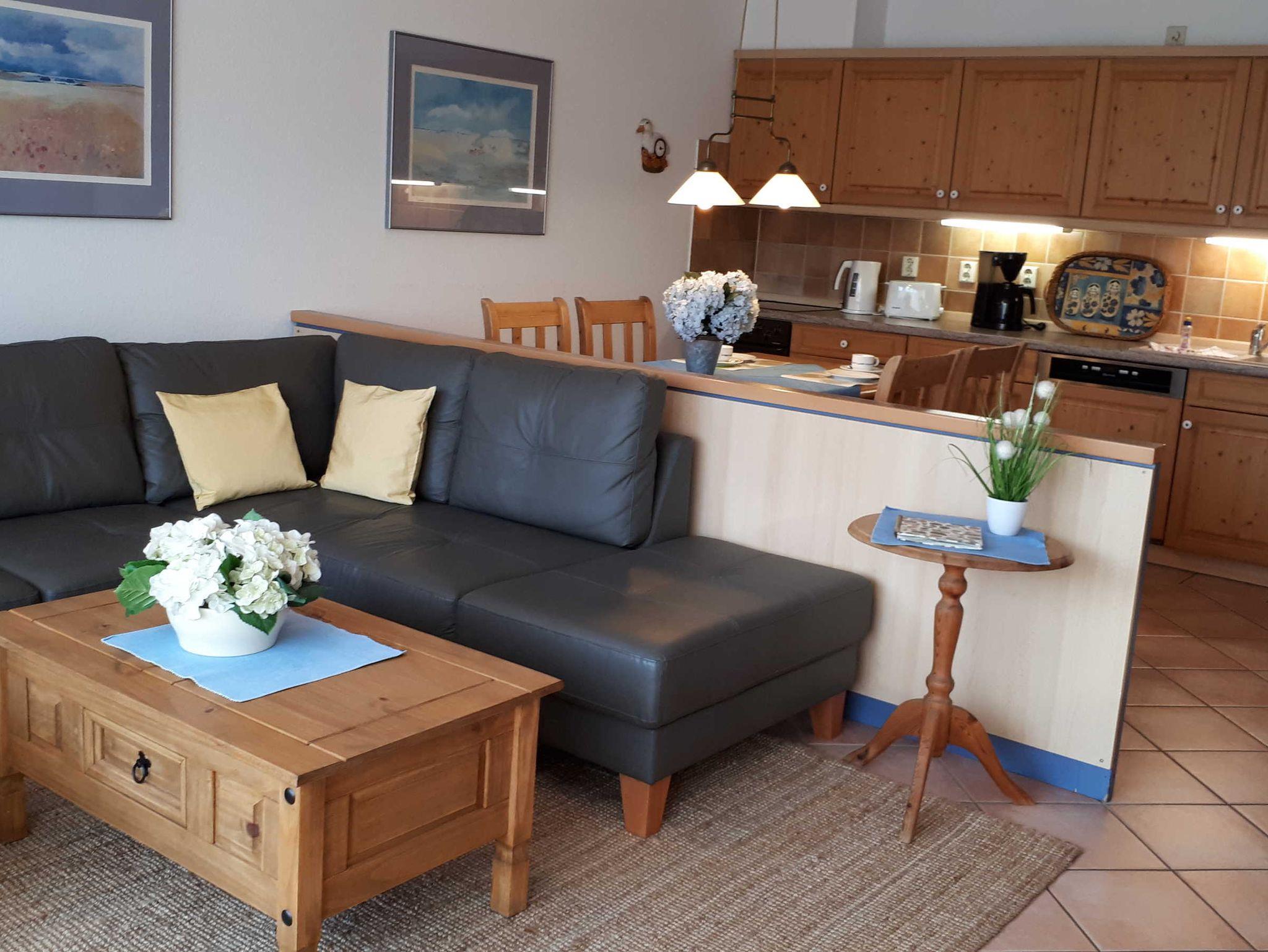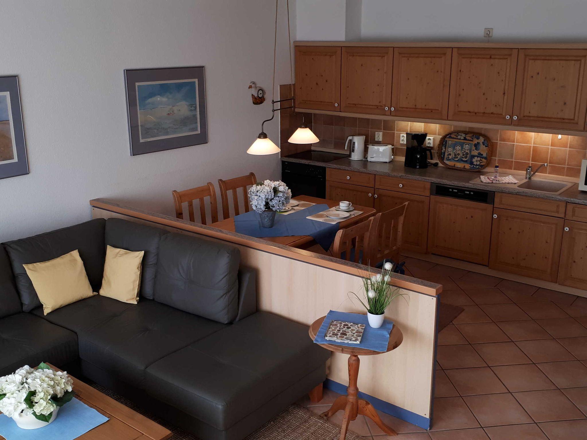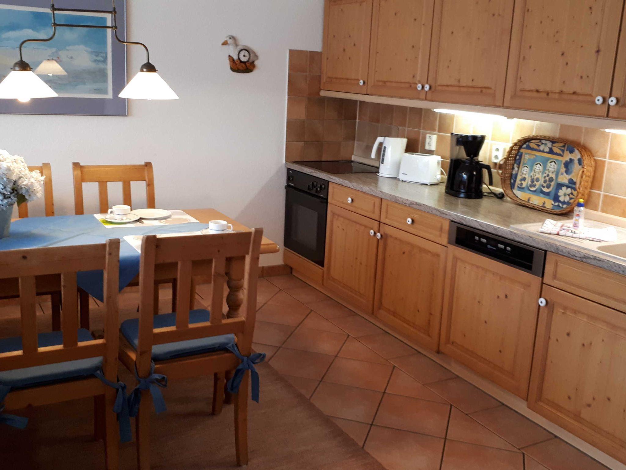 Die Küche ist komplett ausgestattet mit Geschirrspüler, Spüle, Kühlschrank mit Gefrierfach, Cerankochfeld, Backofen, Wasserkocher, Mikrowelle, Toaster, Kaffeemaschine, Eierkocher und natürlich mit Geschirr und weiteren Küchenutensilien. Von der offenen Küche kann man über die große Rundsitzgruppe bis zur Terrasse schauen. Die Möblierung ist aus Vollholz und vermittelt elegante Gemütlichkeit.