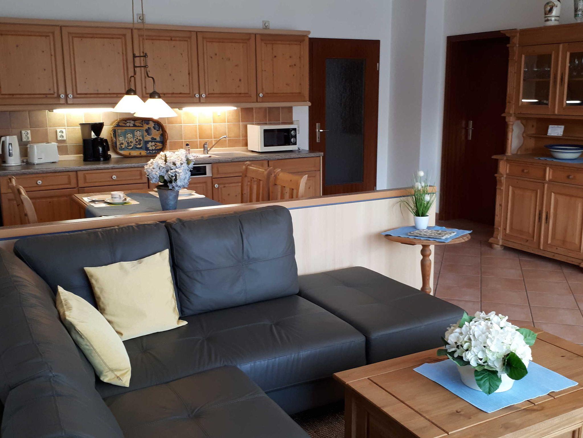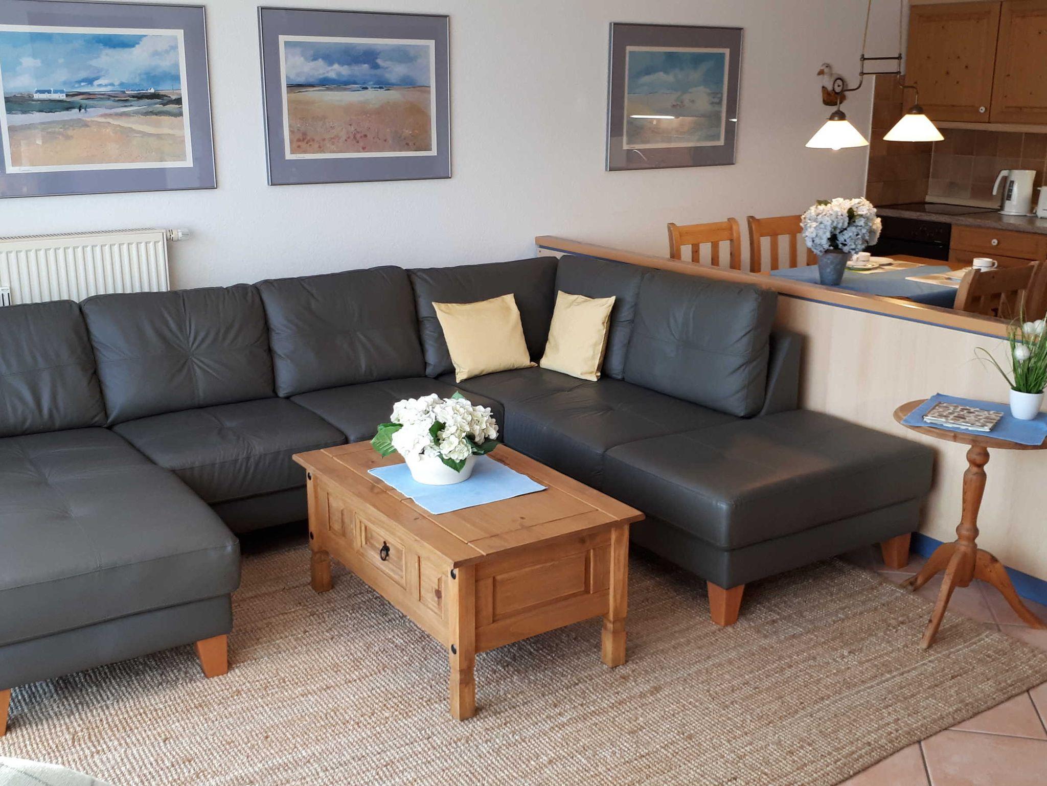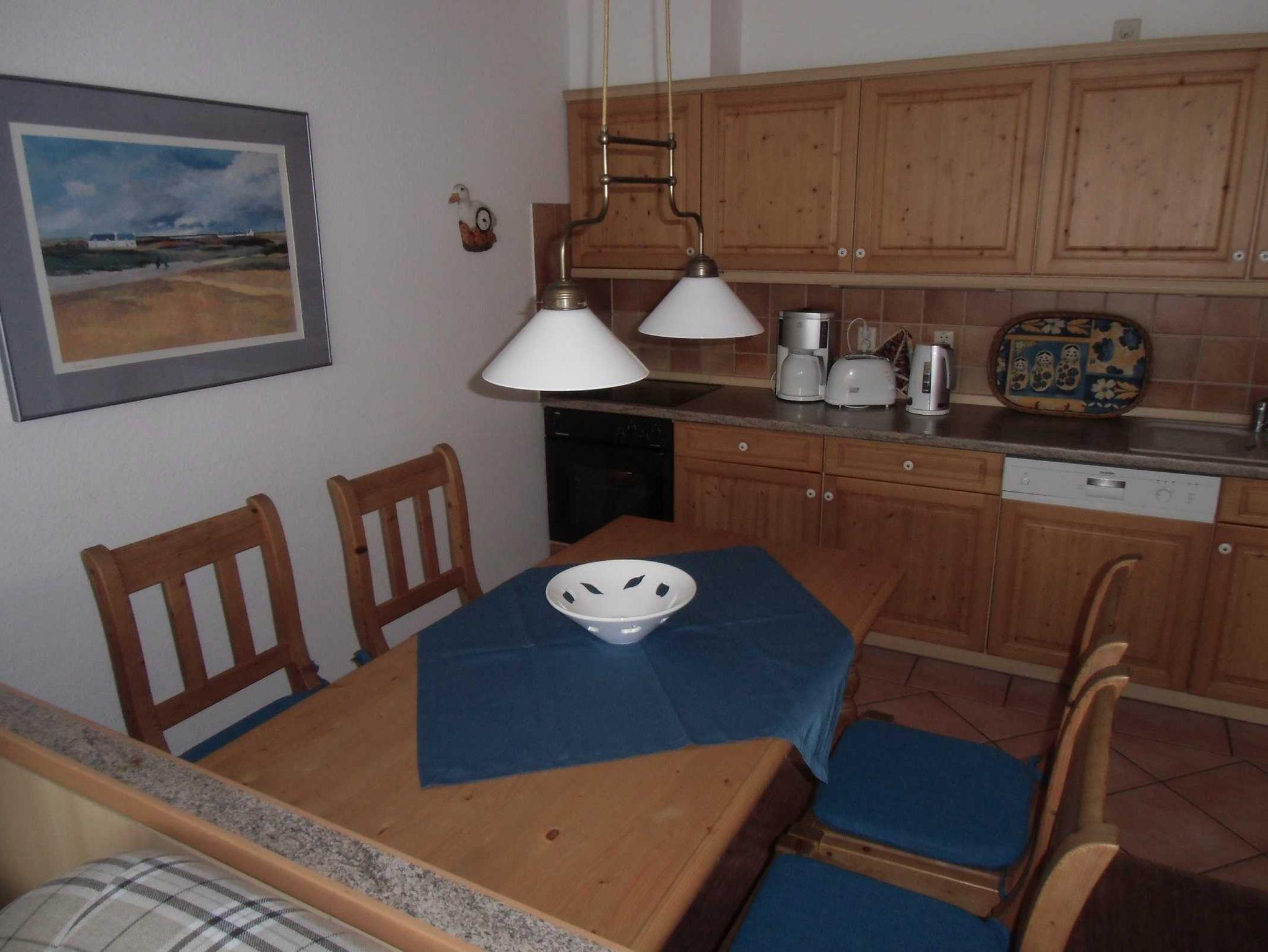 Die Küche ist komplett ausgestattet mit Geschirrspüler, Spüle, Kühlschrank mit Gefrierfach, Cerankochfeld, Backofen, Wasserkocher, Mikrowelle, Toaster, Eierkocher, Kaffeemaschine und natürlich mit Geschirr und Besteck. Von der offenen Küche kann man über die große Rundsitzgruppe bis zur Terrasse schauen. Die Möblierung ist aus Vollholz und vermittelt elegante Gemütlichkeit.