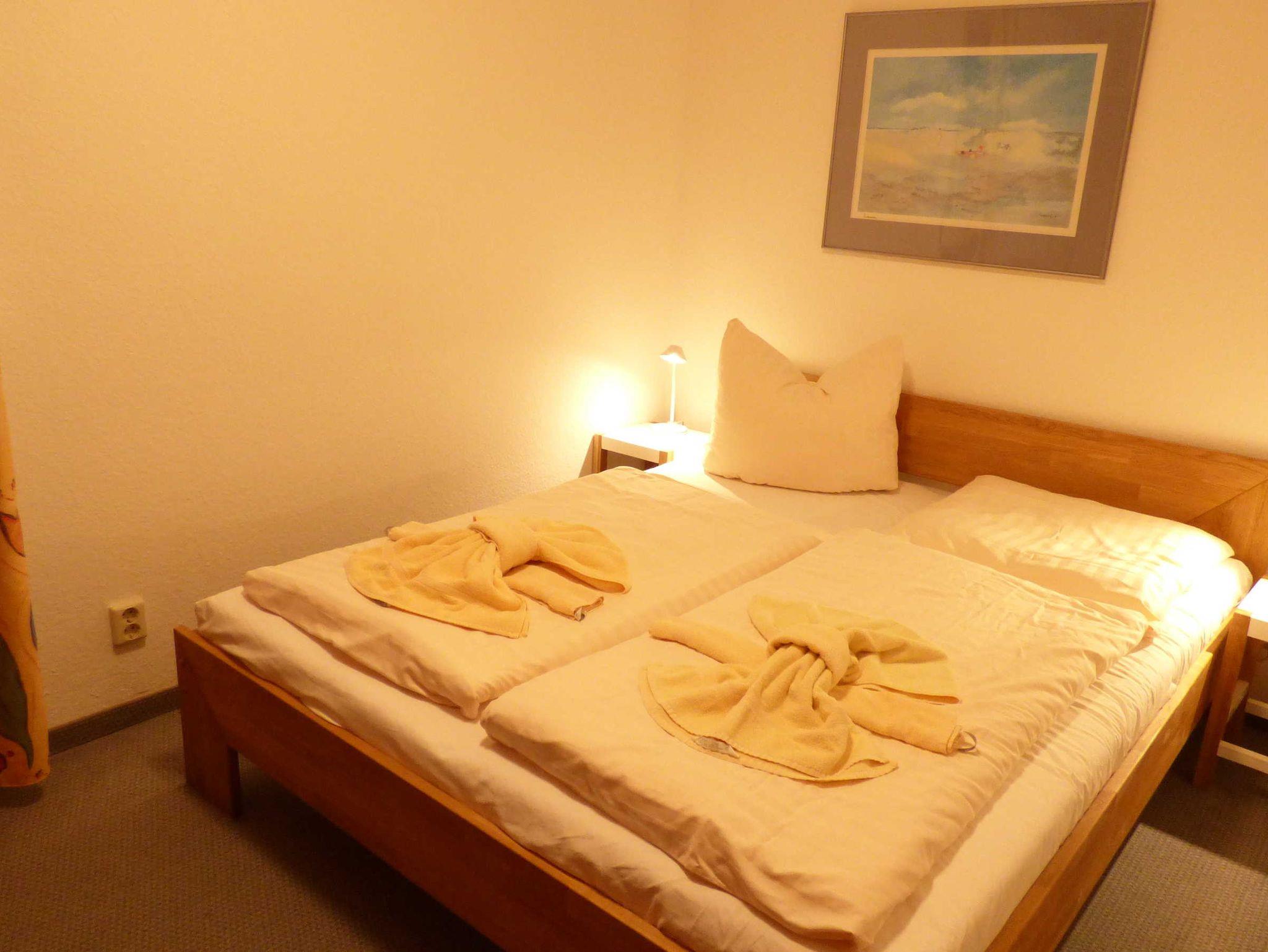 Es ist ein Elternschlafzimmer (Doppelbett 1,60 m x 2,00 m), ein Kinderschlafzimmer mit Etagenbett (je 0,90 m x 2,00 m) vorhanden und jeweils ein 3-türiger Einbauschrank für Ihre Urlaubsgarderobe. Eine Aufbettung ist zusätzlich im Wohnzimmer (Campingliege 0,75 m x 1,80 m) möglich, so dass 5 Personen ausreichend Platz haben.