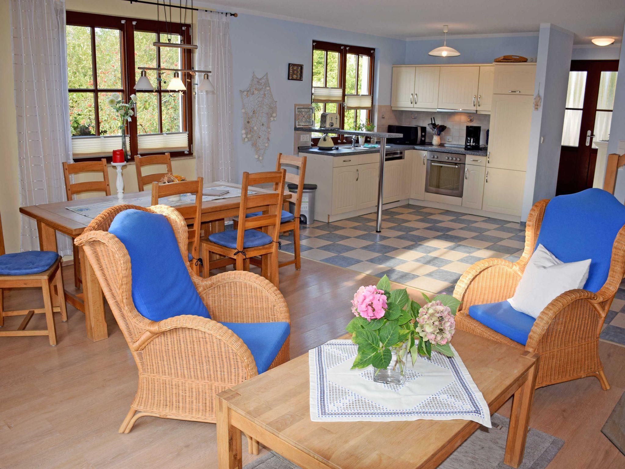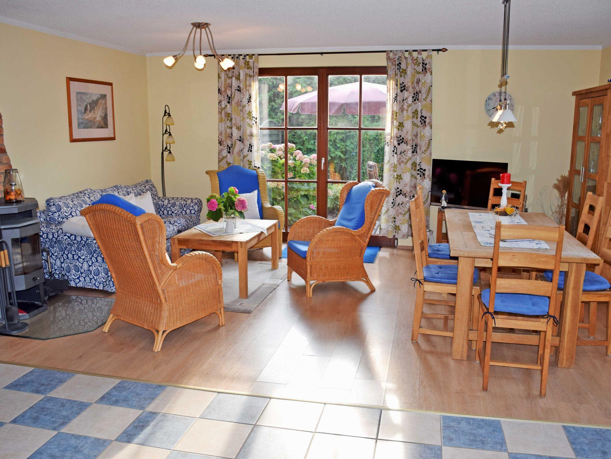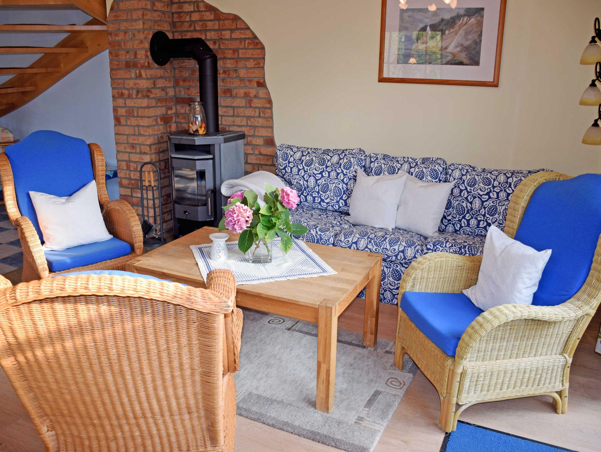 In der unteren Etage unseres Hauses befindet sich der Wohn- und Essbereich, ausgestattet mit Couch, Korbsesseln, Sat-TV, DVD-Player und einem Kaminofen. Eine Essecke für 6 Personen und ein Kinderstuhl komplettieren den Wohnbereich.