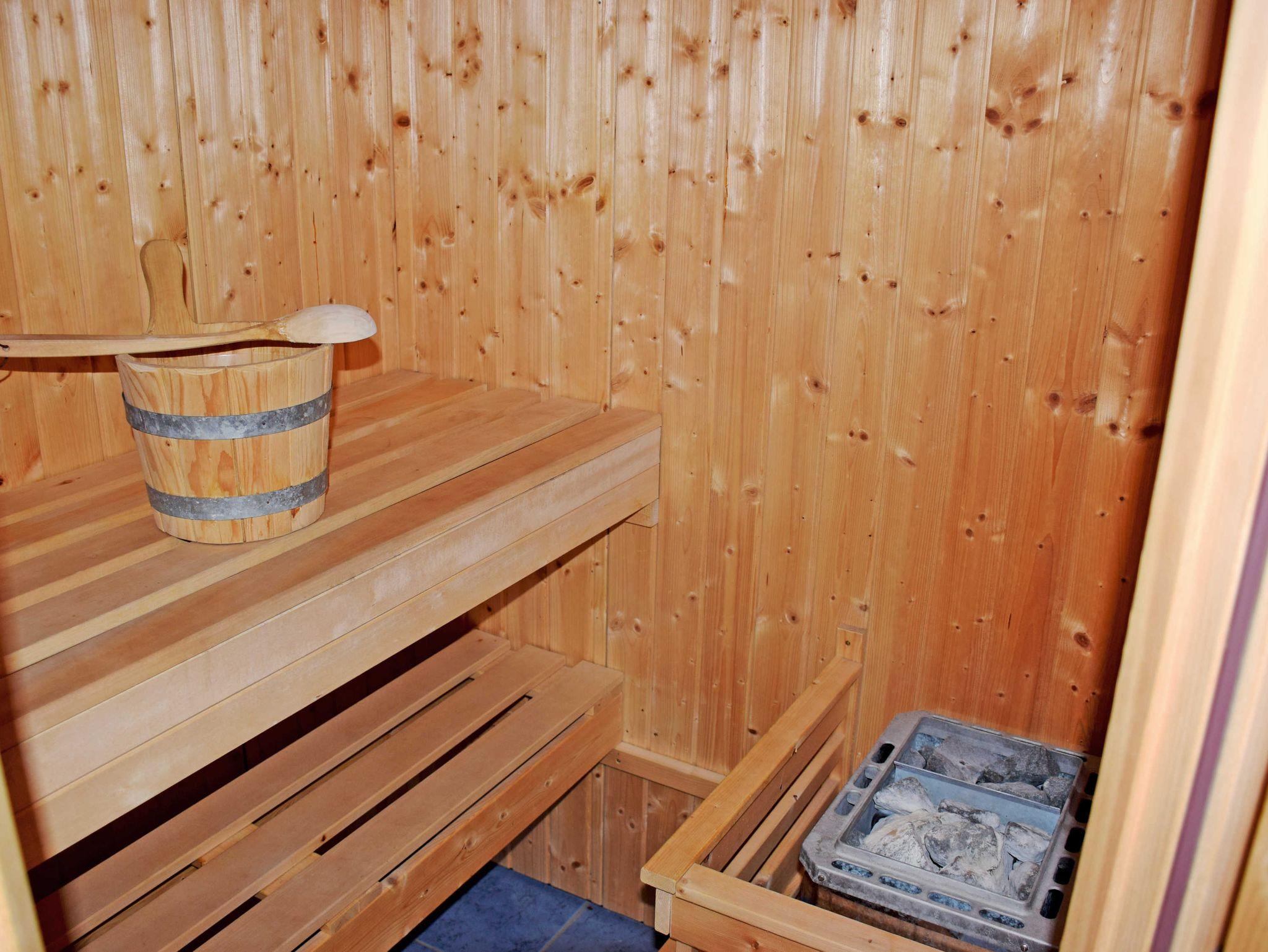 Zur Küchenecke gehören eine modern ausgestattete Küche mit Geschirrspüler, Kühlschrank mit Gefrierfach, Elektroherd mit Cerankochfeld , sowie weitere elektrische Geräte. Ebenfalls in der unteren Etage finden sie ein Bad mit Dusche, Waschbecken, WC und Sauna.