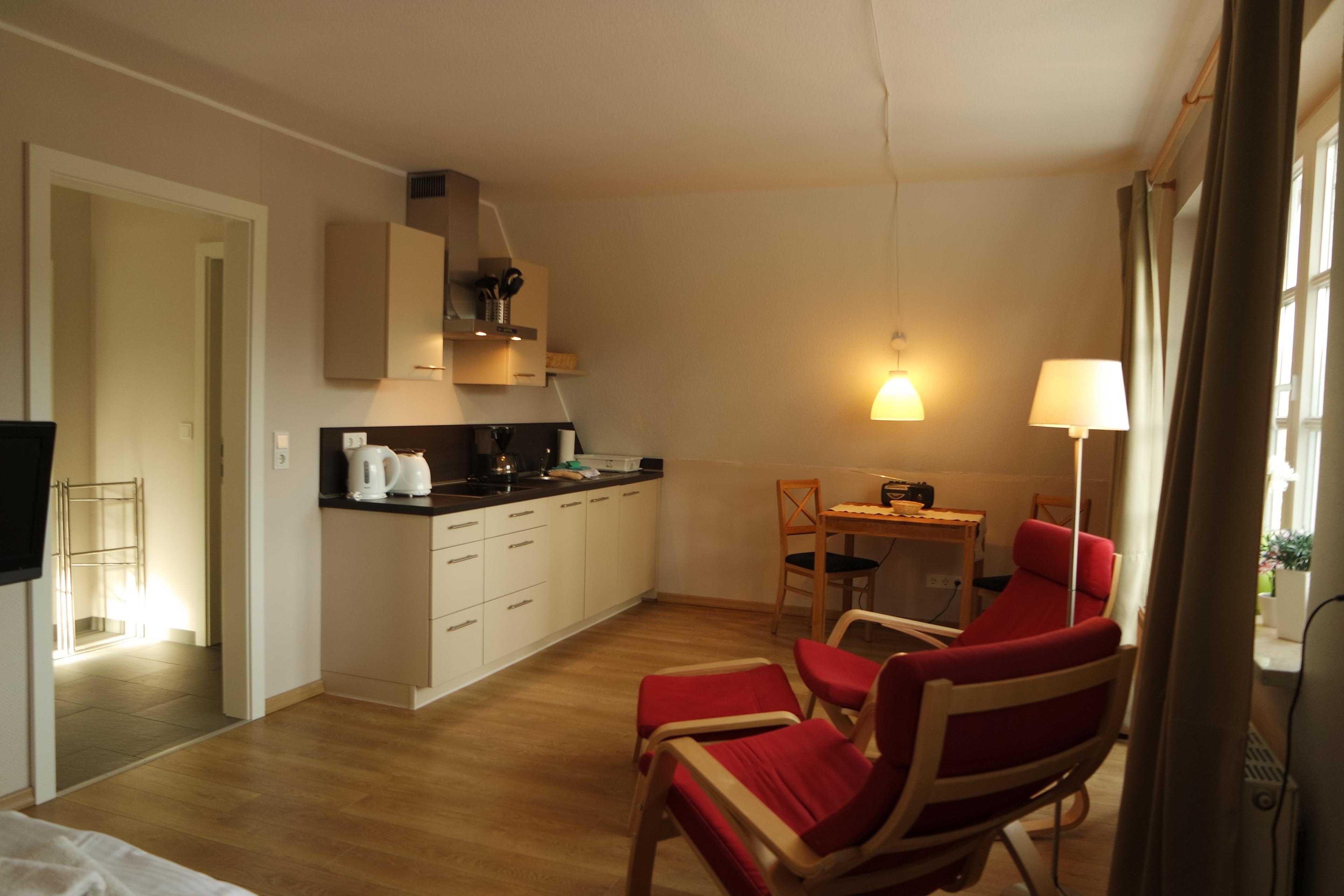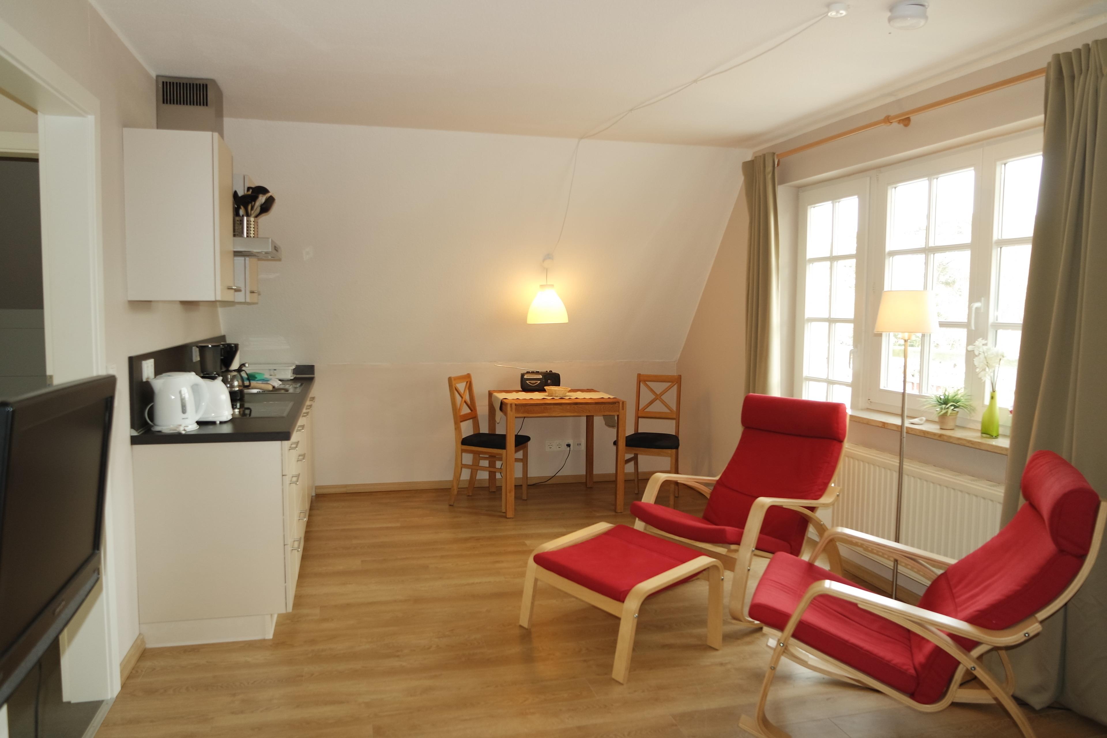 Das Appartement liegt auf der Südseite des Hauses und bietet einen großen Balkon mit Gartenmöbeln und einen Blick durch ein kleines Kiefernwäldchen. Es ist ca. 35 qm groß und verfügt über einen Wohnschlaufraum mit Doppelbett, einem SAT-TV , ein Essbereich mit Tisch und Stühlen, eine komplett eingerichtete Einbauküche mit Geschirrspüler ( mit Kaffeemaschine, Ceranfeld, Kühlschrank mit Gefrierfach, Wasserkocher etc.) ein Duschbad und einen kleinen Ankleideraum. Im gesamen Haus können sie unser kostenfreies Wlan nutzen.