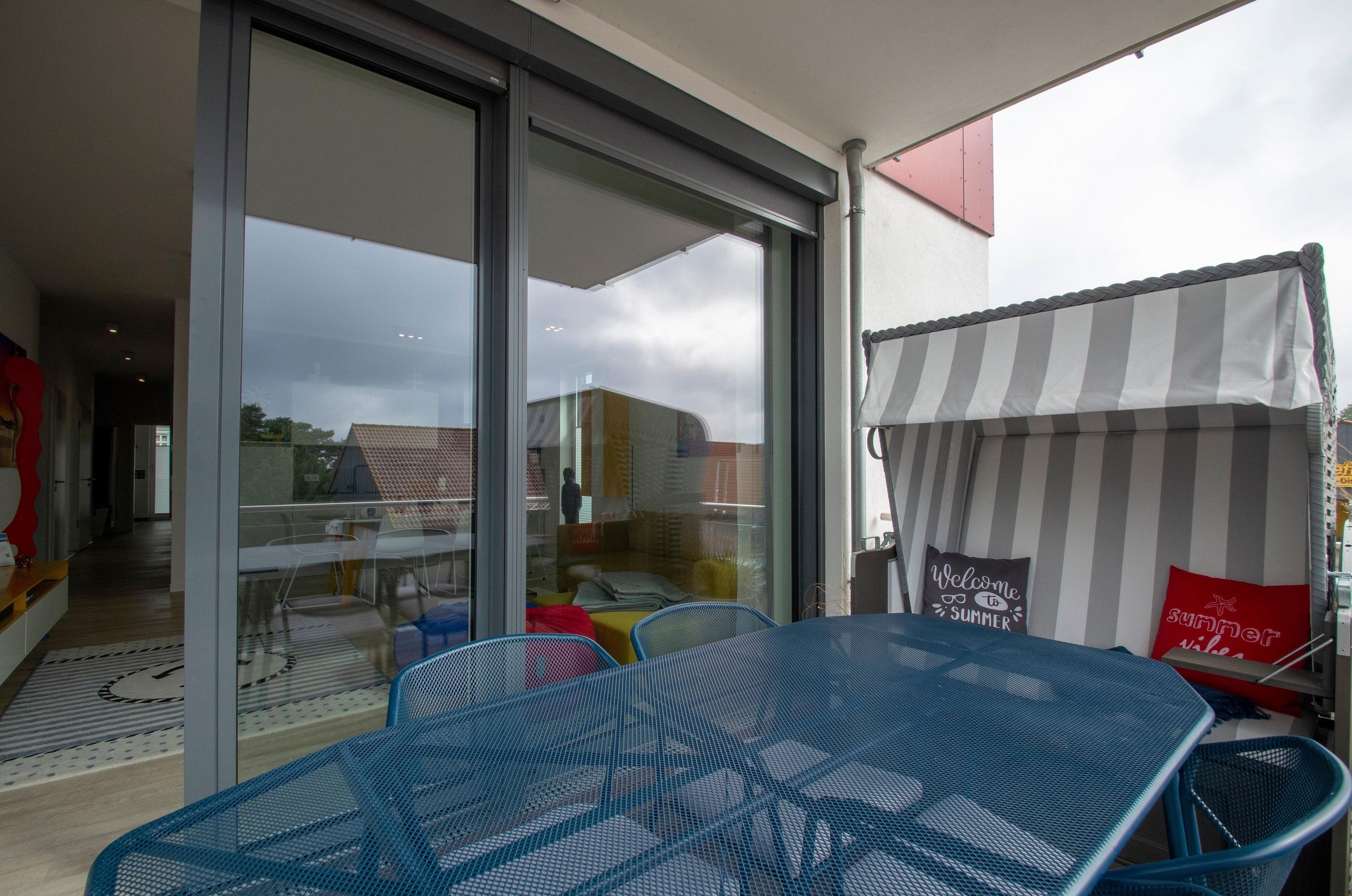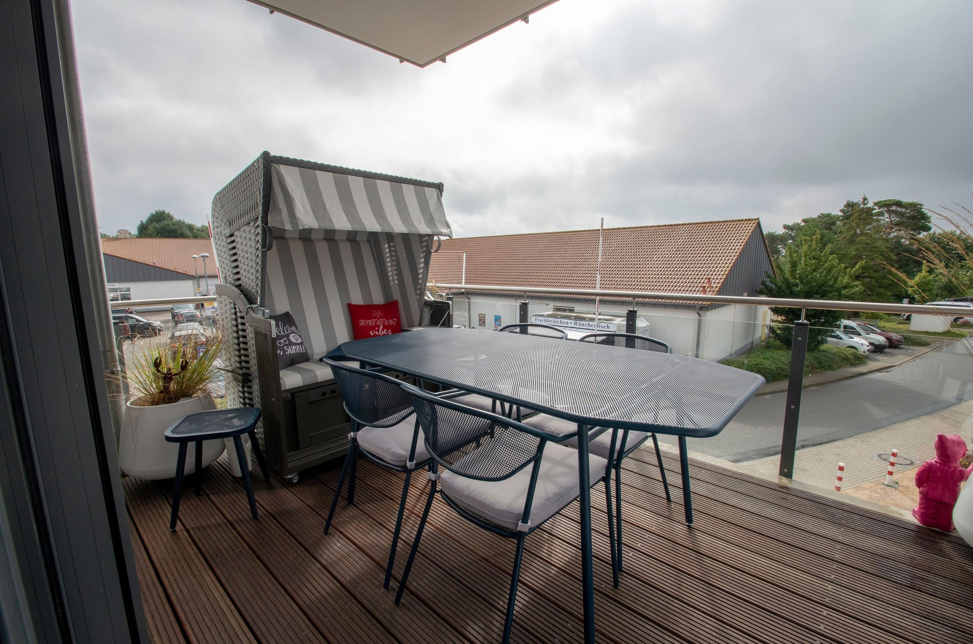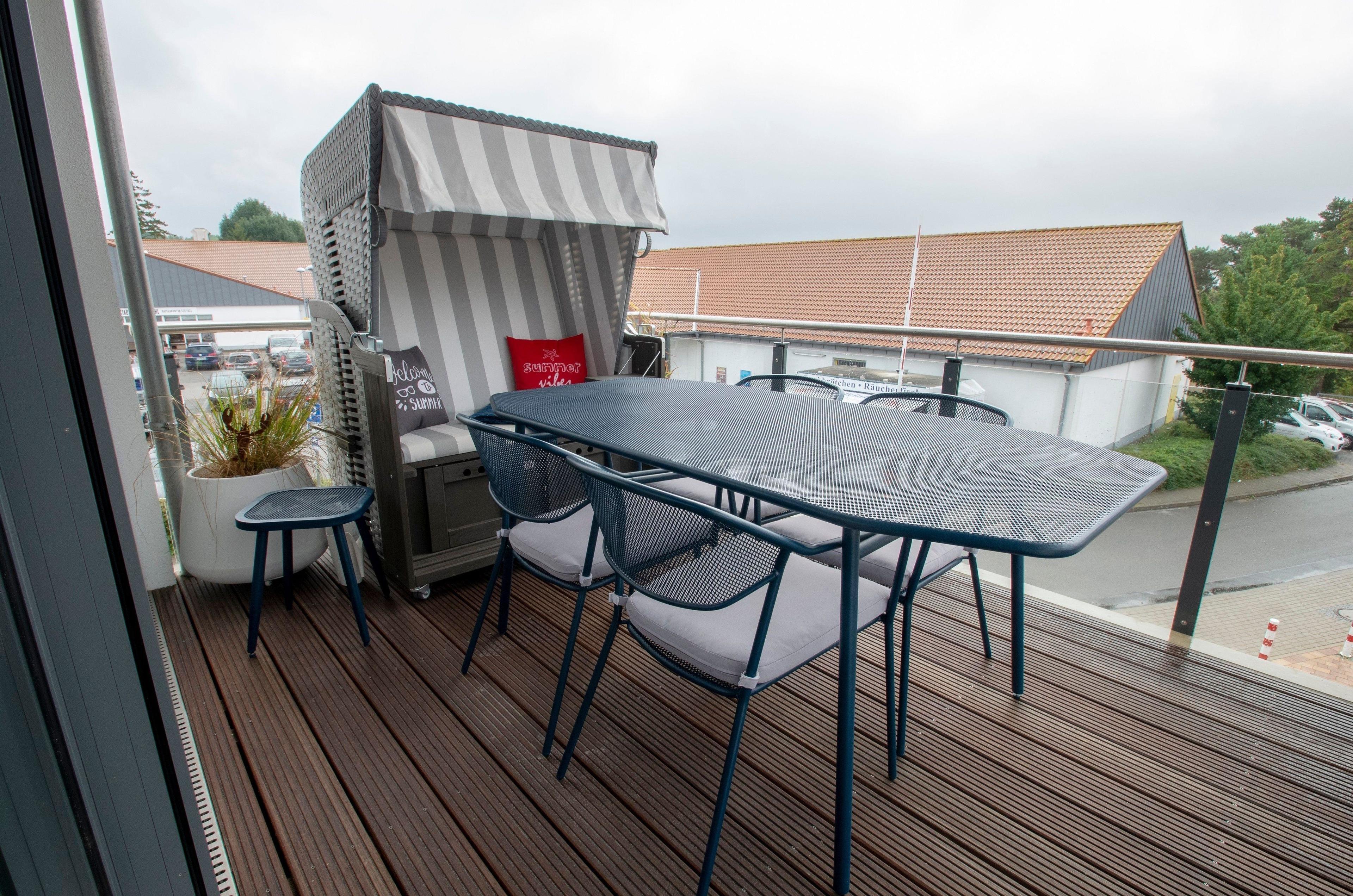 Unsere Fewo: 103 qm mit 3 Schlafzimmern, 2 Bädern, einer großen Wohnküche mit allem Drum und Dran sowie einen Sonnenbalkon mit Balkonmöbeln und einen Strandkorb warten auf bis zu 6 Personen und 2 Kinder bis 2 Jahre (Vierbeiner a. A.). In allen Räumen: WLAN, Flach-TV mit AmazonPrime, Netflix, 2 DVD-Player, 1 Soundbar, 1 Alexa, 1 NintendoWii, D+.