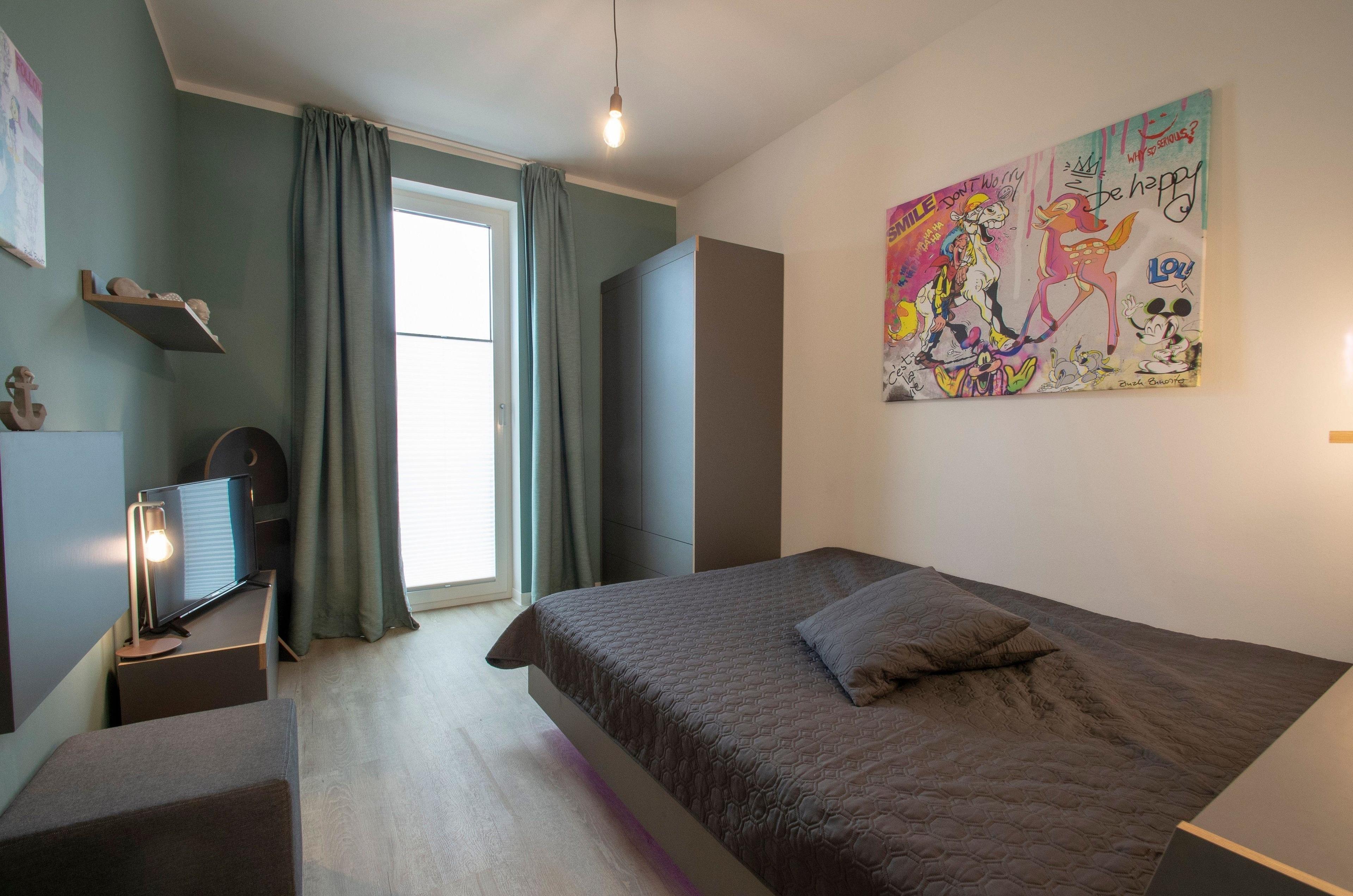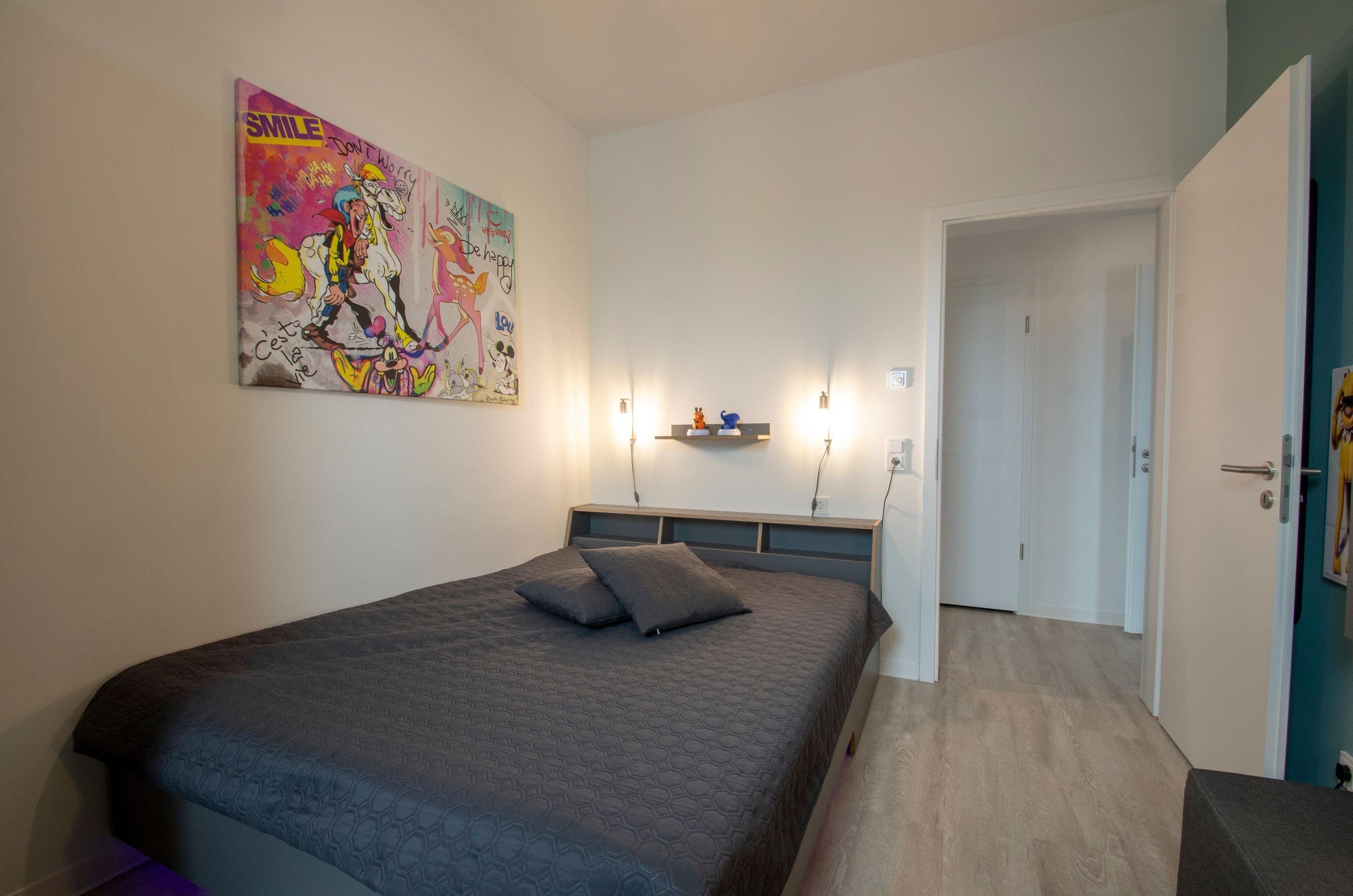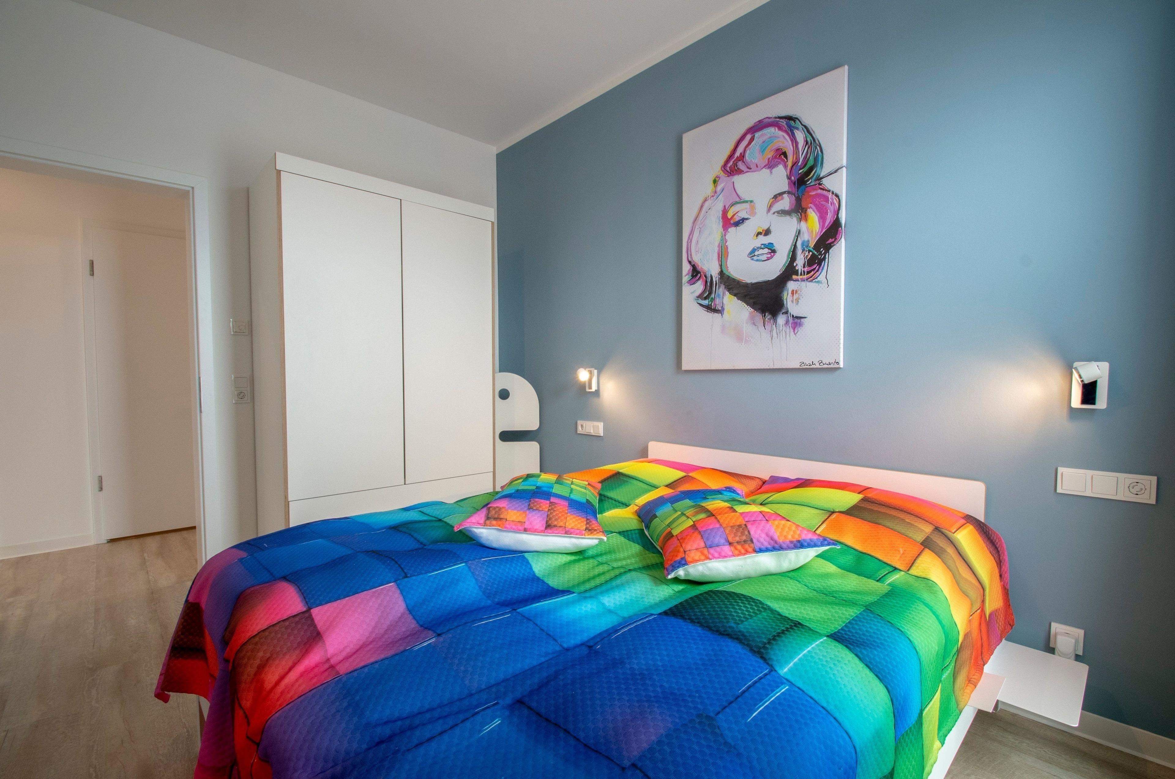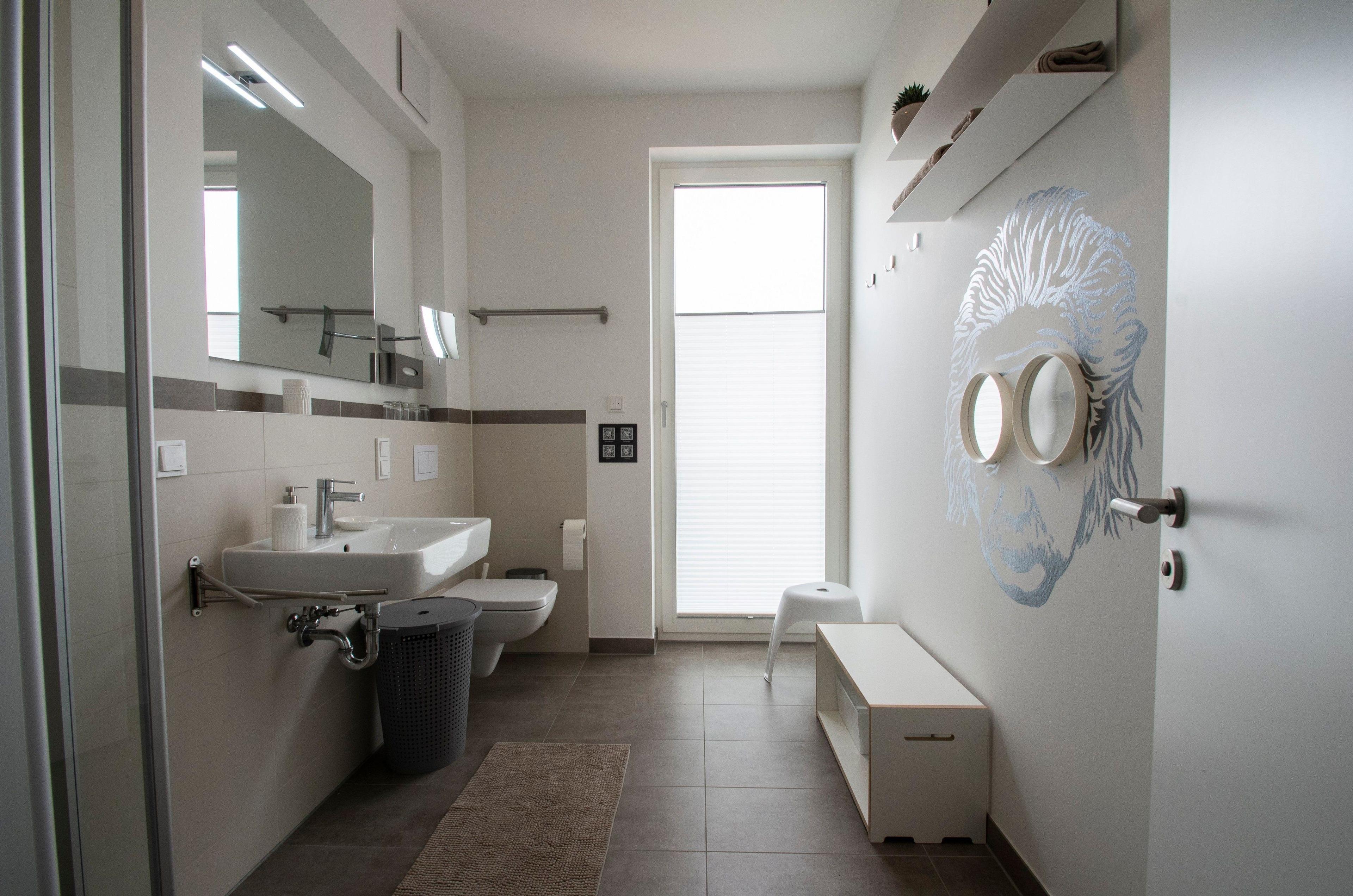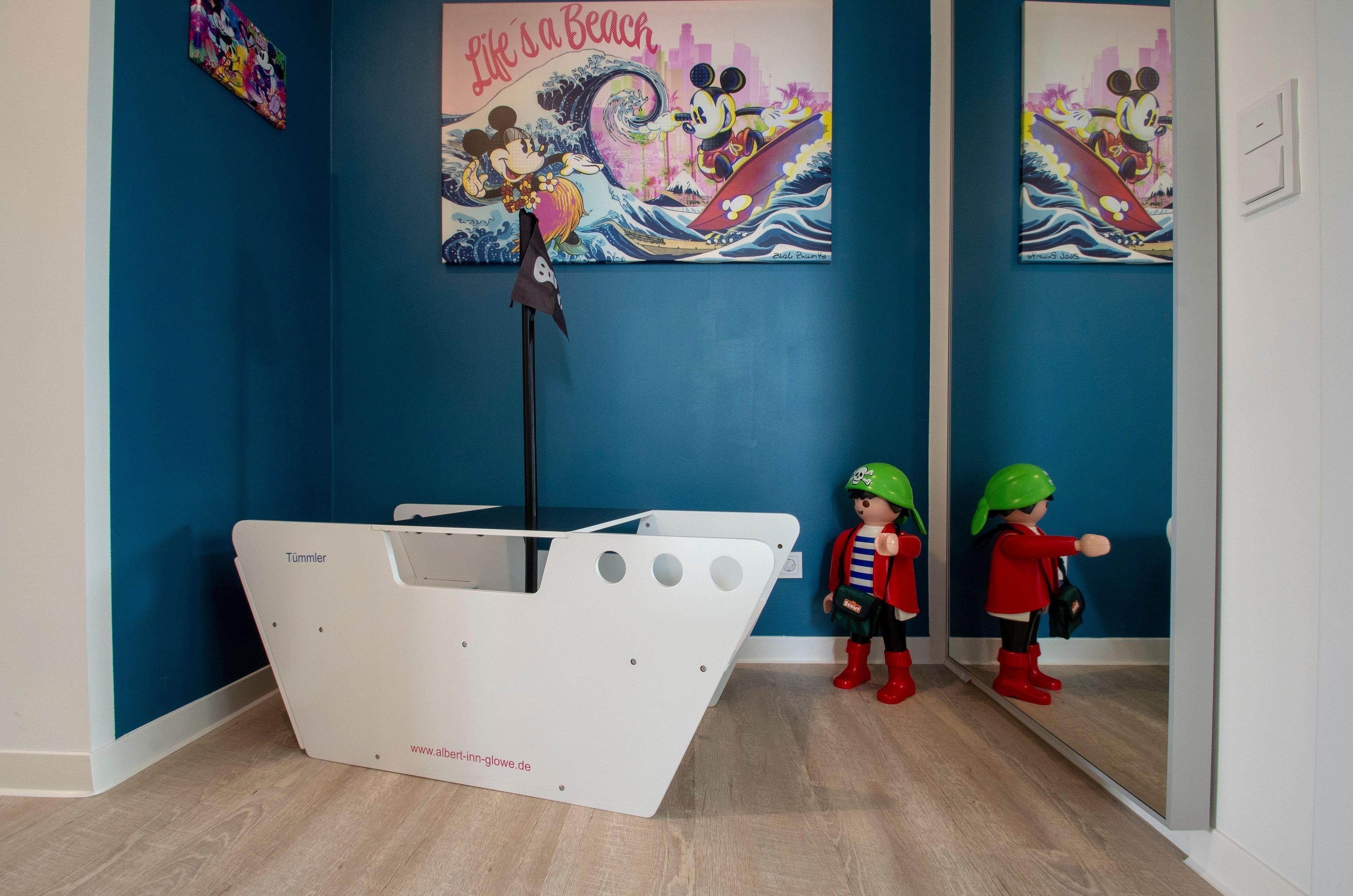 Individuell künstlerisch gestaltete lichtdurchflutete Räume, alle Fenster mit elektrischen Sonnenrollos ausgestattet. Die Betten im Albert-INN verfügen über hochwertige Matratzen und jeweils einen durchgehenden Topper für den excellenten Schlafkomfort, ganz wie zu Hause (Größe: 2 x 1,60 m und 1 x 1,80 m). Weiterer Platz für 2 Babybetten für Kinder bis 3 Jahre (kostenlos). Für die Unermüdlichen stehen im Albert-INN zwei Arbeitsplätze zur Verfügung und eine Exklusiv-Kooperation mit dem Coworking Space Lietzow. Alle Räume verfügen über ein kostenloses WLAN, Smart-TV der neusten Generation u.a. auch mit Netflix, AmazonPrime, Disney+. Das Wohnzimmer zum Chillen mit: großem Smart-TV, DVD-Player, Soundbar, Alexa, Bluetooth-Lautsprecher, NintendoWII, großem Essplatz, großem Eck-Schlafsofa (zusätzliche Schlafplätze a.A.). In der Küche finden alle Kochbegeisterten: eine Markenküche mit BOSCH-Einbaugeräten (Backofen mit Induktionskochfeld, Geschirrspüler, Mikrowelle) großen Kühlschrank mit Gefriermöglichkeit, Backutensilien, Nespresso + Milchaufschäumer, Mixer, WMF: Filterkaffeemaschine, Entsafter, Eierkocher, Wasserkocher, Smoothie-Shaker. Die beiden Bäder sind mit ebenerdigen Duschen hochwertig ausgestattet. Für die Kleinsten: Kinderspielboot und Playmobil Seeräuber warten auf große Abenteuer, Spiele, Bücher, Kleinkinderausstattung (Töpfchen, Treppchen, WC-Sitz, Hochstuhl, Kinderreisebetten mit Wickelauflage). Alle Räume mit hochwertigen Möbeln von deutschen Markenherstellern ausgestattet (Interlübke, Müllermöbel).