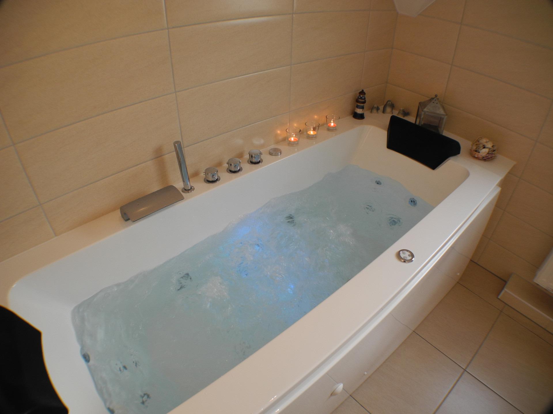 Das zweite Badezimmer finden Sie im Obergeschoss wieder. Es ist mit einer beruhigenden Whirlpool-Wanne mit Relax-Licht ausgestattet, in der Sie bei harmonischem Kerzenschein und prickelnden Champagner gemütliche Stunden verbringen können.