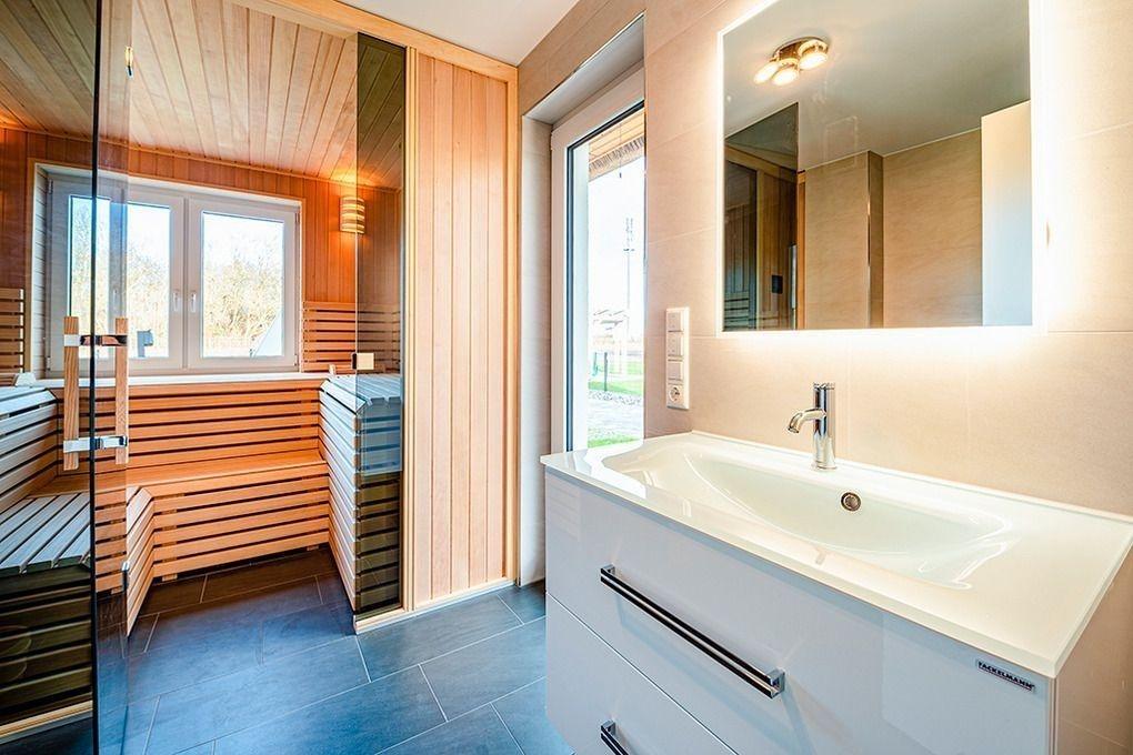 Bad mit WC, Dusche und großer Sauna (8 Personen).
