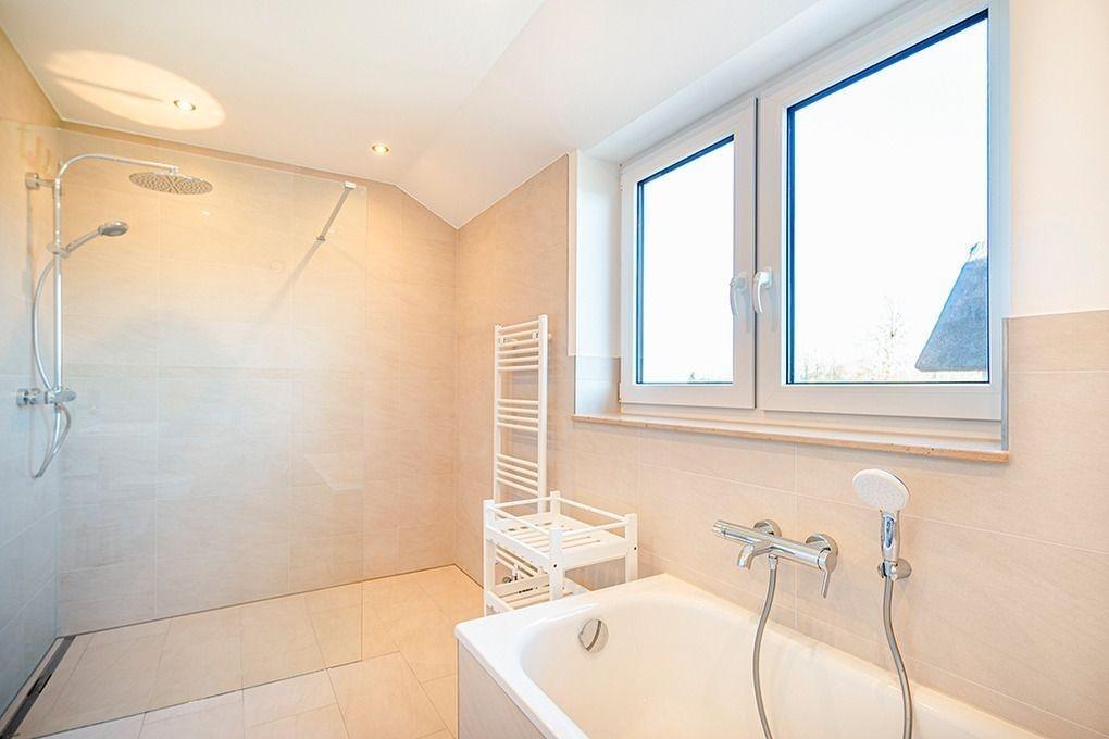 Exklusive Doppelhaushälfte für alle Jahreszeiten - Großzügiges Nichtraucher-Ferienhaus mit komfortabler Ausstattung (Reetdach, großzügigem Wohn-/ Essbereich mit Kaminofen und Sitzfenster, 3 Bäder/WCs, 1 Badewanne, Sauna und Terrasse).