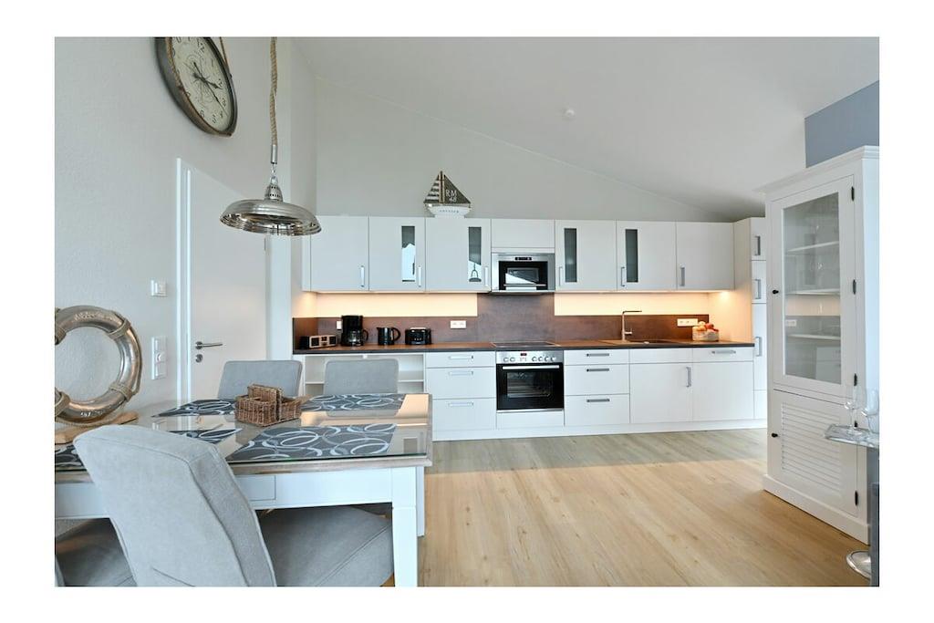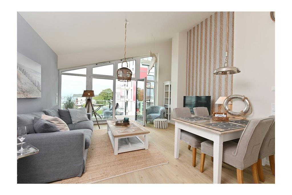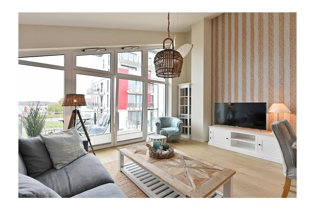 Moderner Wohn- Essbereich mit gemütlicher Couchlandschaft/ Schlaffunktion, TV/ Sat (Flatscreen), Radio, kostenfreies Internet (WLAN), Balkon mit Meerblick, Gesellschaftsspiele für gemütliche Abende, offene komplett ausgestattete Einbauküche mit 4- Plattenherd (Ceranfeld), Backofen, Kühlschrank mit großem Gefrierfach, Geschirrspüler, Mikrowelle und diversen Elektrogeräten, Schlafzimmer mit Doppelbett (Boxspringbett 180 x 200), großer Kleiderschrank und Balkonzugang, Bad mit ebenerdiger Dusche/ WC, Föhn, zwei große Balkone mit Meerblick und bequemen Gartenmöbeln “Herzlich willkommen in der neuen und schönen Ferienwohnung „Ankerplatz am Boddenmarkt” Die Ferienwohnung ist komfortabel und modern eingerichtet. Der feinsandige Badestrand der Ostsee ist nur 200 Meter entfernt. Die Ferienwohnung hat zwei separate Balkone (Wohnzimmer und Schlafzimmer) mit Meerblick und lädt zum Verweilen ein. Der „Ankerplatz Am Boddenmarkt“ ist eine Nichtraucherwohnung. Für die kleinen Gäste steht ein Kinderstuhl und ein Kinderreisebett zur Verfügung. Alle Fenster sind mit Sonnen und Insektenschutz ausgestattet. Sauna kostenfrei, Waschmaschine und Wäschetrockner befinden sich im Erdgeschoss vom Objekt (Gebühr 3,- pro Nutzung). Abstellmöglichkeiten (abschließbar) für Fahrräder sind vorhanden. Einkaufsmöglichkeiten, Bäcker, Restaurants und ein Getränkemarkt finden Sie in unmittelbarer Nähe. Es gibt einen eigenen ausgeschriebenen PKW-Stellplatz. Optimale Rad- und Wandermöglichkeiten um die Insel zu erkunden, runden das Angebot ab. Haustiere mit Rücksicht auf Allergiker sind leider nicht gestattet!