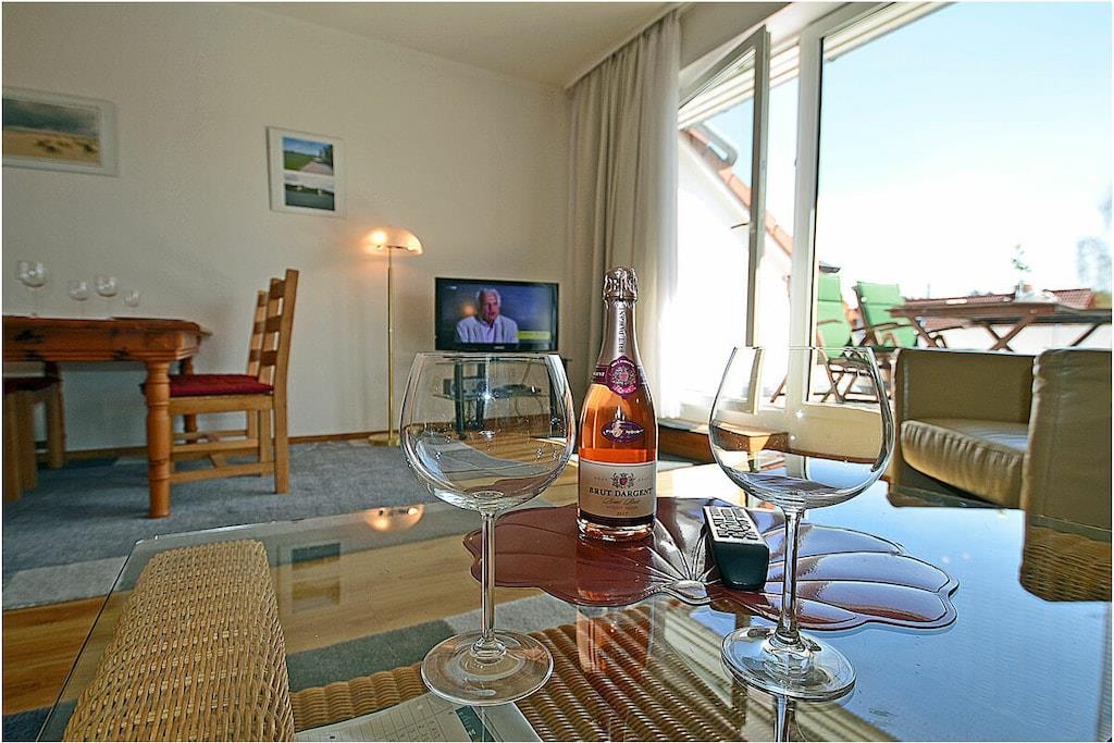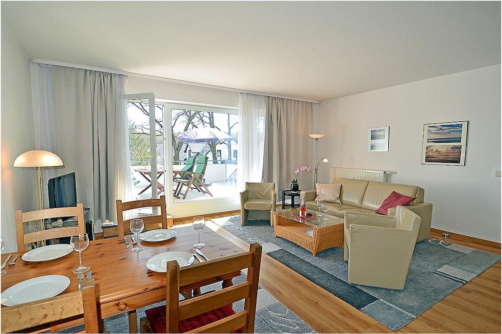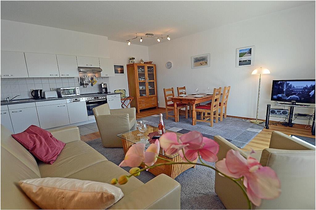 “Herzlich willkommen im Appartementhaus „Haus Glowe” mit 21 Wohneinheiten. Die Ferienwohnung „Seemöwe“ ist modern eingerichtet. Der feinsandige Badestrand ist nur 250 m entfernt. Der große Südbalkon mit elektrischer Fensterjalousie ist 18 m² und lädt zum Verweilen ein. Die „Seemöwe“ ist eine Nichtraucherwohnung. Alle Fenster sind mit Jalousien ausgestattet. Waschmaschine und Wäschetrockner befinden sich im Objekt/ Dachboden (Gebühr 2,- pro Nutzung). Der PKW-Stellplatz ist direkt am Objekt mit der Nr. 17. Einkaufsmöglichkeiten, Bäcker und Restaurants sind in unmittelbarer Nähe. Es gibt optimale Rad- und Wandermöglichkeiten um die Insel zu erkunden. Haustiere nach Absprache (Gebühr Euro 5,-/ pro Haustier/ pro Nacht) Goßzügiger Wohn- Essbereich mit gemütlicher Couchlandschaft, TV/ Sat (Flatscreen), DVD-Player, Radio/ CD und Blu-ray Player, Bücher und Gesellschaftsspiele für gemütliche Abende, offene komplett ausgestattete Einbauküche mit diversen Elektrogeräten, 4- Plattenherd (Ceranfeld), Backofen, Kühlschrank, Geschirrspüler, Mikrowelle und diversen Elektrogeräten, 1. Schlafzimmer mit Doppelbett ( 2 Matratzen je 90 x 200), TV/ Sat, gemütlicher Sessel und Kleiderschrank, 2. Schlafzimmer mit zwei Einzelbetten (90 x 200) und Kleiderschrank, Bad mit Dusche/ WC, Fön, großer Balkon mit Gartenmöbeln und Sonnenschirm.