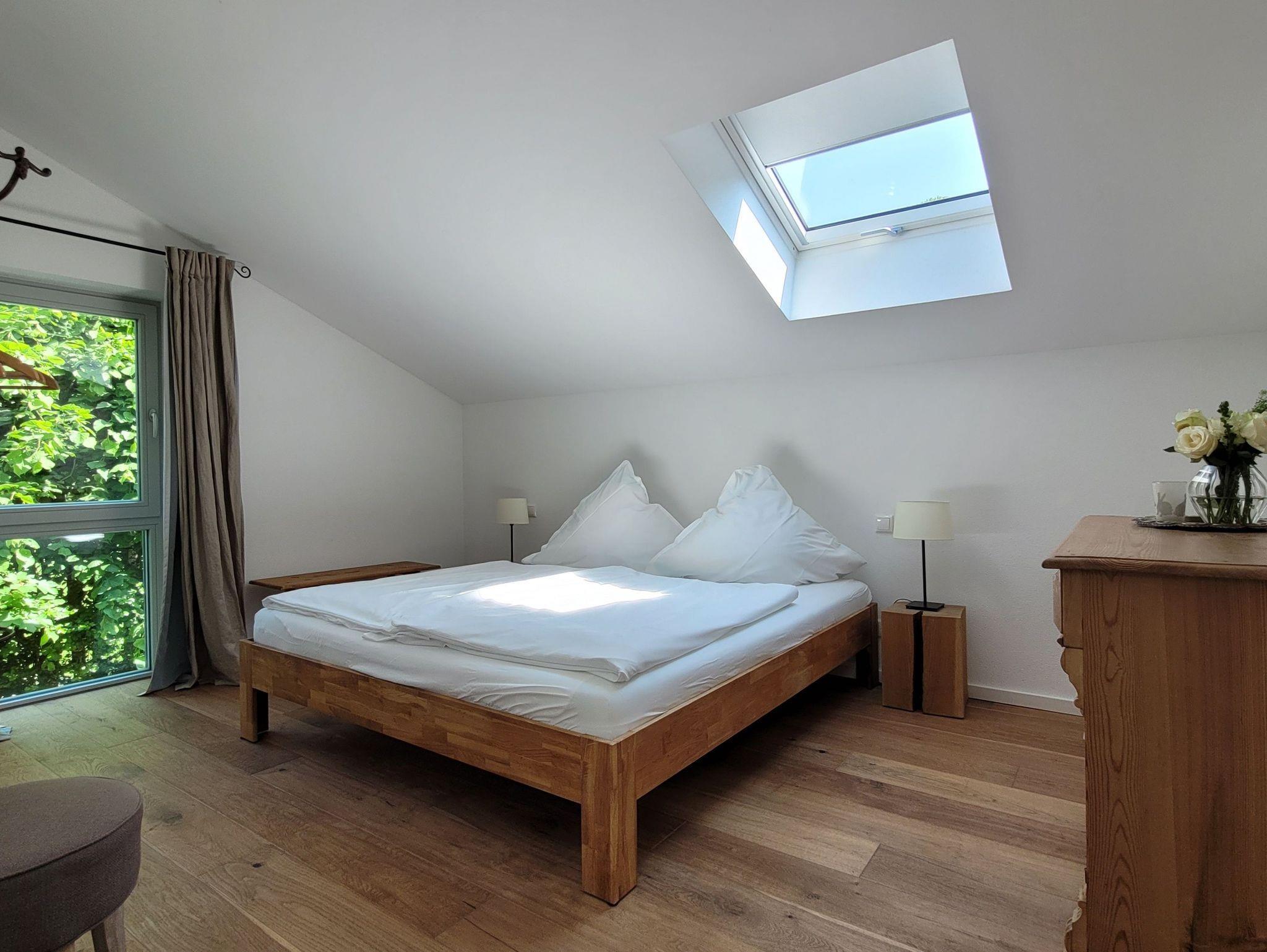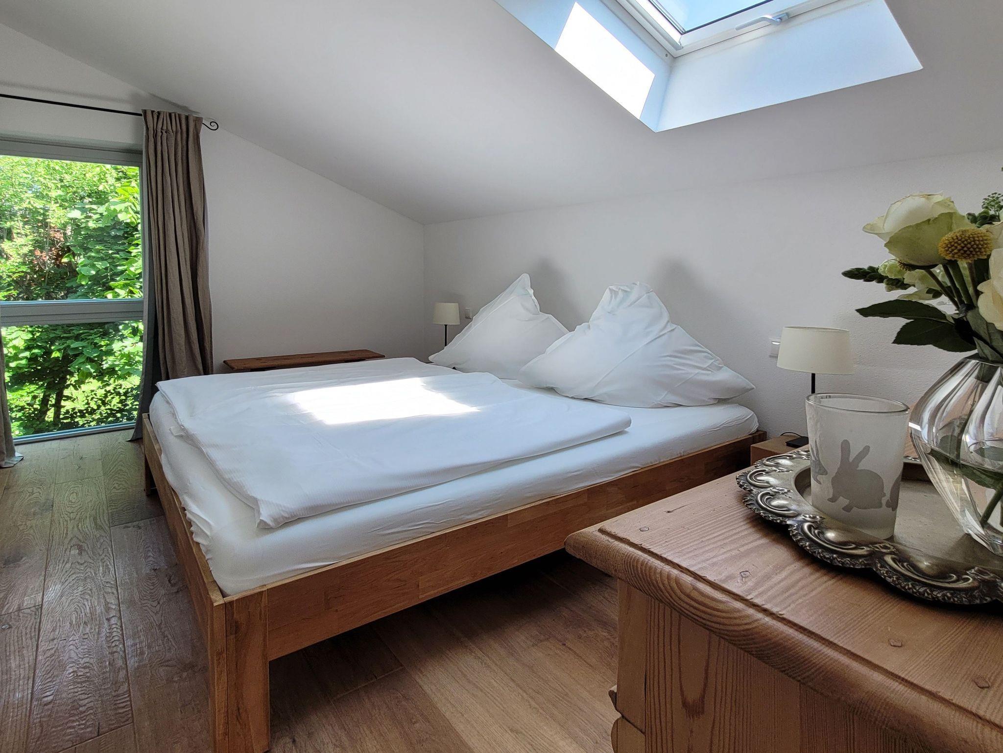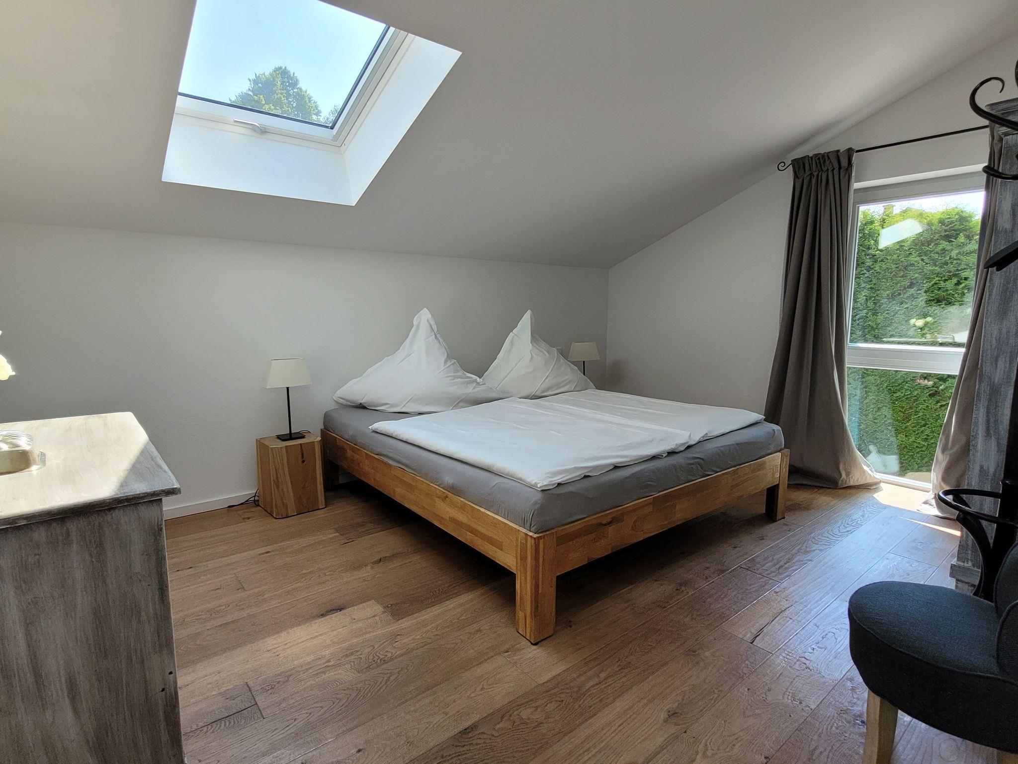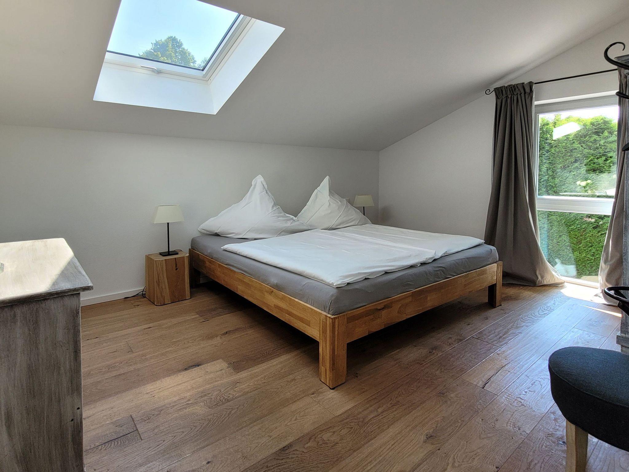 2 abgetrennte Schlafräume mit je einem Doppelbett (2,00 m x 1,80 m), jeweils große Fenster zur Ost- bzw. Westseite mit Blick in den Garten plus je ein Dachfenster