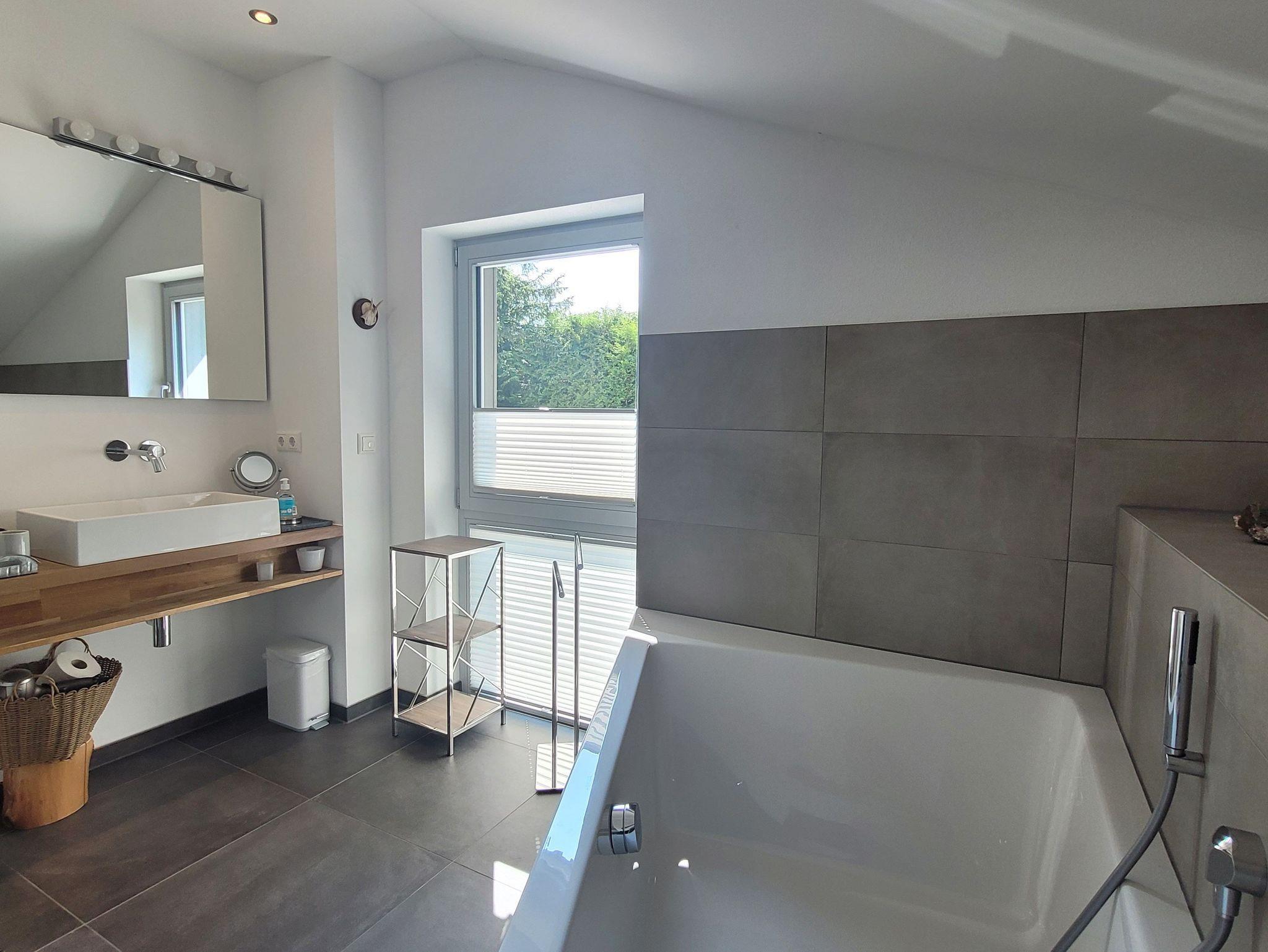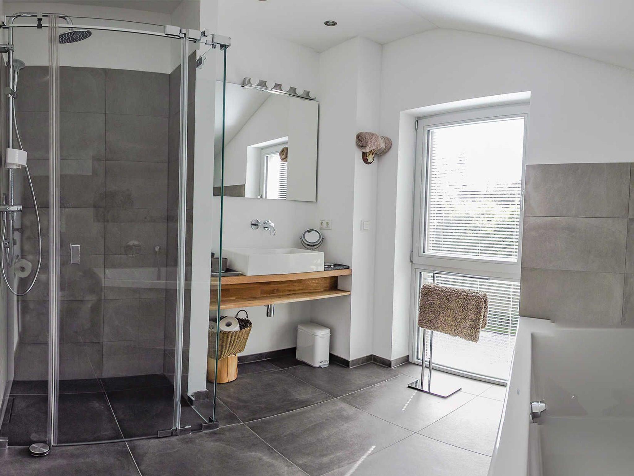Bad mit (bodenebener) Dusche, Fenster, Badewanne und WC, Waschtisch, Haartrockner, Kosmetikspiegel