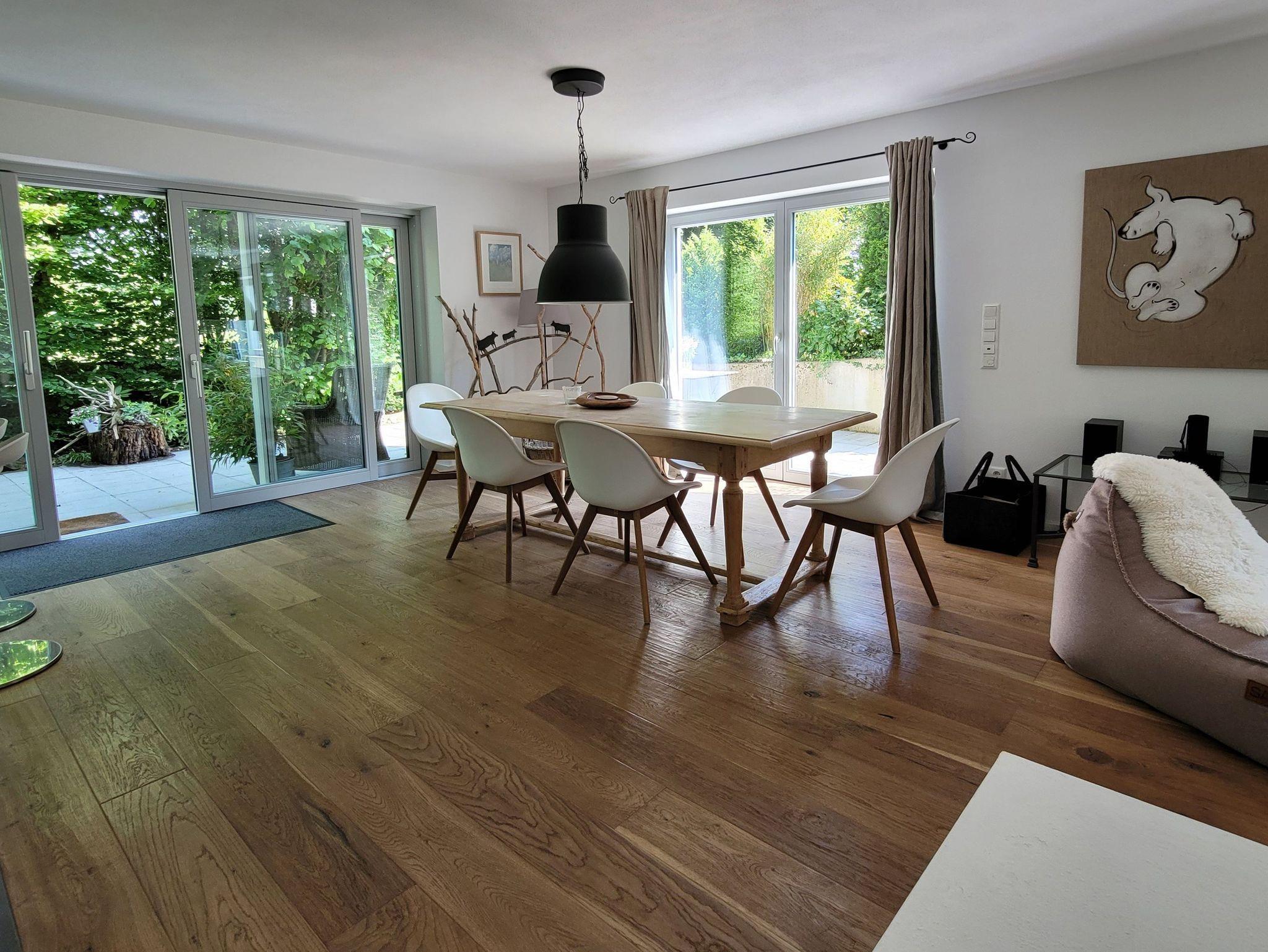 Von hier aus gelangt man durch großzügige Glastüren auf die Süd- und Ostterrasse sowie auch in den angrenzenden Garten, ausgestattet mit Essplatz und sonstigen Sitz- und Liegemöbeln.