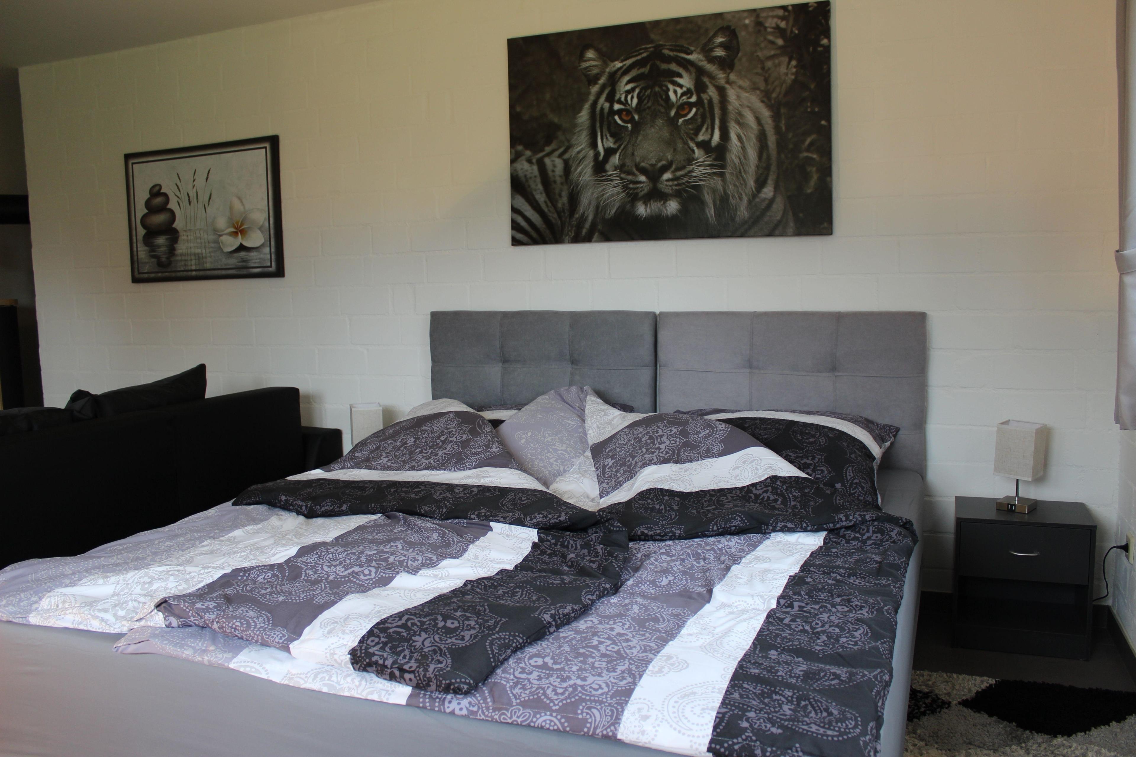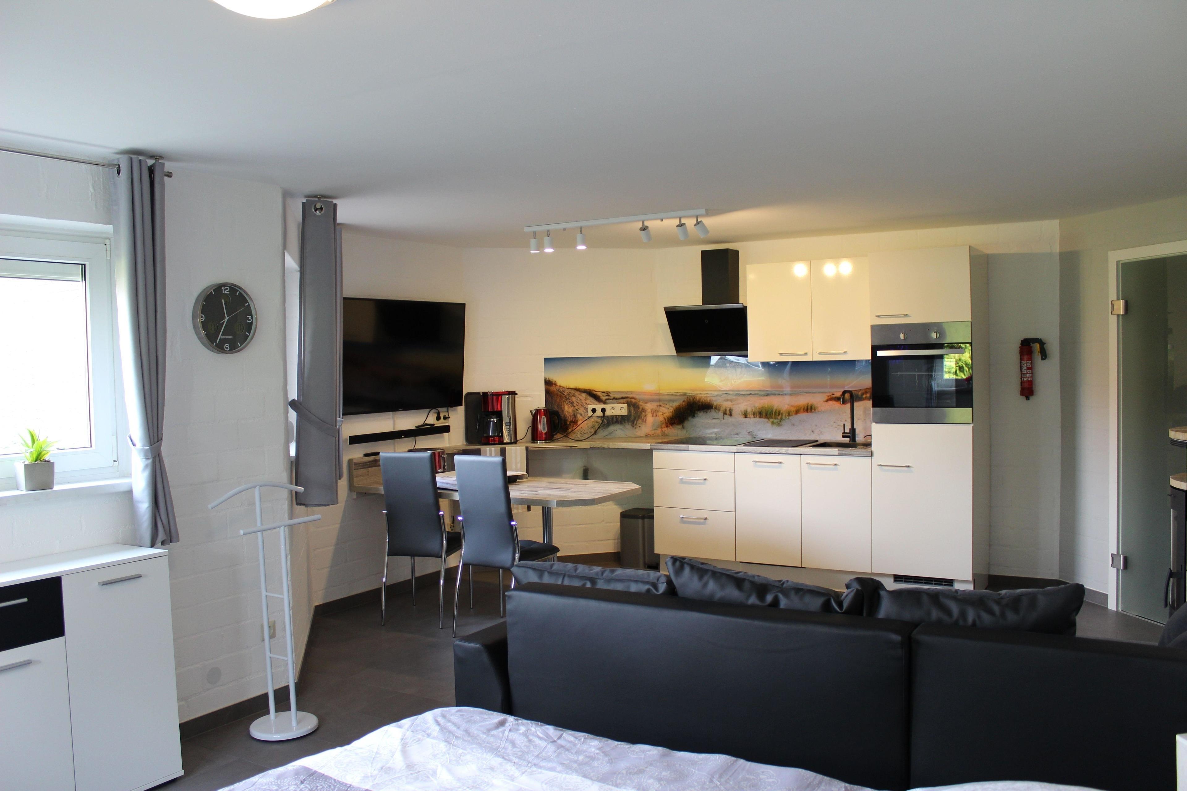 Ein Zimmer mit Doppelbett, Küchenzeile und Sofa.