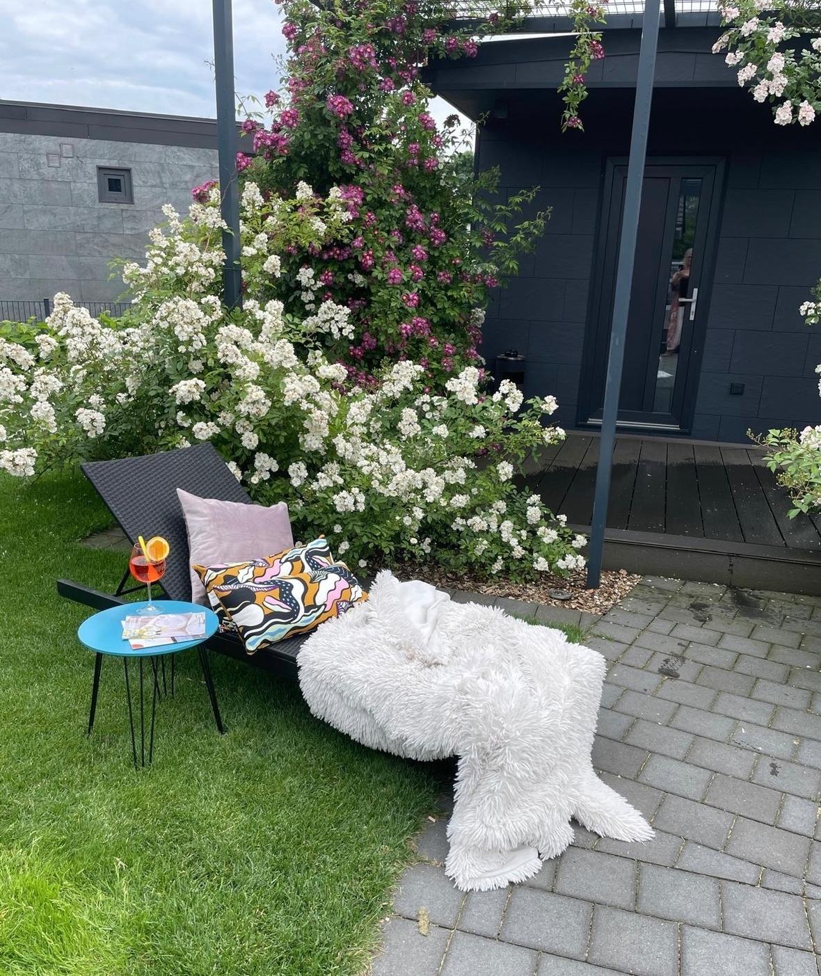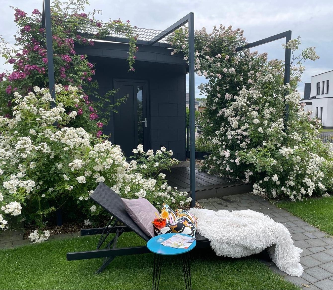 Auf dem 440 m² großen und umzäunten Grundstück befinden sich zwei PKW-Stellplätze, ein Gartenhaus, die überdachte Süd-Terrasse mit Grillplatz und Sonnenschirm sowie eine große an einen Weiher angrenzende Rasenfläche mit Gartenhaus.