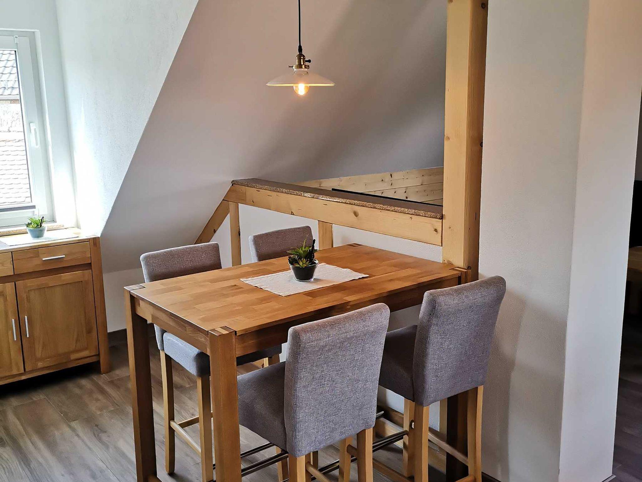 Das Ferienapartment im Dachgeschoss für bis zu 7 Personen verfügt über 3 Schlafzimmer mit Fernseher, 2 Bäder 1 Sauna und eine große Wohnküche und Fußbodenheizung. Von der Küche aus gelangen Sie direkt auf den Balkon.