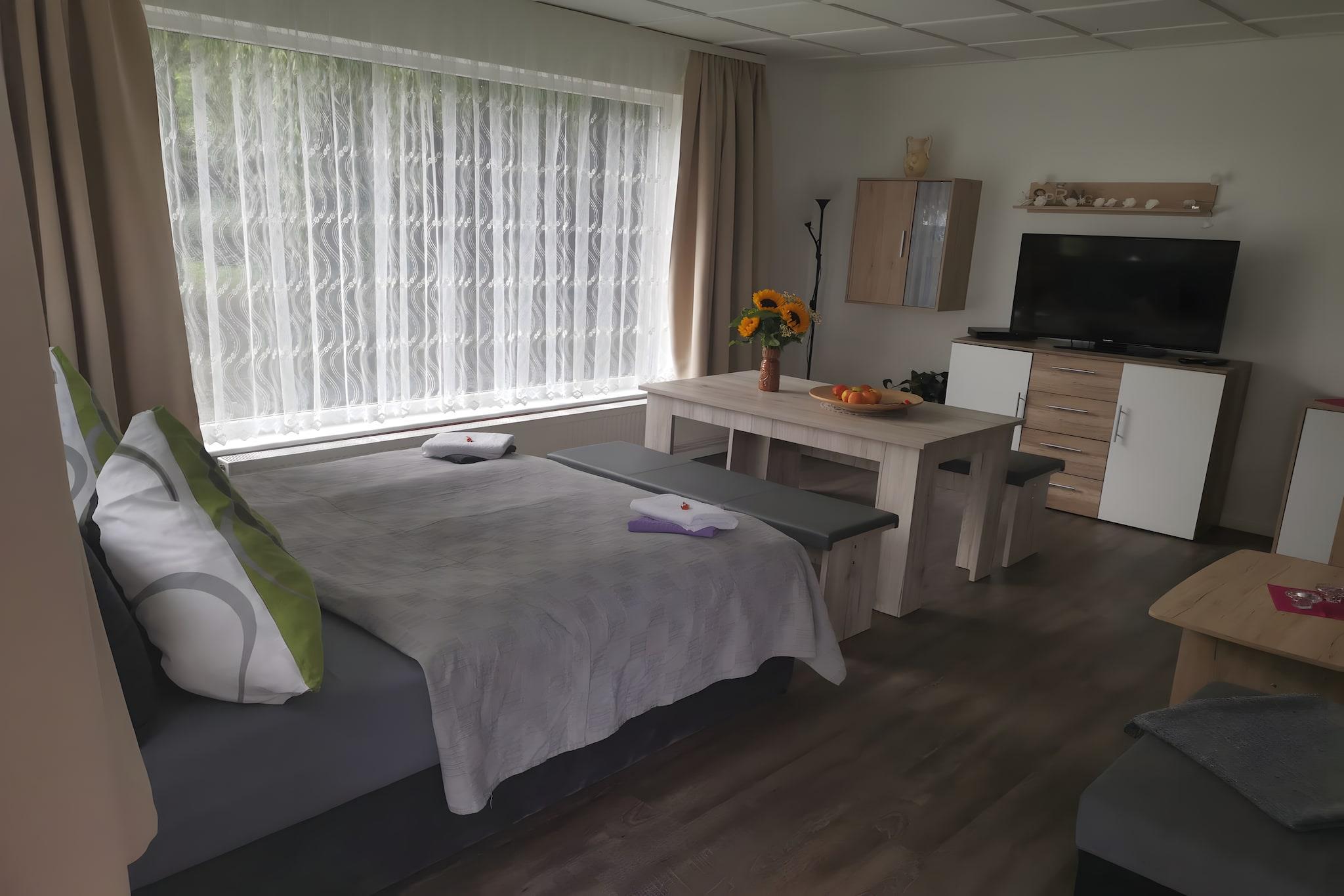 Kun 50 meter fra Goldbergs glitrende sø og badestrand er dette rummelige opholdssted i stueetagen en drøm for familier eller grupper, der søger udendørs eventyr og afslappet ophold. Indenfor gør et stort køkken med spisebord og alle faciliteter (kaffemaskine, ovn, mikroovn) hjemmelavede måltider til en leg. Den hyggelige stue/soveværelse byder på en dobbeltseng og sovesofa, satellit-tv og en ekstra spiseplads. Sovearrangementer er alsidige: en 3-personers køjeseng (70 × 160 cm) til små eventyrere, plus et separat soveværelse med dobbeltseng til voksne. Badeværelset er udstyret med brusekabine, hårtørrer og alt det nødvendige, mens en børneseng tilføjer ekstra bekvemmelighed for unge gæster. Med terrasse, have, grill og vaskemaskine mod betaling, vil du være udstyret til længere ophold. Prøv fiskeri eller vandsport kun få skridt væk (100 m), køb dagligvarer på Aldi eller REWE, eller nyd en spisning ved søen inden for 50 m. Nærliggende attraktioner såsom Dobbertiner-søen (1 km) og lokale caféer (1 km) afrunder en godt forbundet, men alligevel rolig flugt.