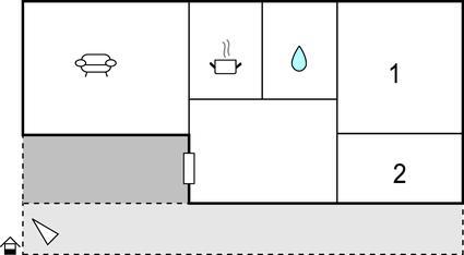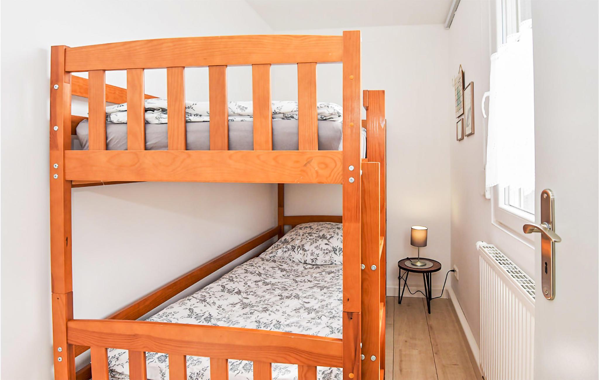 Alle andre værelser i huset er på et niveau. En central gang fører til de to soveværelser med en dobbeltseng og køjesenge samt et køkken og badeværelse.
