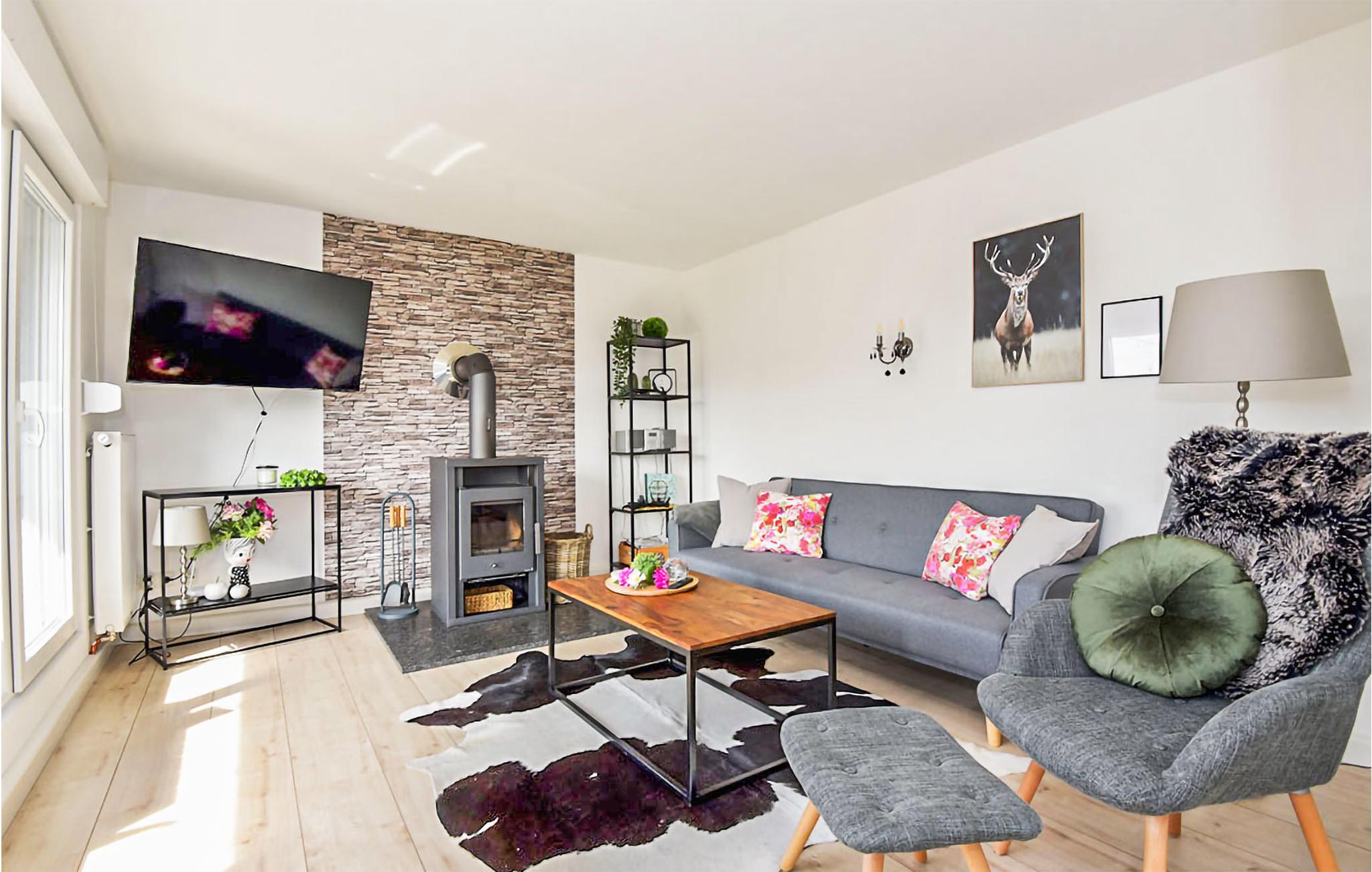 Feriehuset har en moderne pejs. Dette skaber en hyggelig atmosfære i hele huset. I den stilfuldt indrettede stue kan I gøre jer det komfortabelt i sofaen og slappe af foran fladskærms-tv'et.