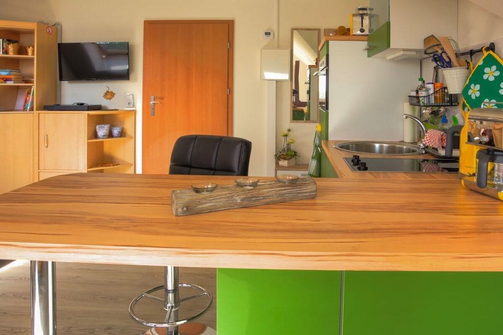 Kuschelkoje-lejligheden er også ideel til en ferie for to eller en ung familie med en baby. Lejligheden på 28 m² har alt, hvad du behøver for et behageligt ophold: en hyggelig læsekrog, et køkken med komfur, køleskab og multifunktionel mikrobølgeovn. Et lyst badeværelse med bruser fuldender Kuschelkoje.