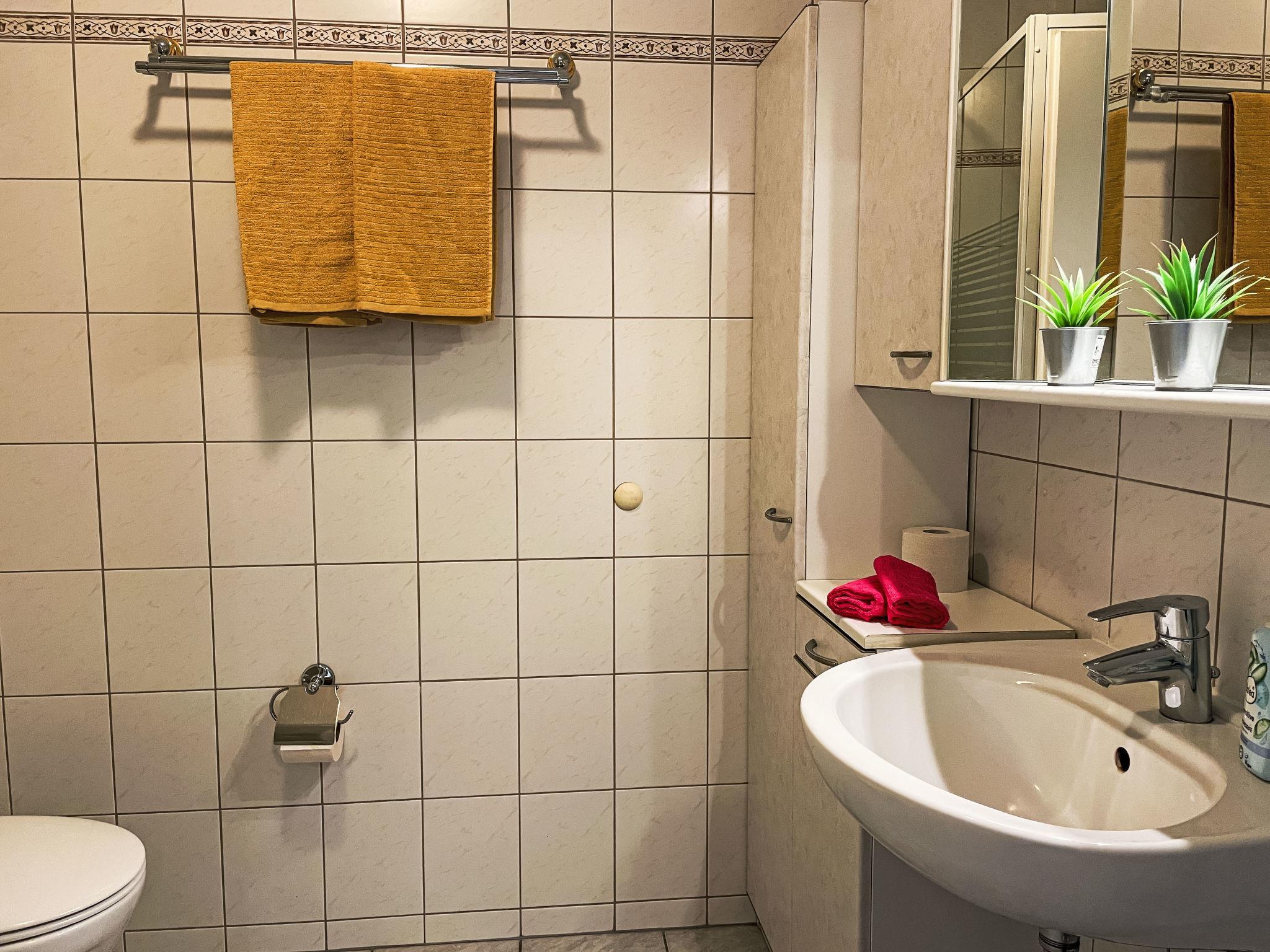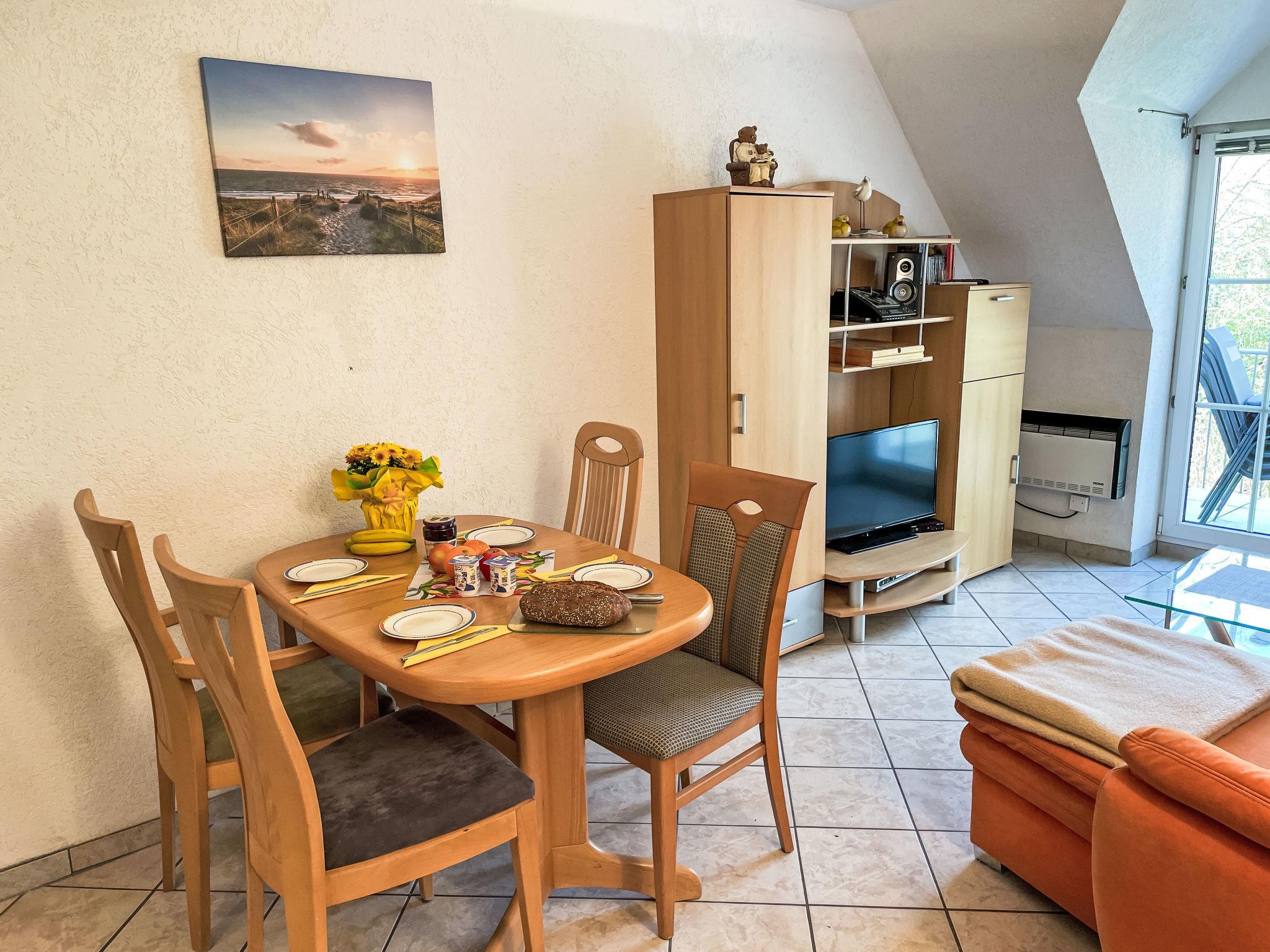 3-room apartment 46 m2 on 1st floor. Partly with sloping ceilings: living/dining room with satellite TV (flat screen), CD-player. Exit to the balcony. 1 room with 1 double bed (180 cm, length 200 cm). 1 children's room with 1 bed (80 cm, length 200 cm), 1 sleeping facility (90 cm, length 200 cm). Kitchenette (oven, dishwasher, 4 ceramic glass hob hotplates, toaster, kettle, electric coffee machine). Shower/WC. Electric heating. Small balcony 5 m2, south facing position. Balcony furniture. Facilities: Internet (WiFi, free). Please note: non-smokers only. Maximum 1 pet/ dog allowed. Smoke alarm. The sleeping possibility in the nursery is a pull-out bed (tandem bed).