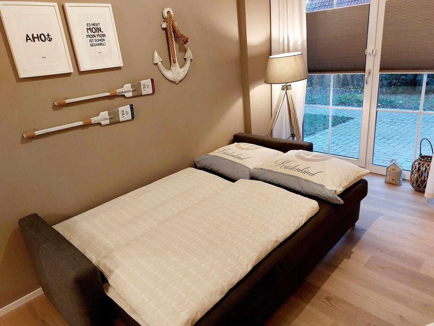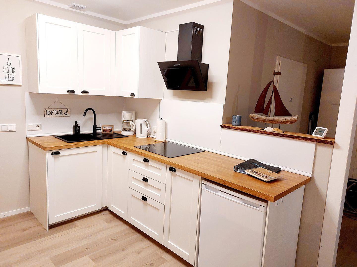 Das helle maritim eingerichtete Wohn- und Esszimmer verfügt über ein gemütliches Sofa, dass bequem zu einem Schlafplatz für zwei Personen umfunktioniert werden kann, ein TV-Gerät, einen Elektrokamin und einen Esstisch. Die moderne Küchenzeile ist in den Raum integriert und unter anderem mit Kühlschrank mit Gefrierfach, Herd, Wasserkocher, Kaffeemaschine und Toaster ausgestattet.