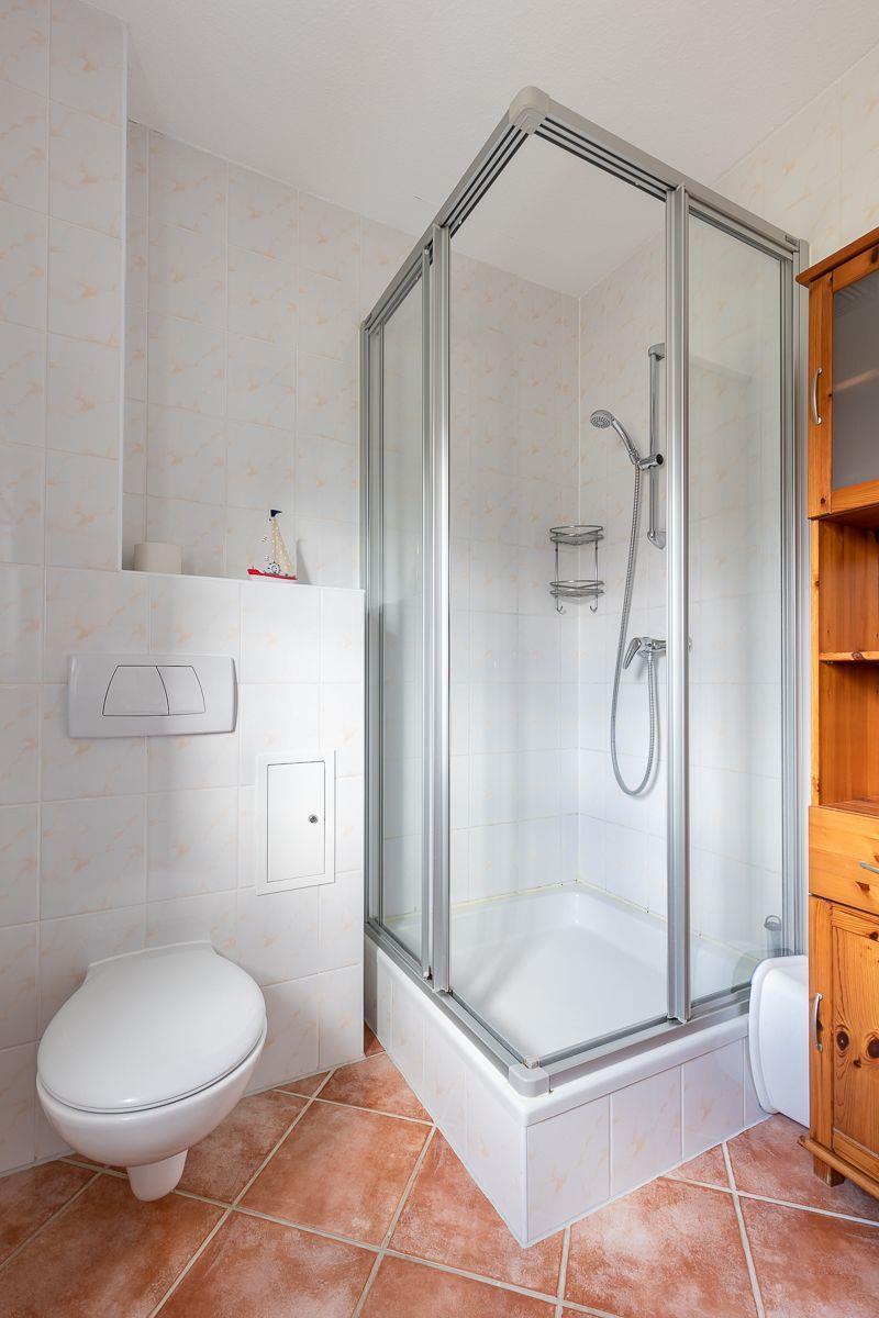 Das Badezimmer mit Dusche, Fenster, Waschtisch, Föhn und WC runden die schöne Ausstattung der Wohnung ab.