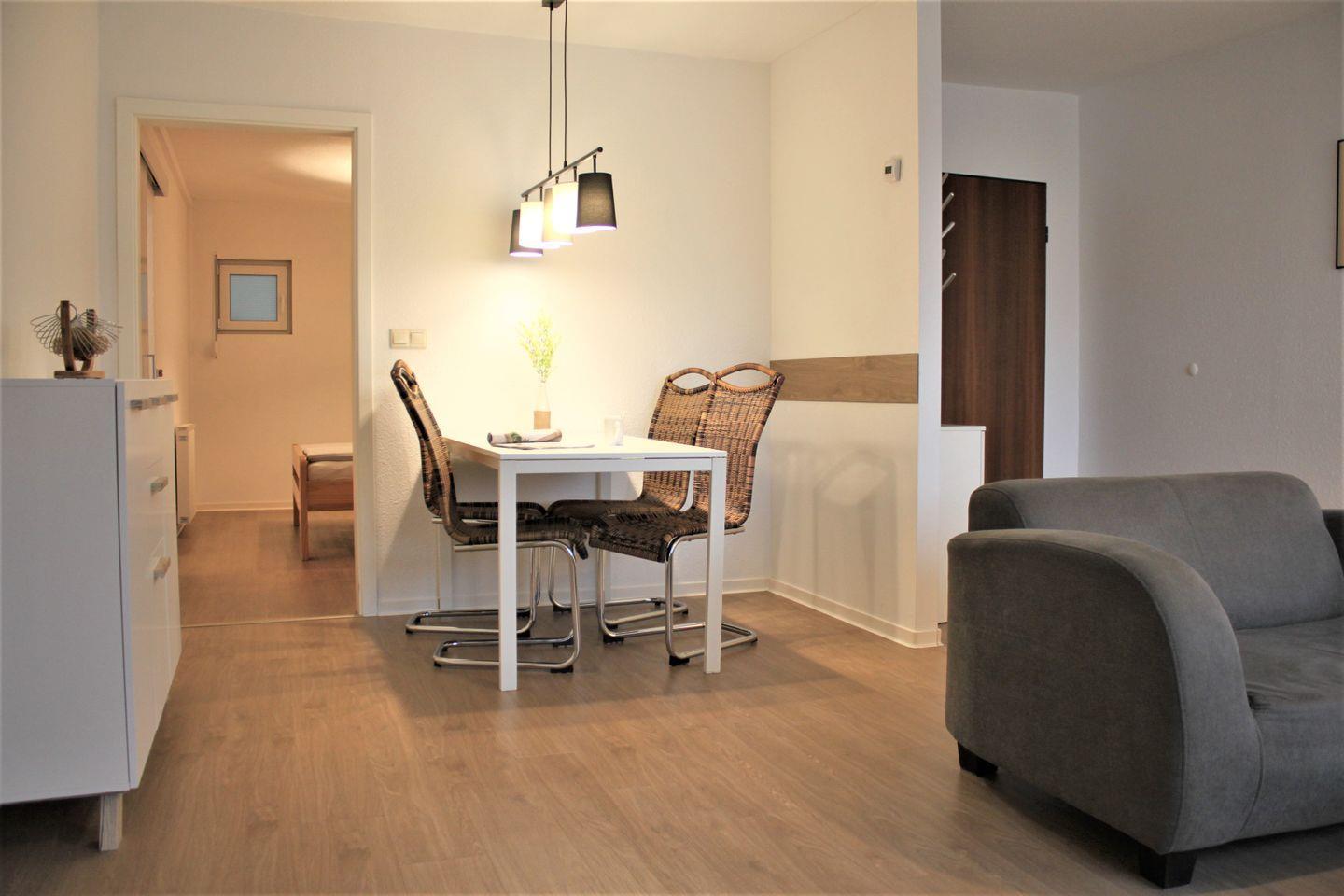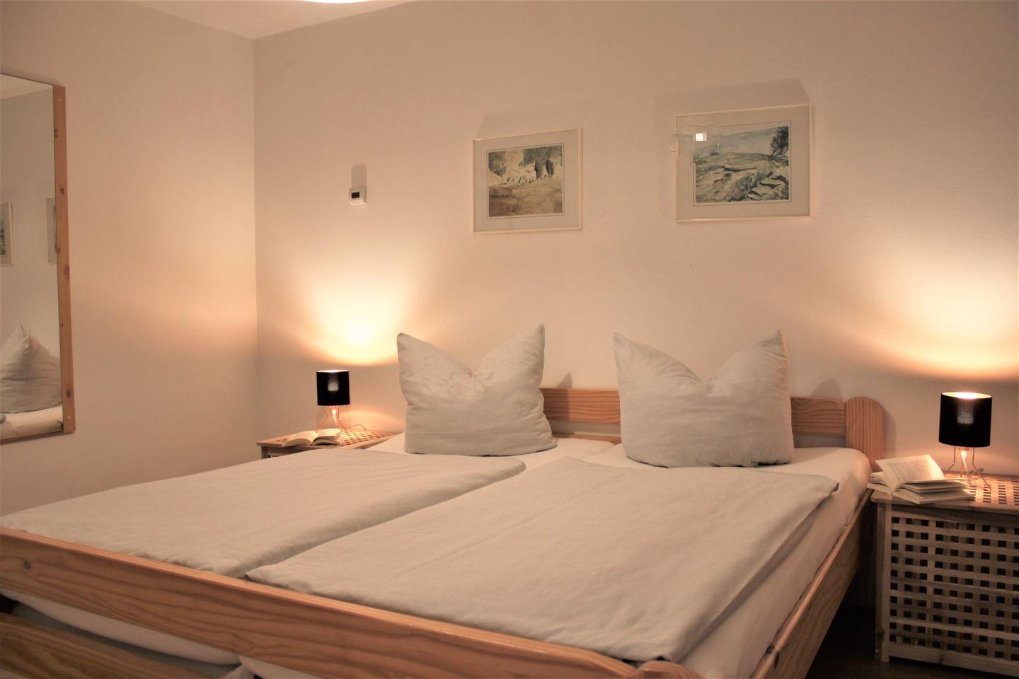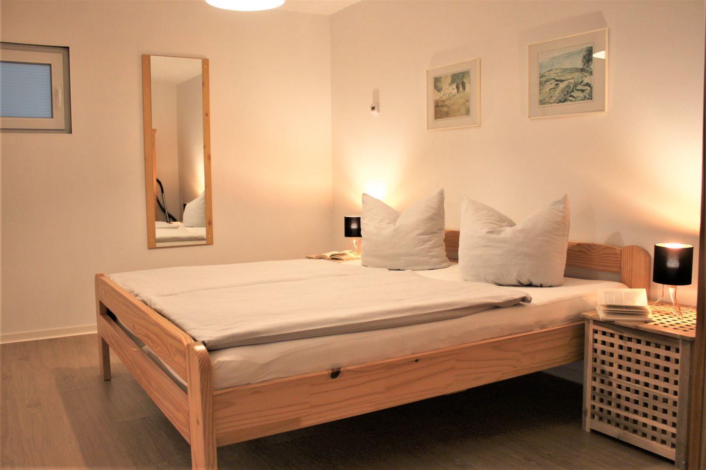 Das Wohnzimmer bietet eine gemütliche Sofaecke mit TV-Gerät, WLAN und Esstisch und lädt zum Entspannen ein. Die zwei separaten Schlafzimmer sind entweder mit einem Doppelbett oder Etagenbett und jeweils Stauraum für die Garderobe möbliert und ermöglichen erholsame Nächte. Die kleine Küche mit Fenster ist separat und verfügt über eine gute Ausstattung, die eine Selbstverpflegung ermöglicht. Das innenliegende Badezimmer ist mit einer Dusche, Waschtisch und WC ausgestattet. Ein zusätzliches Gäste-WC verfügt über ein WC, Waschbecken und Fenster.