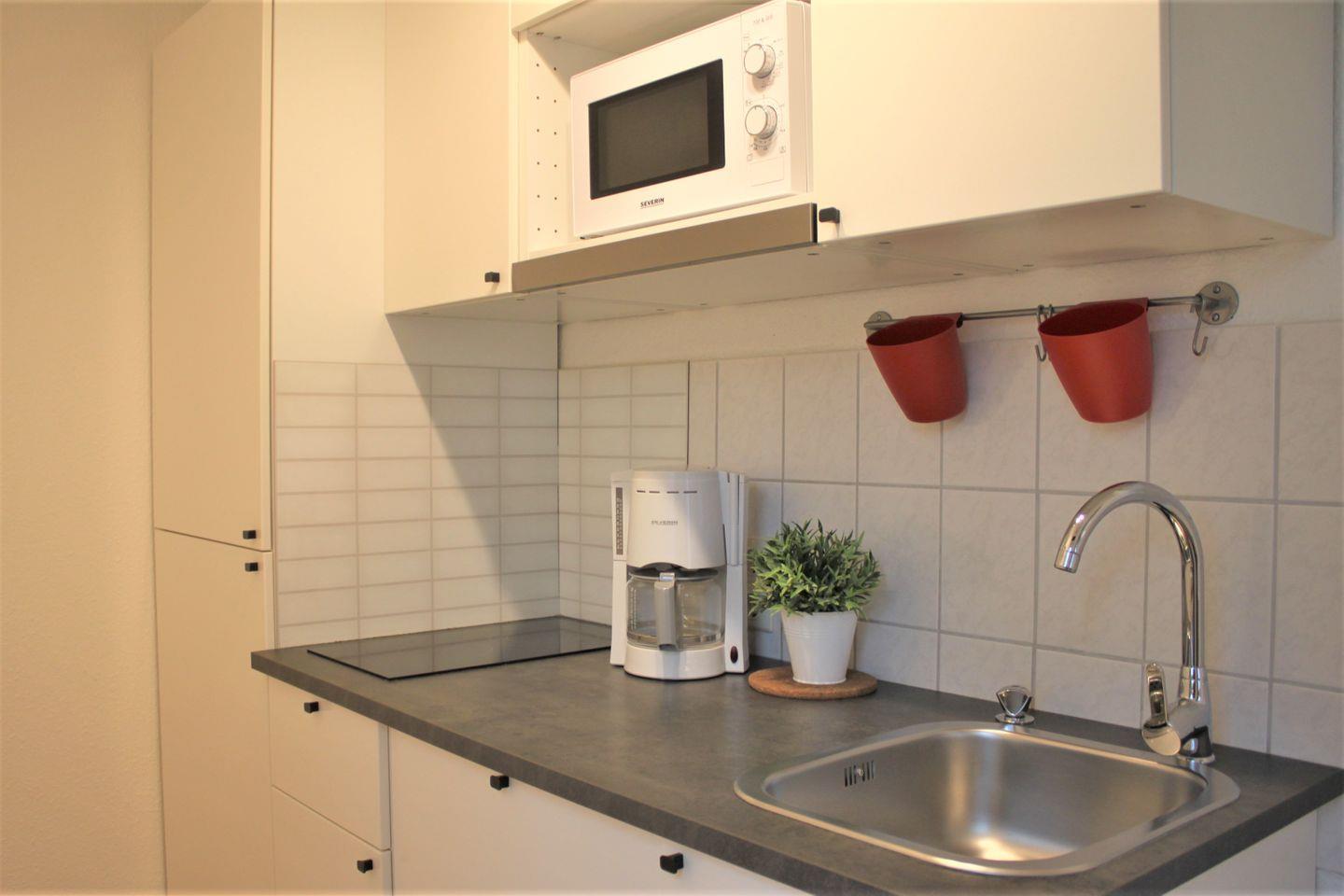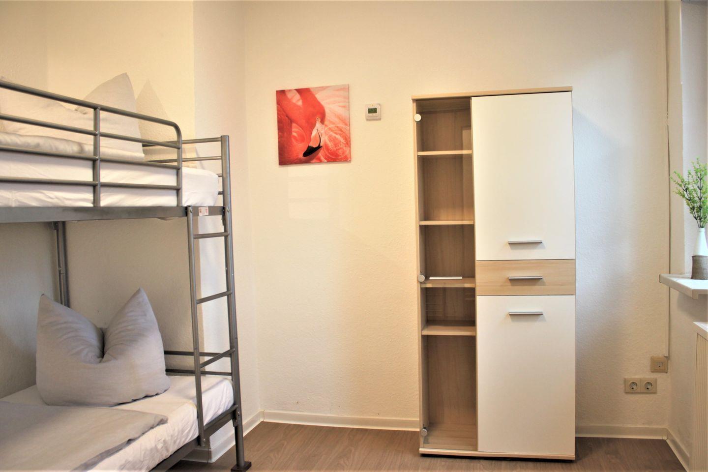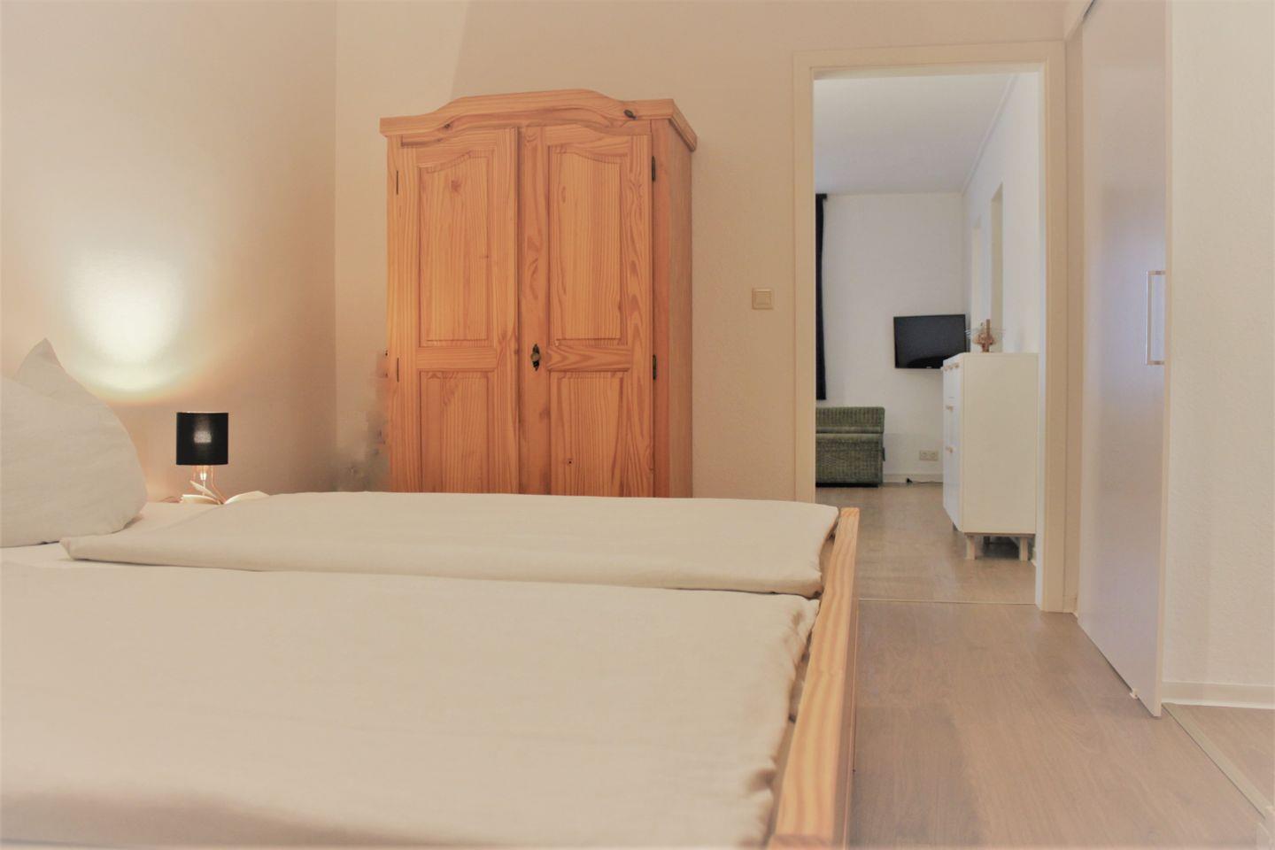 Das Wohnzimmer bietet eine gemütliche Sofaecke mit TV-Gerät, WLAN und Esstisch und lädt zum Entspannen ein. Die zwei separaten Schlafzimmer sind entweder mit einem Doppelbett oder Etagenbett und jeweils Stauraum für die Garderobe möbliert und ermöglichen erholsame Nächte. Die kleine Küche mit Fenster ist separat und verfügt über eine gute Ausstattung, die eine Selbstverpflegung ermöglicht. Das innenliegende Badezimmer ist mit einer Dusche, Waschtisch und WC ausgestattet. Ein zusätzliches Gäste-WC verfügt über ein WC, Waschbecken und Fenster.