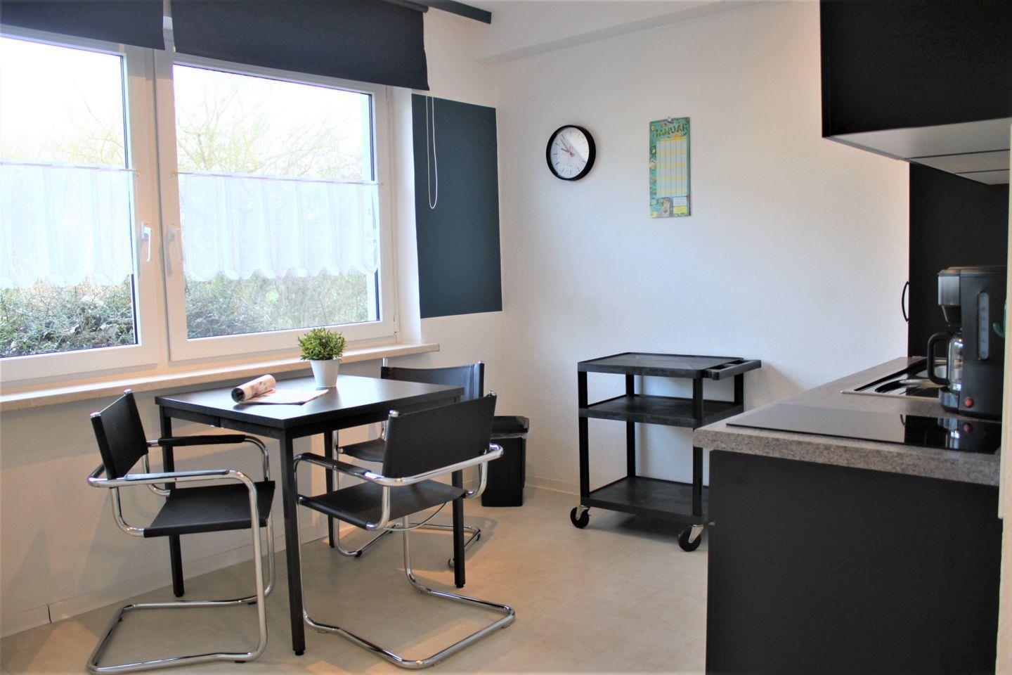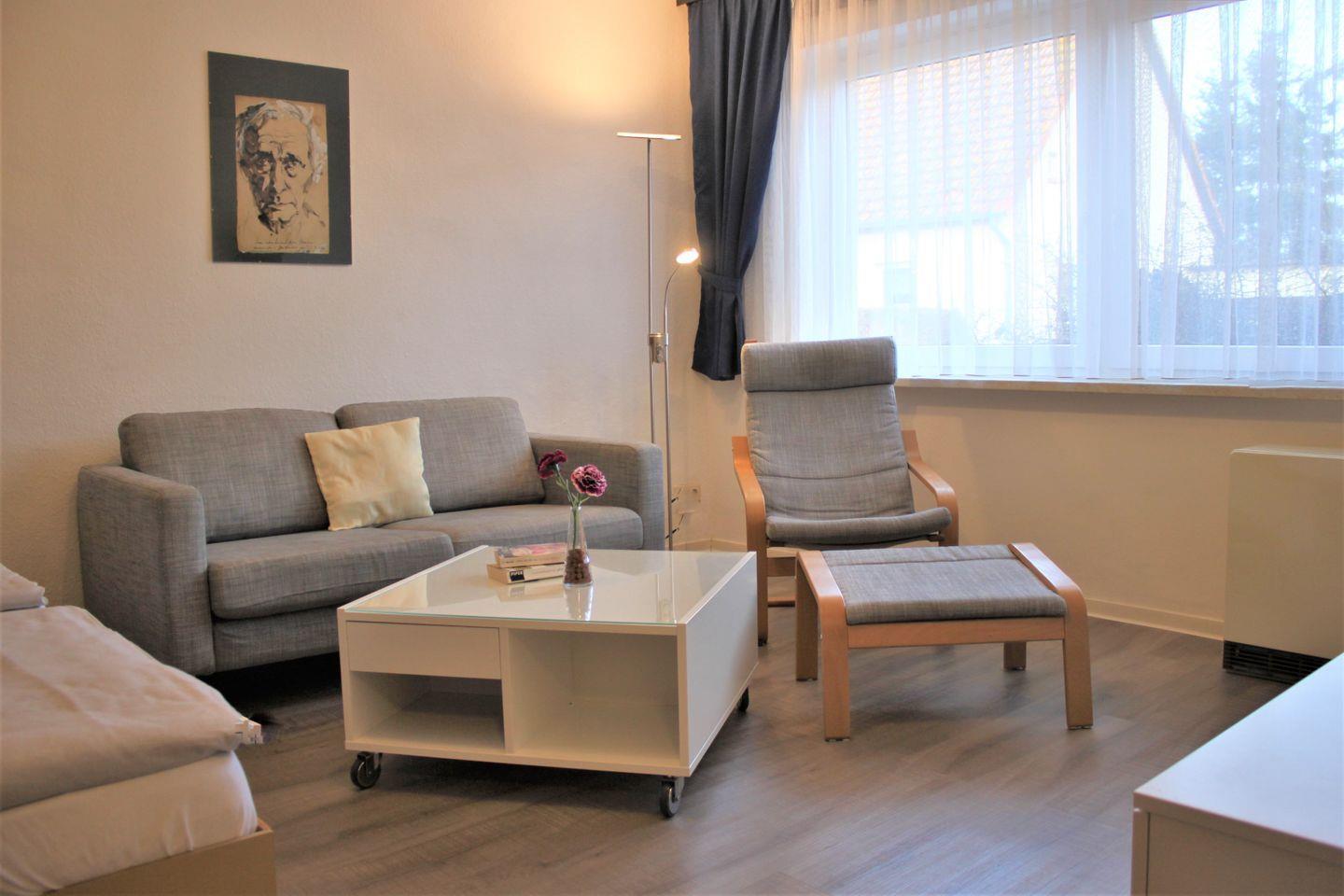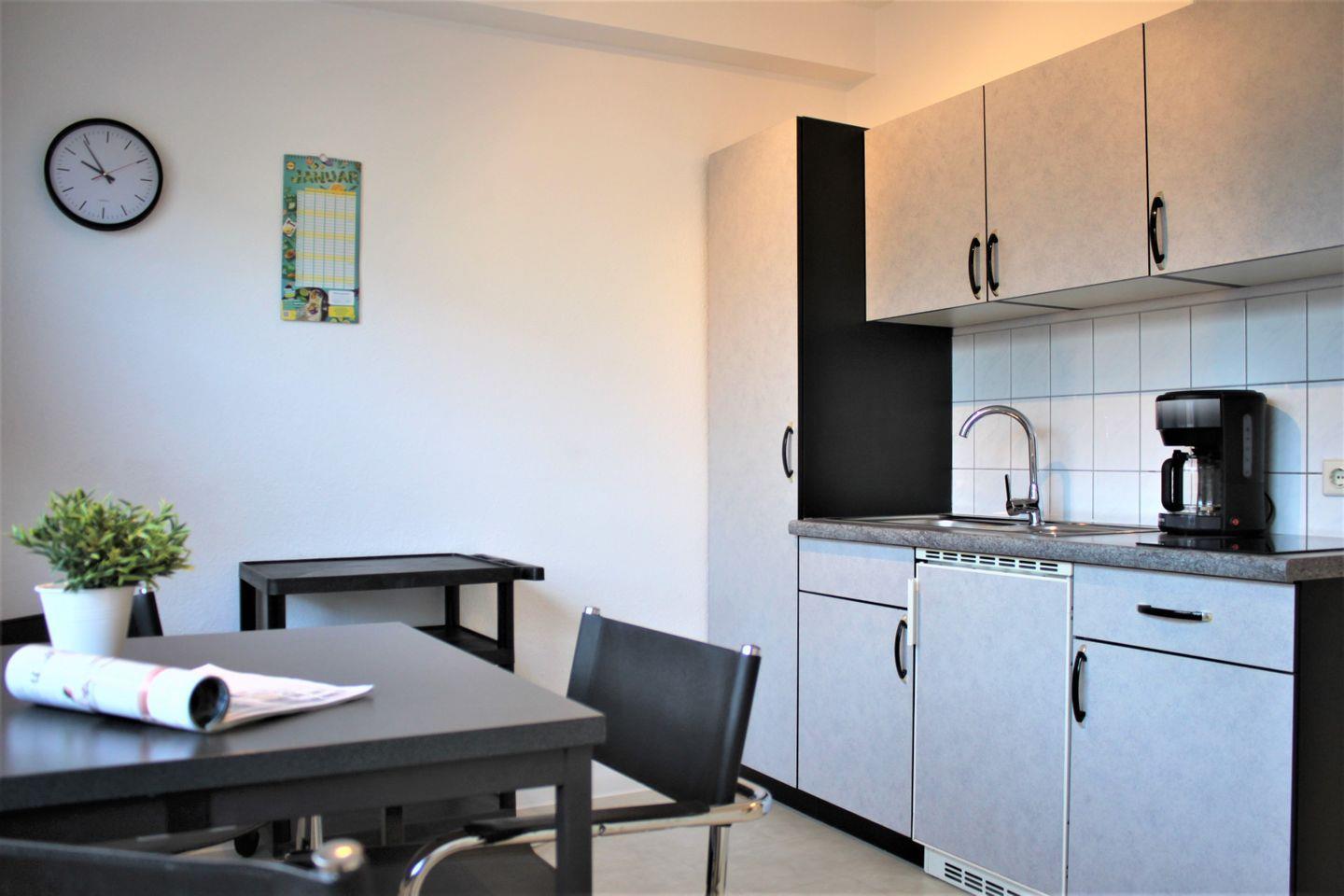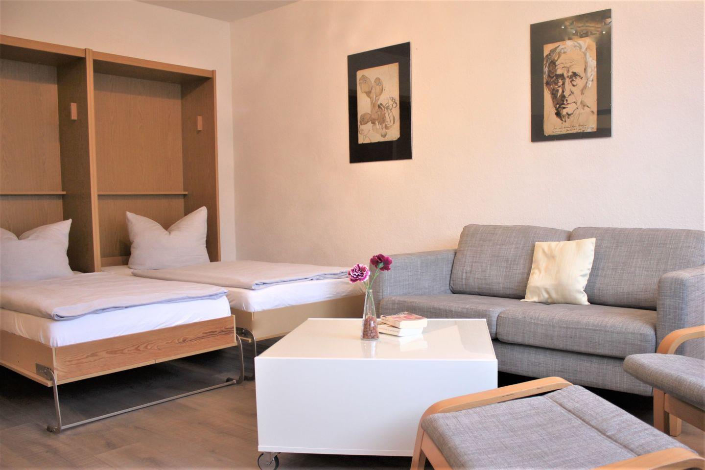 In diesem 1-Zimmer-Appartement können bis zu 2 Erwachsene und ein Kind einen schönen Urlaub verbringen. Ihnen stehen im separaten Wohnzimmer eine gemütliche Sofaecke mit TV-Gerät, WLAN, und zwei Einzelbetten (Schrankbetten) zur Verfügung. Der offen gestaltete Küchen-/Flurbereich bietet einen Esstisch und eine gut ausgestattete, integrierte Küchenzeile und bei Bedarf ein weiteren Schlafplatz (Einzelbett als Schrankbett).