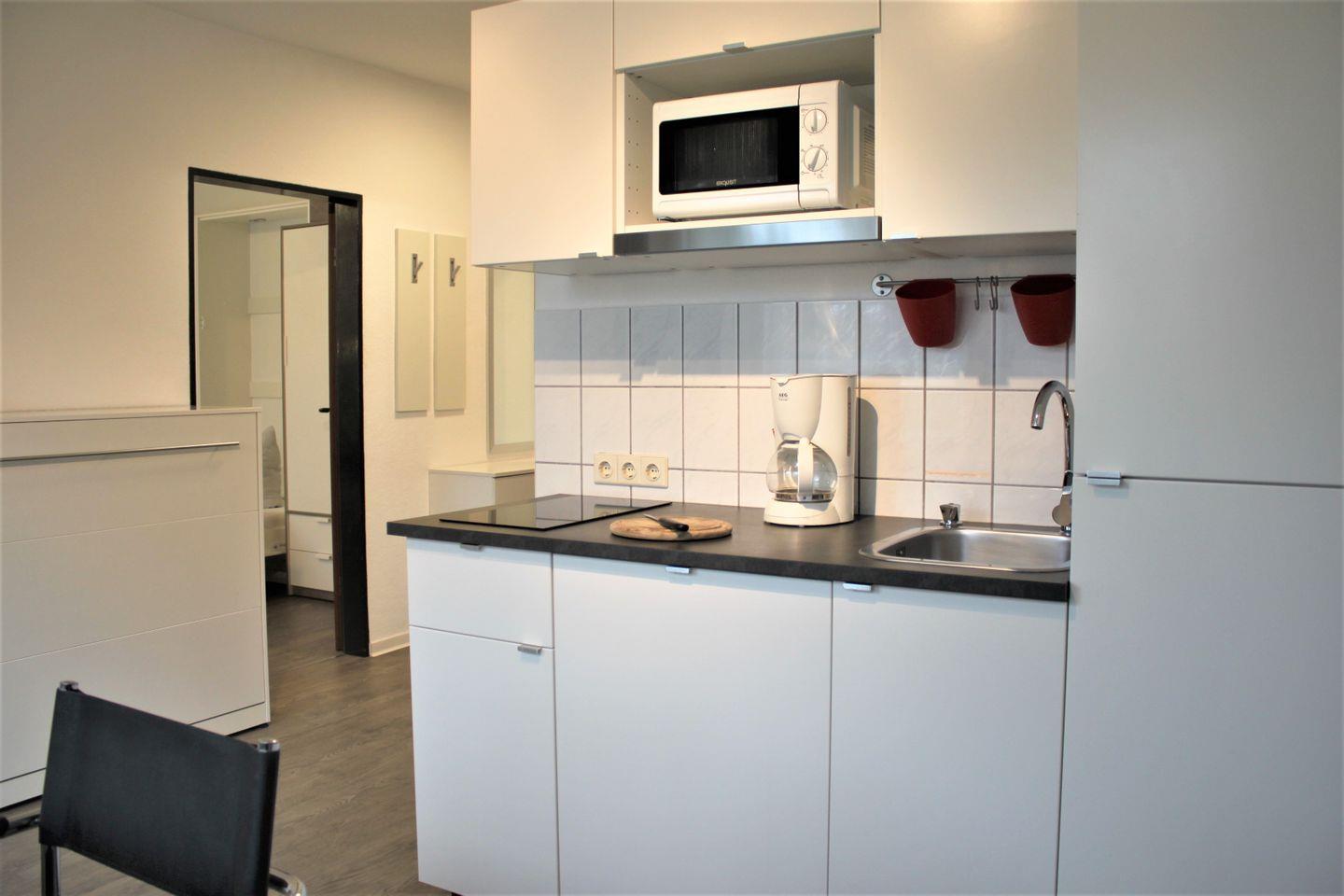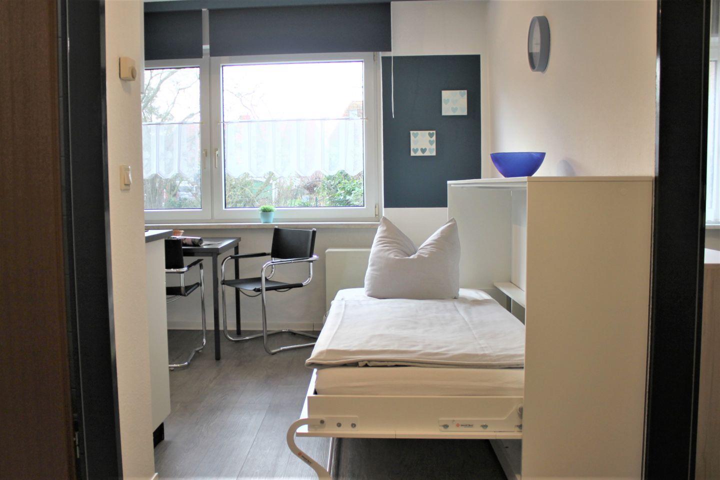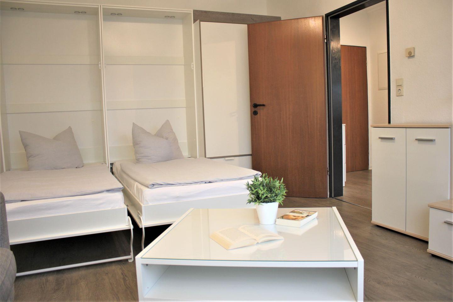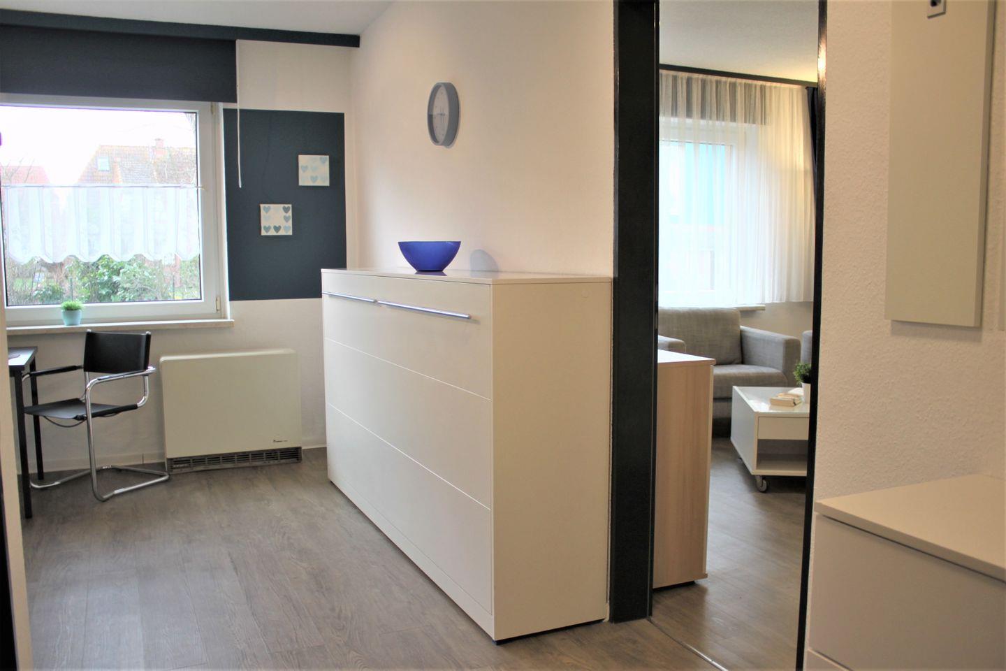 Das kombinierte Wohn- und Schlafzimmer ist separat und mit einem Sofa, Sessel, TV-Gerät und WLAN ausgestattet. Des weiteren verfügen Sie über zwei Einzelbetten (Schrankbetten) und einen Kleiderschrank. Ein zusätzliches Einzelbett (Schrankbett) ist im kombinierten Küchen-/Eingangsbereich vorhanden. Die moderne Küchenzeile ist gut ausgestattet und am Esstisch finden bequem 3 Personen Platz.