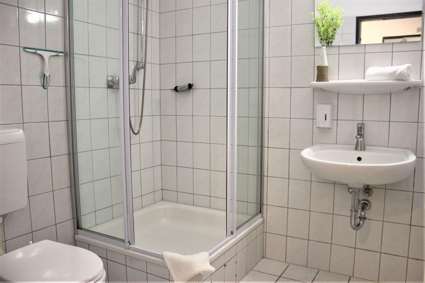 Das innenliegende Badezimmer bietet eine Dusche, Waschtisch und WC.