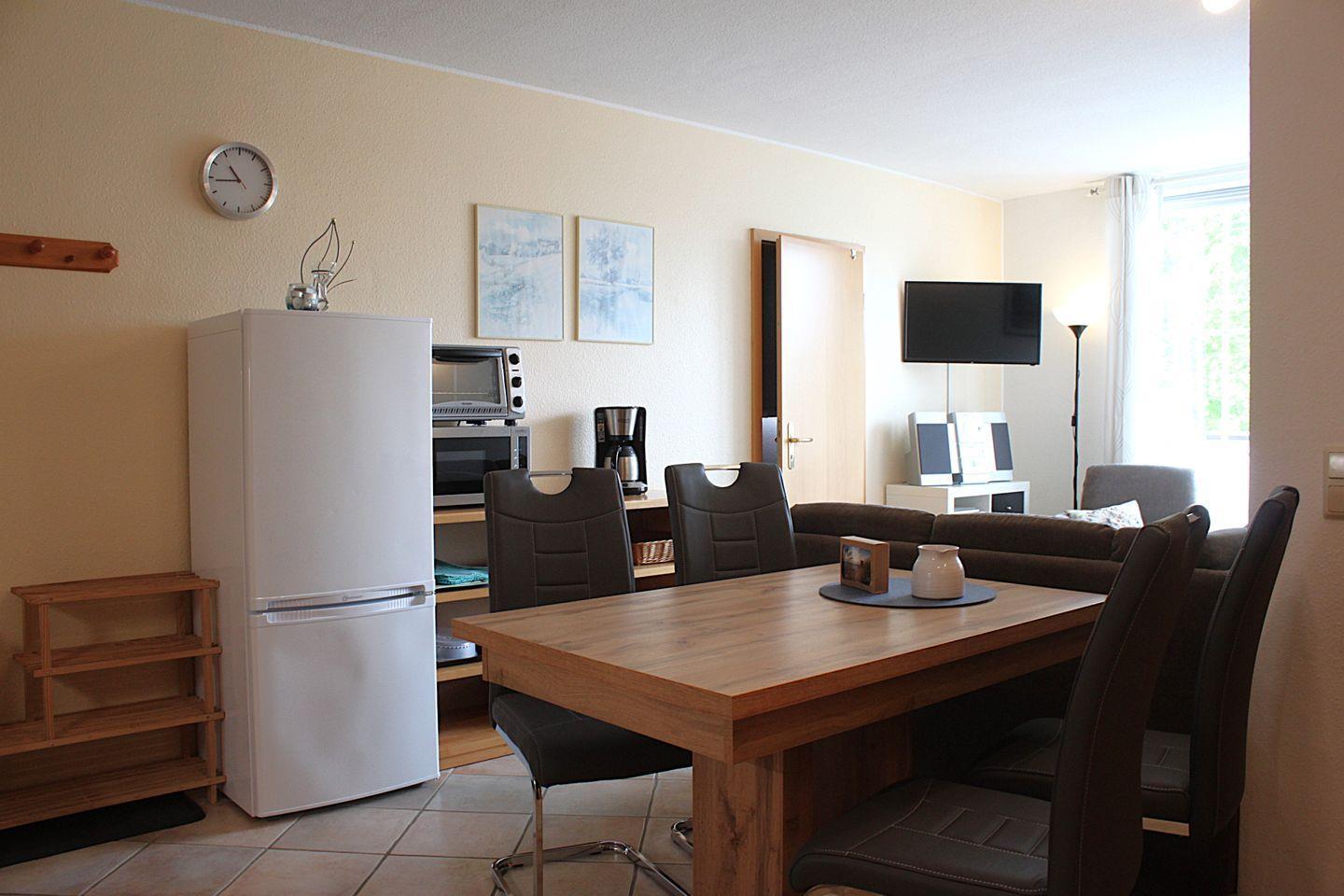 Das kombinierte Wohnzimmer und Esszimmer bietet ausreichend Platz, um sich zu entspannen und Ihre Mahlzeiten zu genießen. Ein Fernseher, Radio, CD-Player und DVD-Player sind vorhanden, um Ihre Lieblingsmusik abzuspielen oder einen Filmabend zu veranstalten. Die offene Küche ist funktional ausgestattet, darunter eine Mikrowelle, eine Kaffeemaschine, ein Eierkocher, ein Toaster und ein Wasserkocher.
