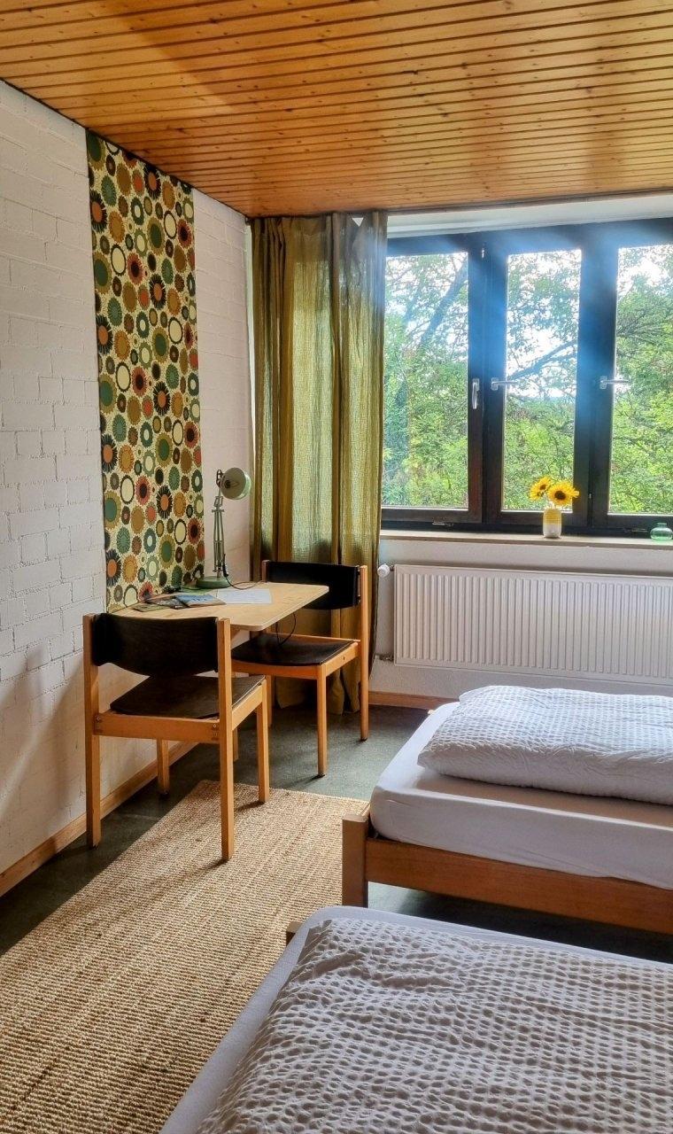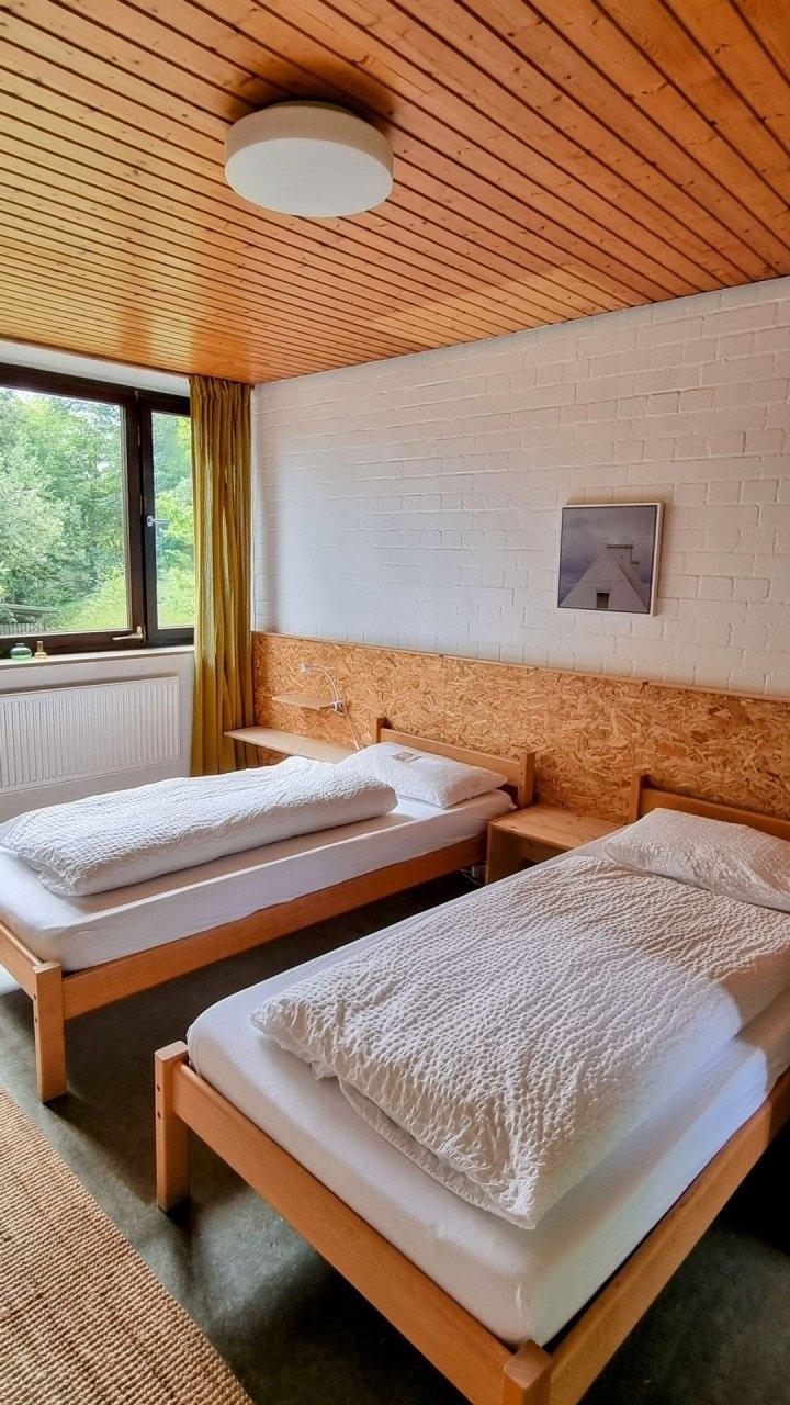 Dieses Zimmer verfügt über 2 getrennte Betten, welche man auch zusammenstellen kann. Ein eigener LAN-Anschluss und WLAN sind vorhanden. Ein Gemeinschaftsbad mit 2 Duschen und 2 Toiletten liegen auf der selben Etage, 2 weitere Bäder einen Stock tiefer.