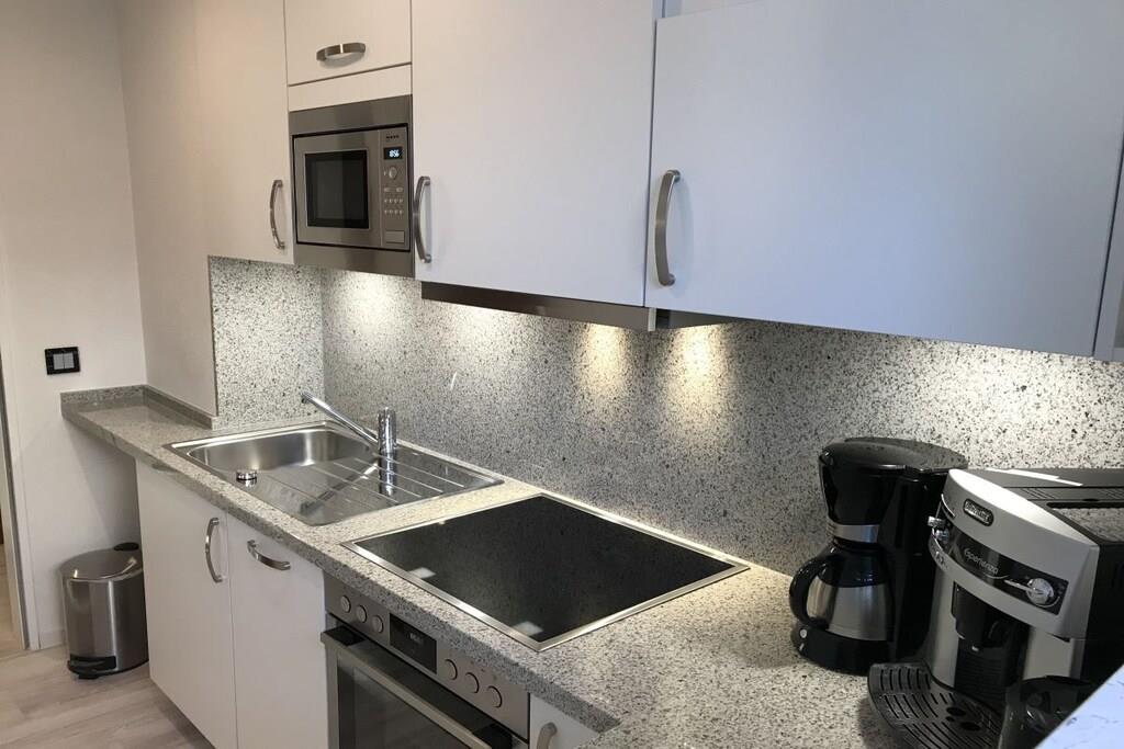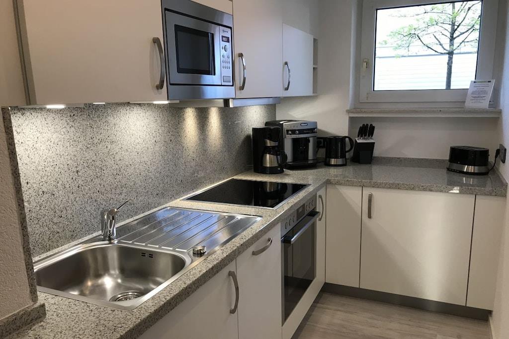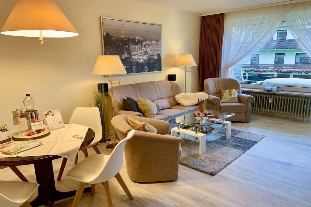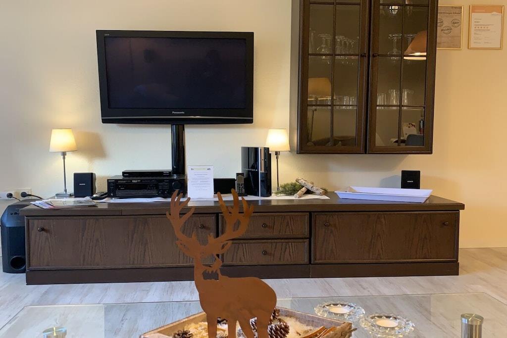 Die Fewo ist ca. 52m² groß, liegt im Erdgeschoss und teilt sich in ein großes gemütliches Wohnzimmer mit Essbereich und Zugang zur großen Sonnenloggia, ein komfortables Schlafzimmer mit Komfort-Doppelbett, ein Wannenbad mit WC und eine separate Einbauküche u.a. mit Geschirrspülmaschine und Kaffeevollautomat auf. Im Wohnzimmer befindet sich eine gemütliche Couchgarnitur mit Fernseh-Relaxsessel, Dolby-Surround-System, Flachbild-TV, PlayStation 3 und ein Bioethanolkamin. In der gesamten Ferienwohnung steht Ihnen ein Highspeed DSL-Internetzugang via WLAN gratis zur Verfügung! Die Ferienwohnung ist mit hellem & hochwertigem Vinyl-Fußboden in Holzoptik ausgelegt. Hervorragend geeignet für unsere Gäste mit vierbeinigen Familienmitgliedern!