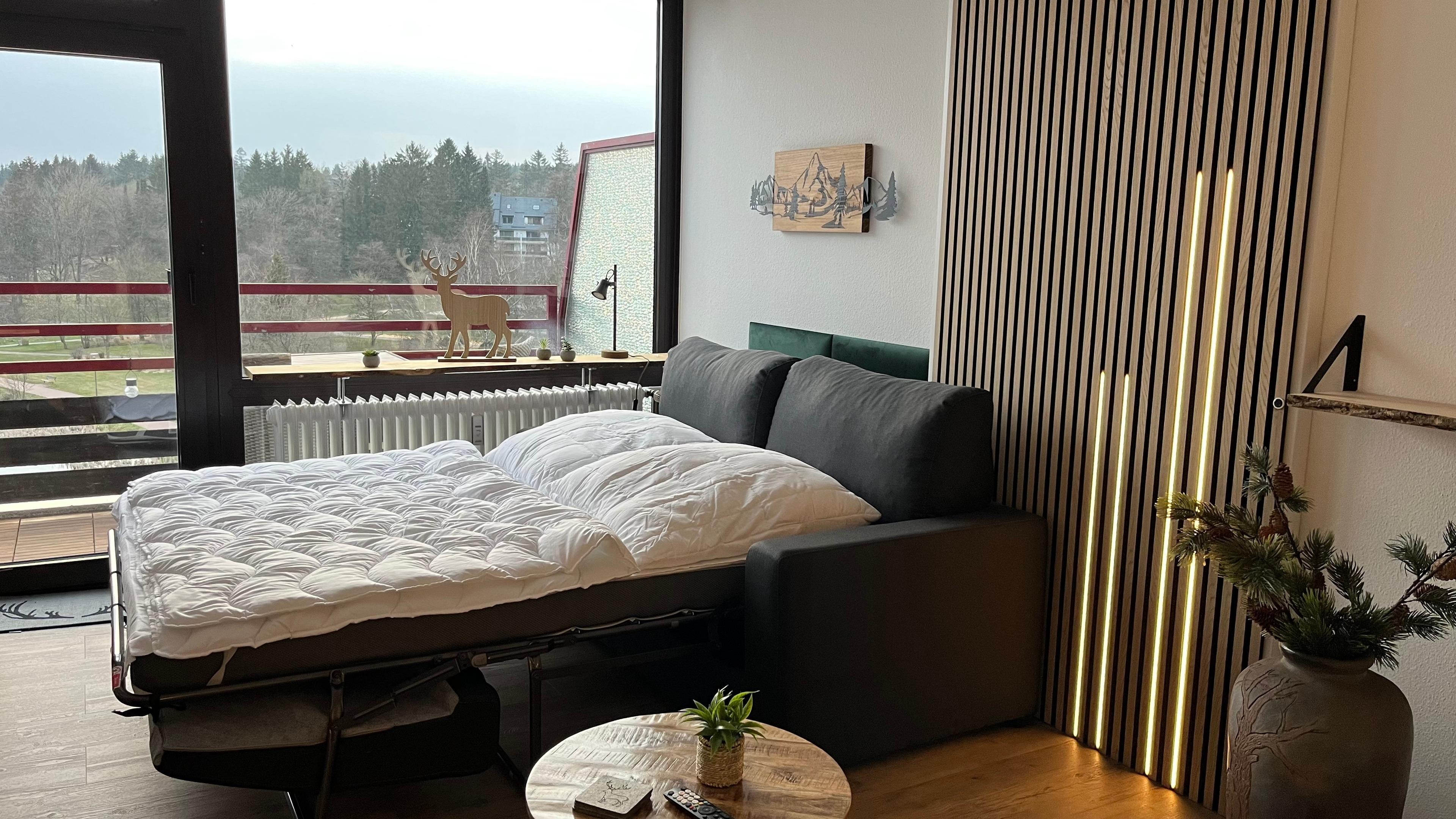 - Komfortables Schlafzimmer: Ein hochwertiges Doppelbett sorgt für erholsamen Schlaf nach einem Tag voller Aktivitäten.? Ein weiterer Gast schläft hervorragend auf dem Faltbettsofa mit einer bequemen Matratze.