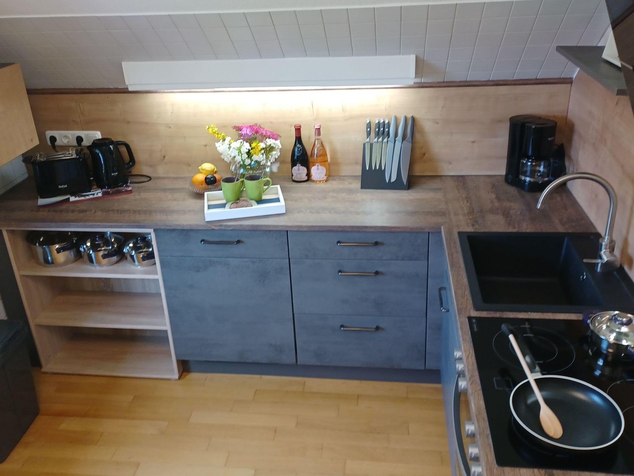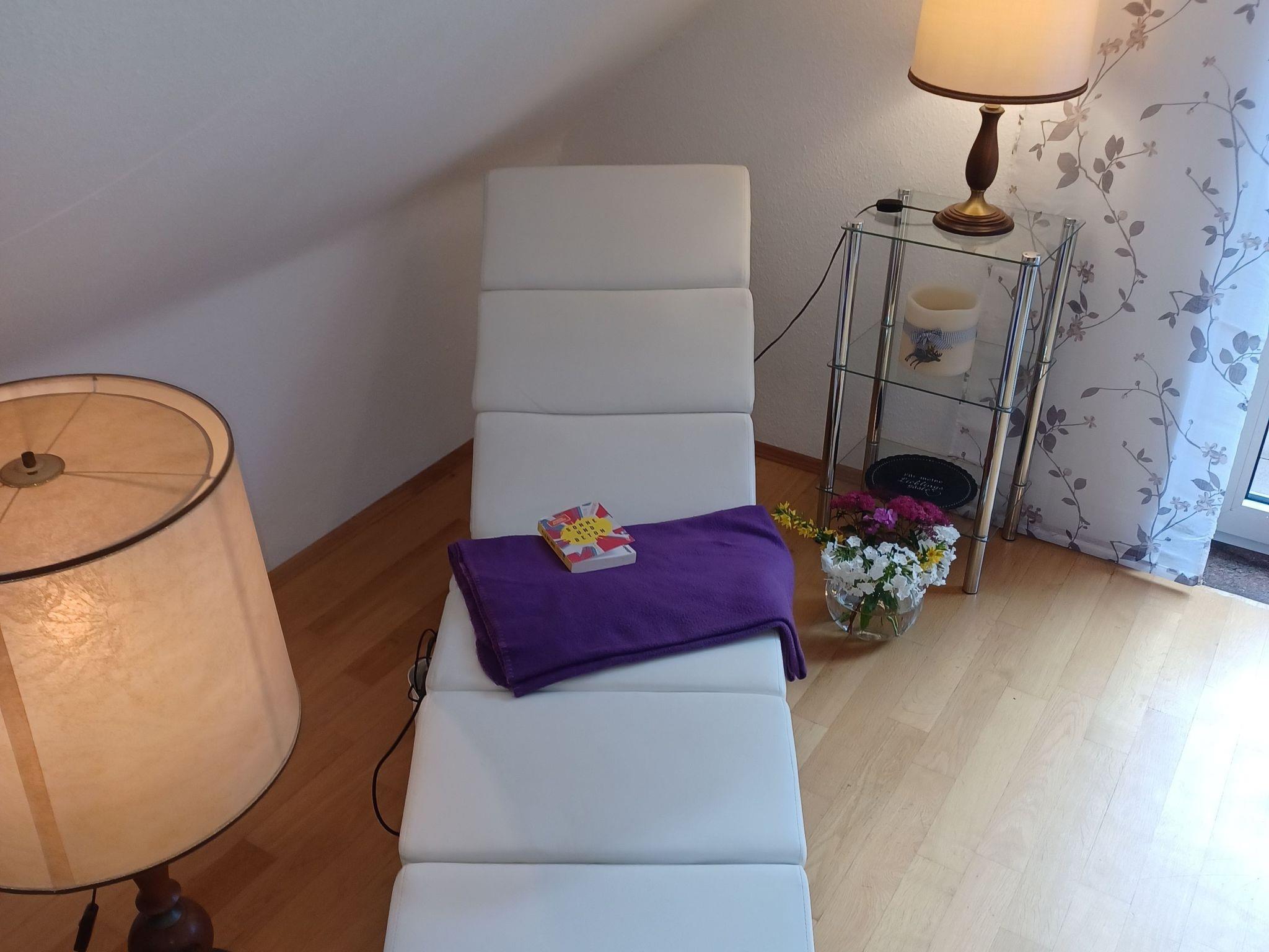 Inside, the approximately 70 square metre flat has an extensively equipped kitchen, including a dishwasher, toaster, coffee machine, kettle, an oven with 4 ceramic hobs and a large fridge with freezer combination. Further amenities such as a practical cloakroom with shoe cupboard in the hallway make your stay comfortable. The bright dining/living room impresses with a 65-inch TV, a comfortable lounge area, a large dining table and a relaxation lounger with electric massage function. Enjoy the marvellous distant view from your furnished balcony.