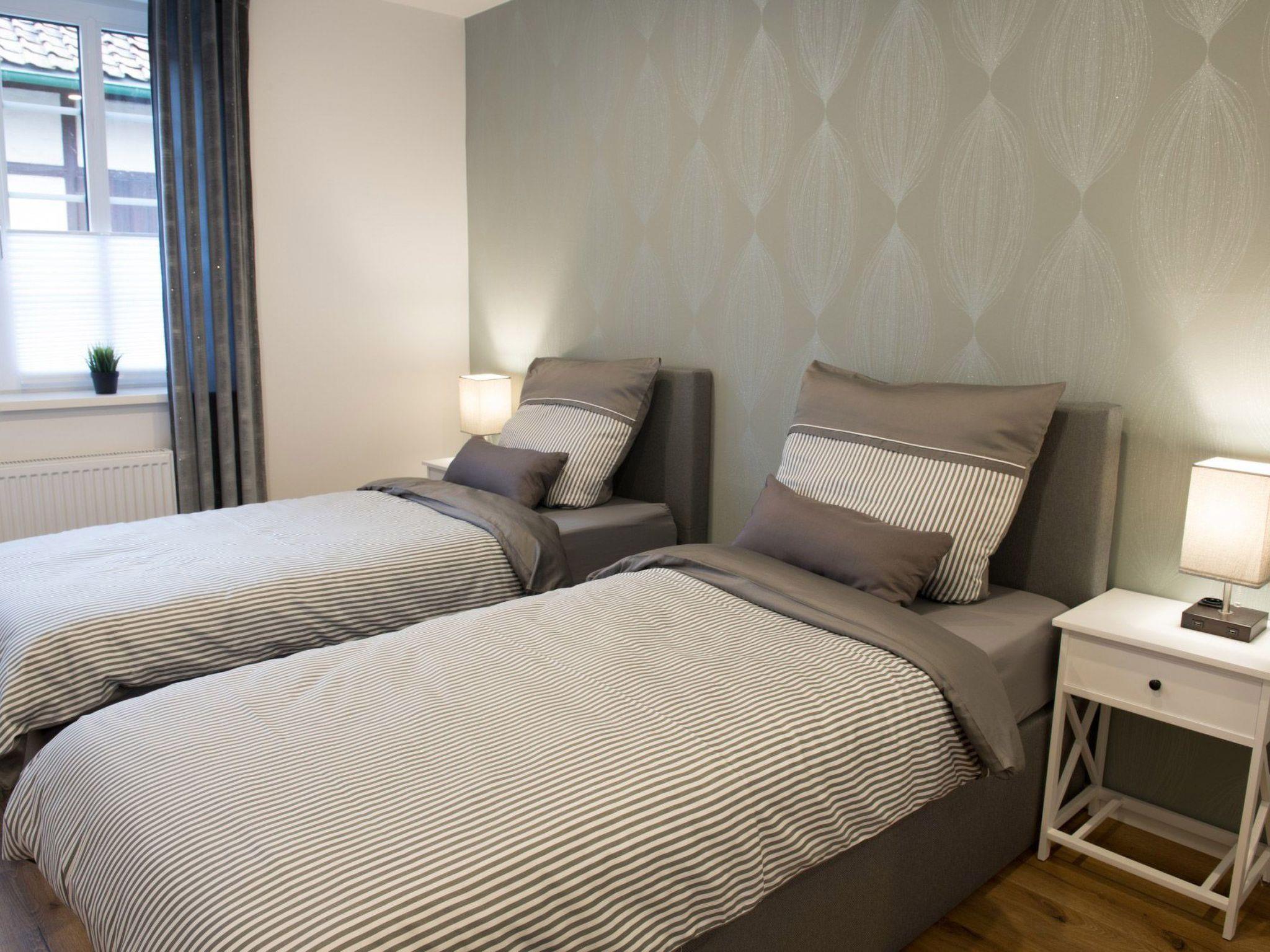 The living area offers you a seating area with a generous sleeping function for 2 people. A dining table for 6 people. A flat screen TV (satellite) and a Bluetooth box for entertainment. There is also a small desk for children to colour or for the businessman to read emails. Kitchen: The kitchen is fully equipped with dishwasher, fridge/freezer, oven, ceramic hob, extractor bonnet, microwave, coffee machine, toaster, tea maker and crockery for 12 people. Bathroom: The bathroom is modern and comfortably equipped with a shower cubicle, bathroom furniture with LED mirror and a tall cabinet with full-length mirror, a hairdryer and heated towel rail. There is also a footrest for the washbasin for our younger guests. Bedroom 1: A double bed with good 7-zone mattresses (total size 180cm), wardrobe, single full-length mirror. Enough space for a baby travel cot (baby travel cot can be provided on request)Bedroom 2: Two single box-spring beds with topper (total size per bed 90cm) = The beds can also be pushed together to create a lying surface of 180cm. A wardrobe with small toys and books. Further accessories available: Bed linen and towels (for the appropriate number of people), ironing board, iron, rotary dryer, hoover, brochures about Goslar
