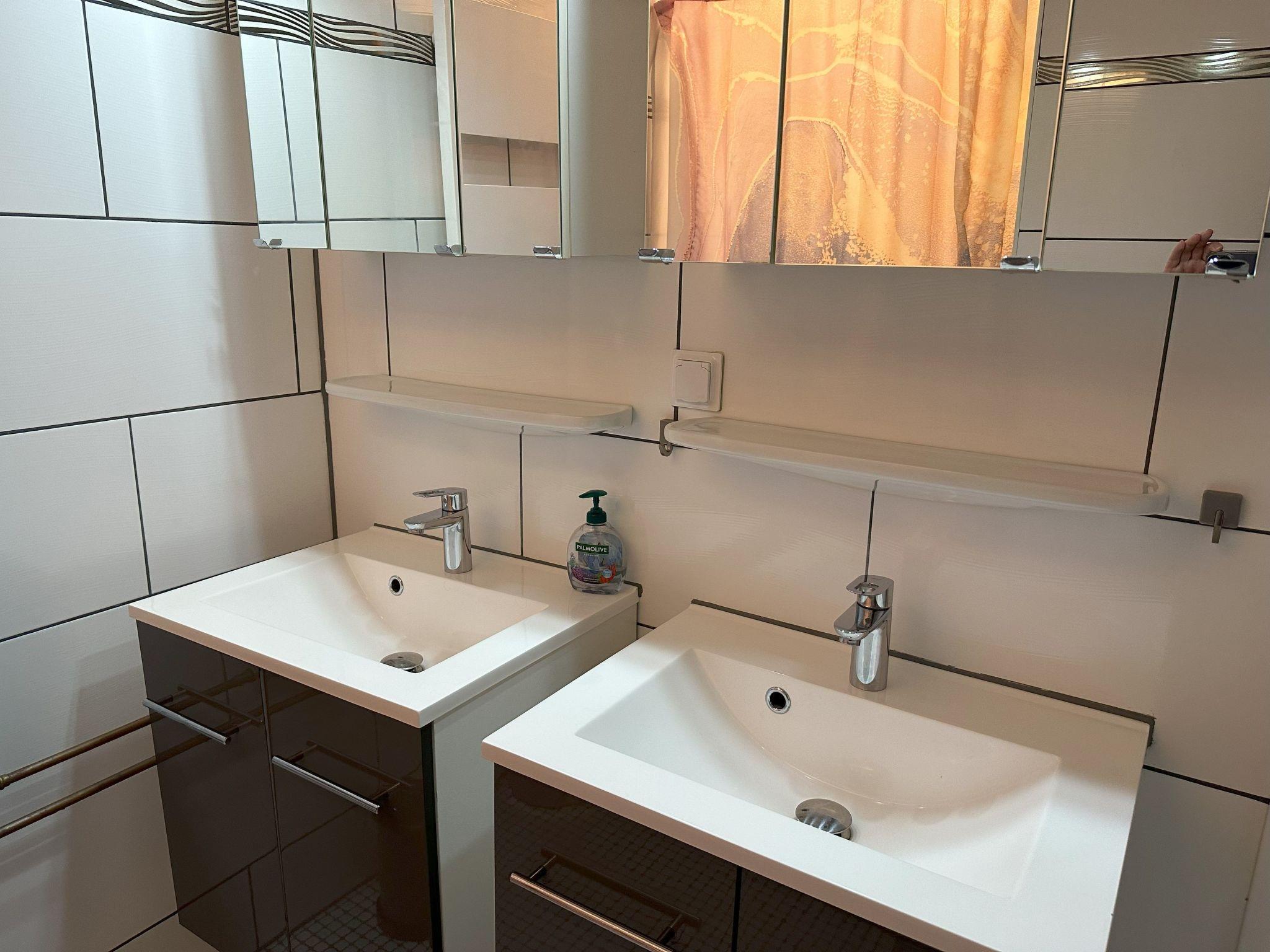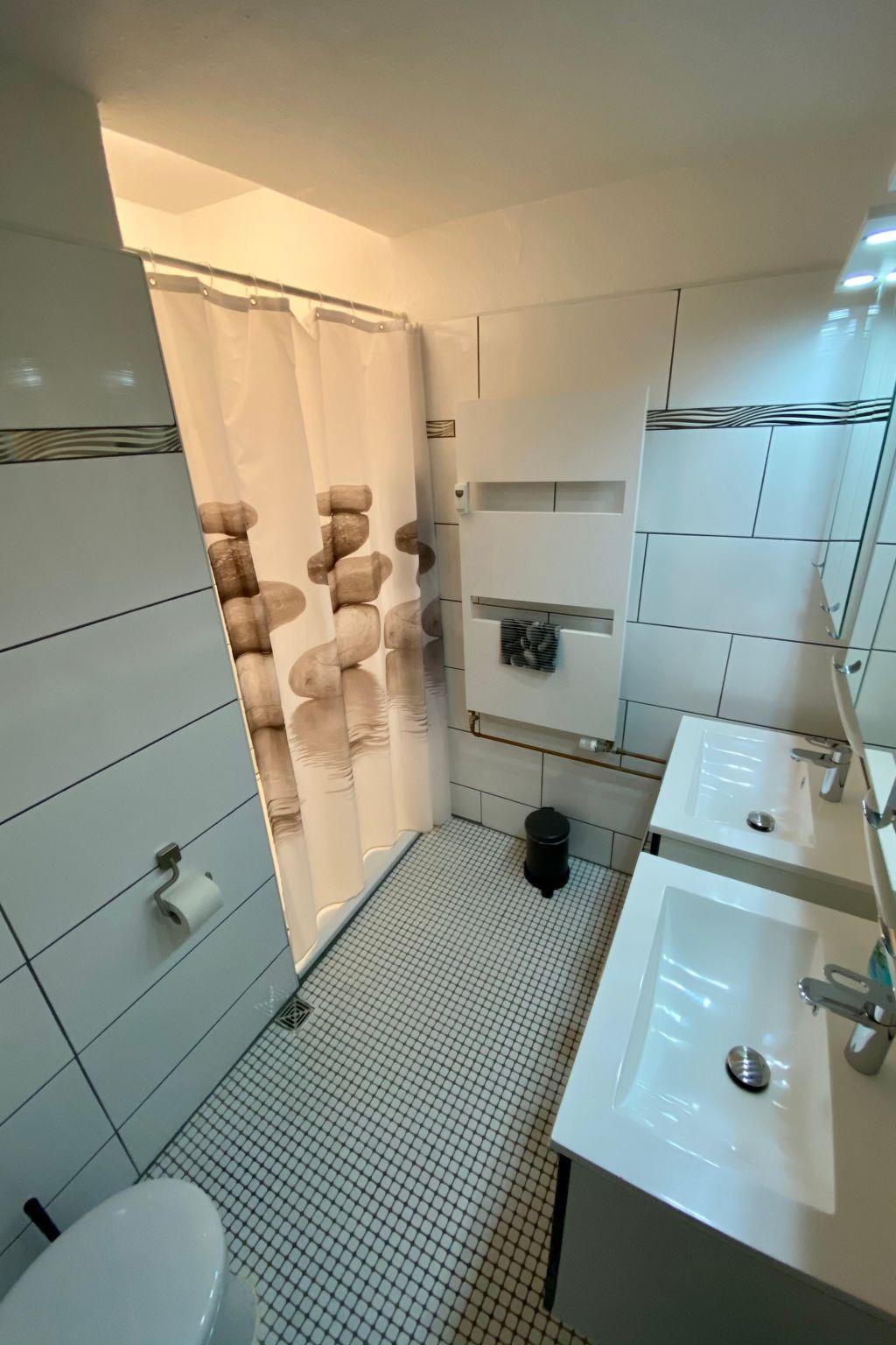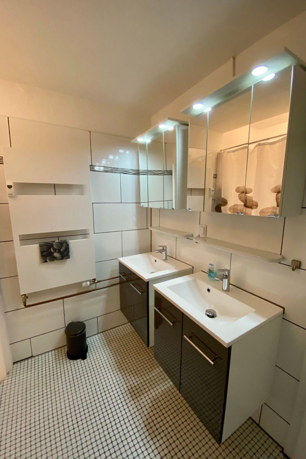 **Interior life in perfection**: Our flat offers everything for a carefree stay. Three bedrooms with high-quality box-spring beds guarantee peaceful nights. The combined living/dining room with modern kitchenette, equipped with dishwasher, microwave, coffee machine and much more, leaves nothing to be desired. In addition, two sanitary areas, 1 x equipped with walk-in showers and double washbasins, provide comfort. and 1 additional guest WC with hand basin. A Smart TV, GIGA TV Box from Vodafone and a DVD player, complemented by free high-speed WLAN, provide entertainment for the whole family.