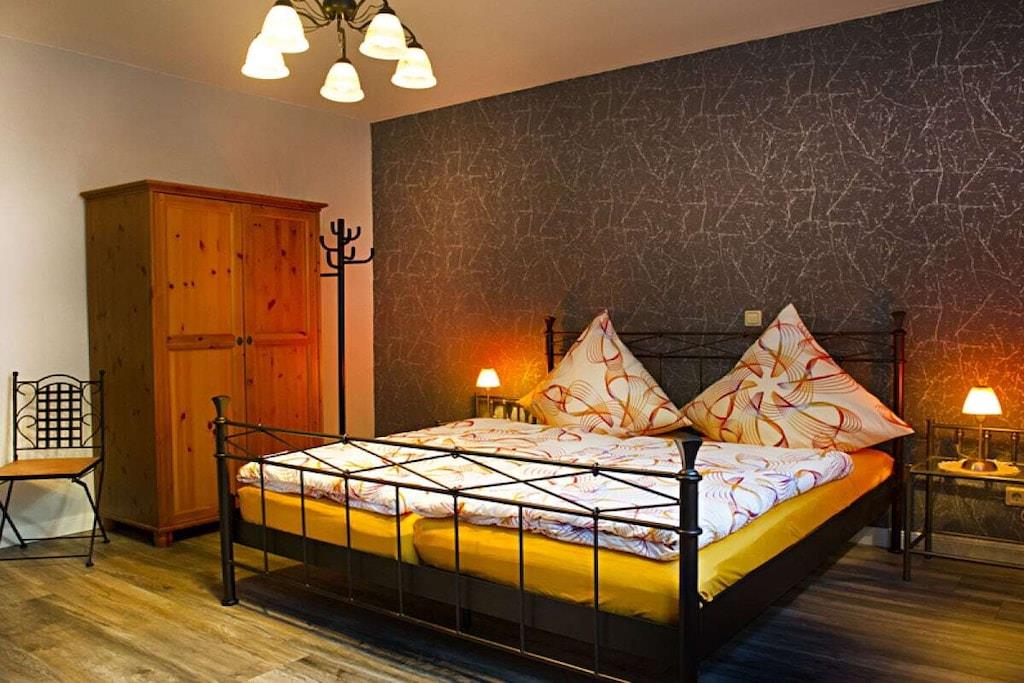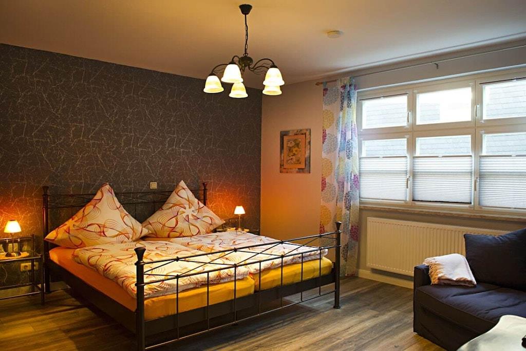 Die im Hochpaterre gelegene Ferienwohnung ist 55 m² groß und teilt sich auf in Schlafzimmer, Wohnzimmer, Küche, Duschbad und Flur. Die Ferienwohnung ist ausgestattet für zwei Personen. Auf dem Schlafsofa im Wohnzimmer können bequem zwei weitere Gäste übernachten. In der Küche finden Sie außer einer neuen Küchenzeile mit Backofen, Geschirrspüler, Kühlschrank und diversen Kleinelektrogeräten Zu Ihrer Unterhaltungselektronik gehören im Wohnzimmer ein Flachbildfernseher, eine Stereoanlage und ein DVD-Player. Im Schlafzimmer befindet sich ein weiterer Flachbildfernseher Das kleine Duschbad ist neu eingerichtet Bettwäsche, Fön, Hand- und Duschtücher stellen wir Ihnen kostenlos zur Verfügung Ihr Auto können Sie in der Nähe parken, mit kostenlosen Parkausweis. Ihr Motorrad oder Ihr Fahrrad steht bei uns sicher auf dem abgeschlossen Hof.
