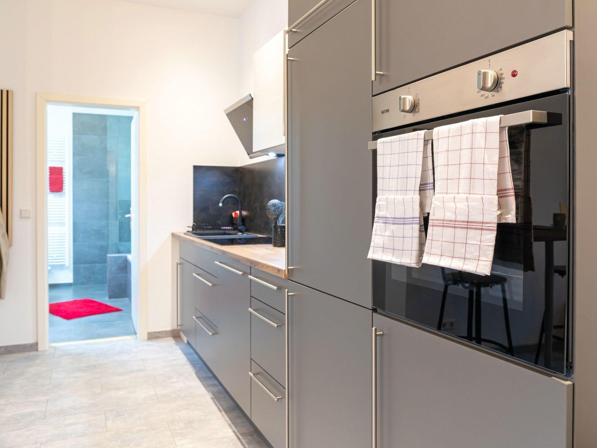 Schuhhof, ein 40 qm großes Einzimmerappartement im Hochparterre, offener Küche und Frühstücksecke mit Sitzgelegenheit im Laubengang. Bad mit Badewanne und Dusche.