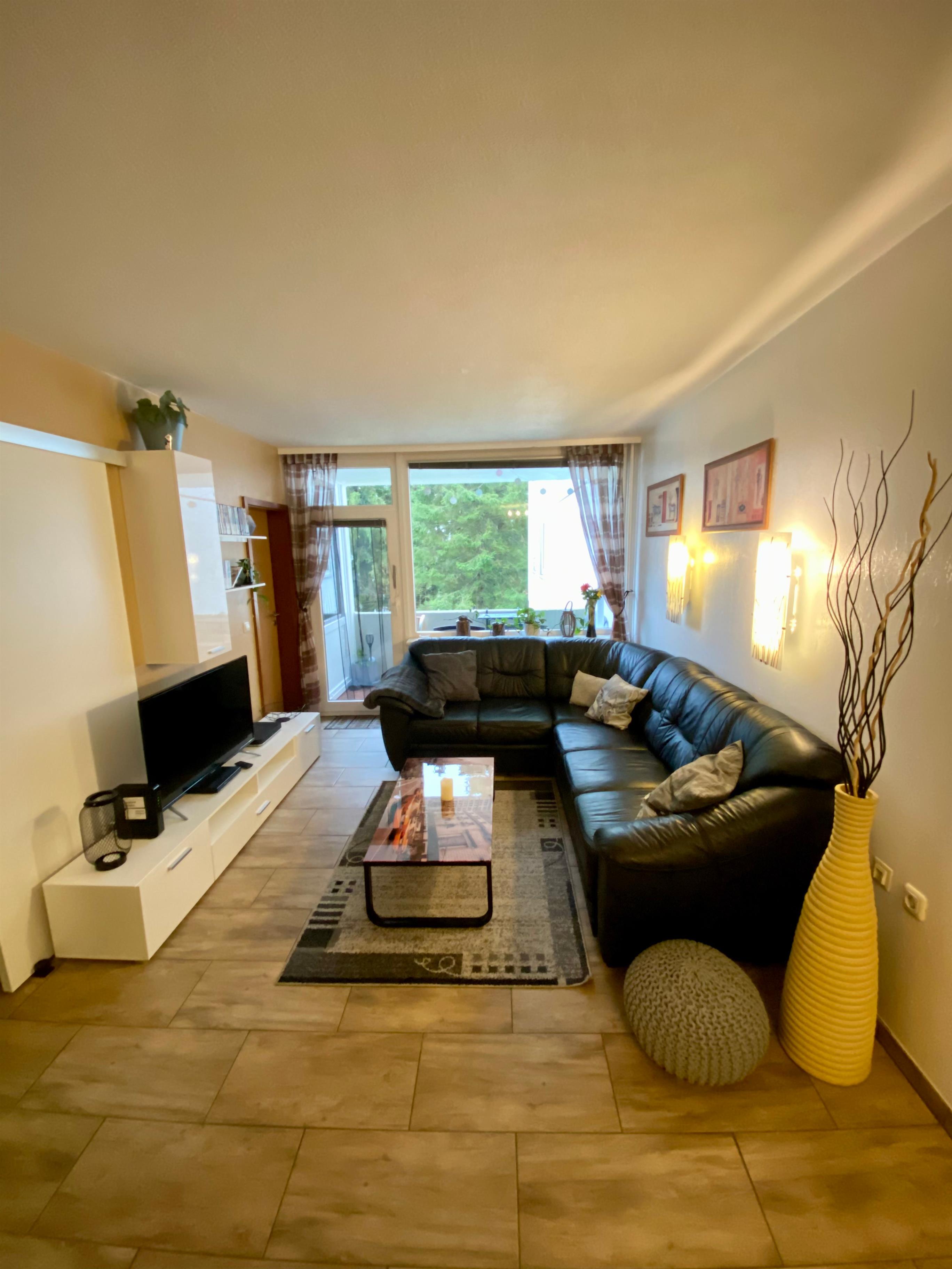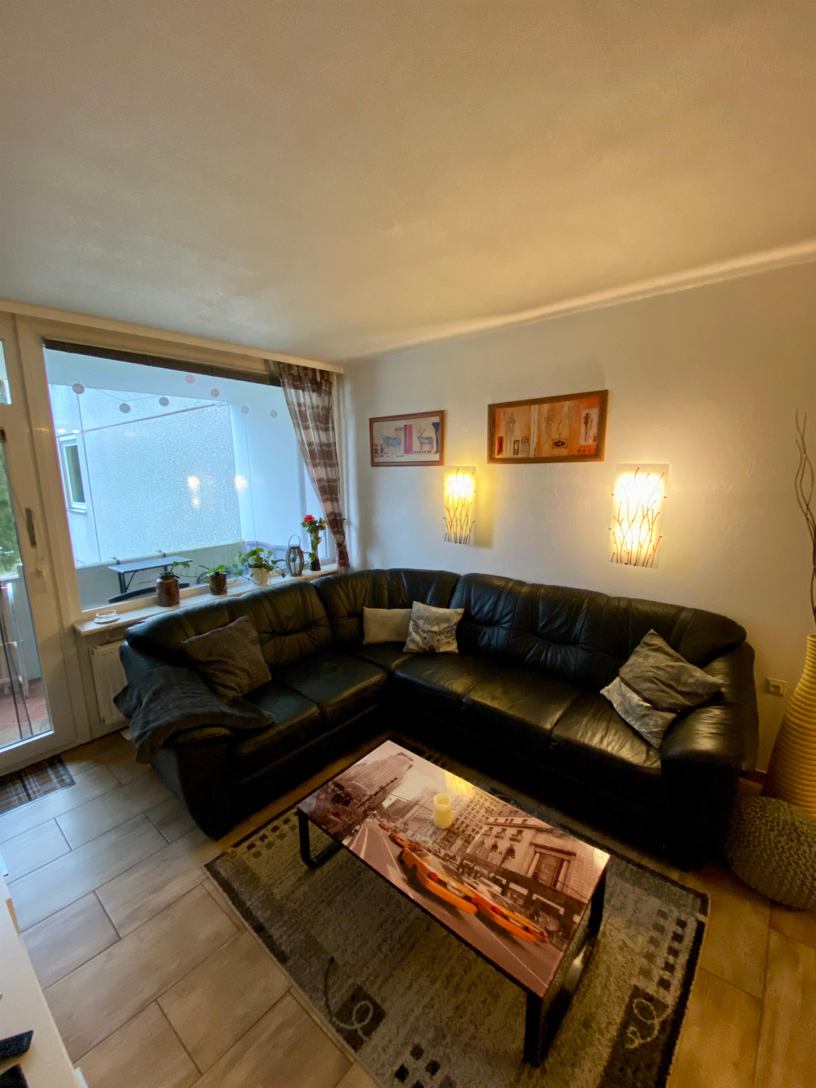 Wohnzimmer mit schwarzem Ledersofa, für eine 5. Person kann das Sofa ausgezogen werden