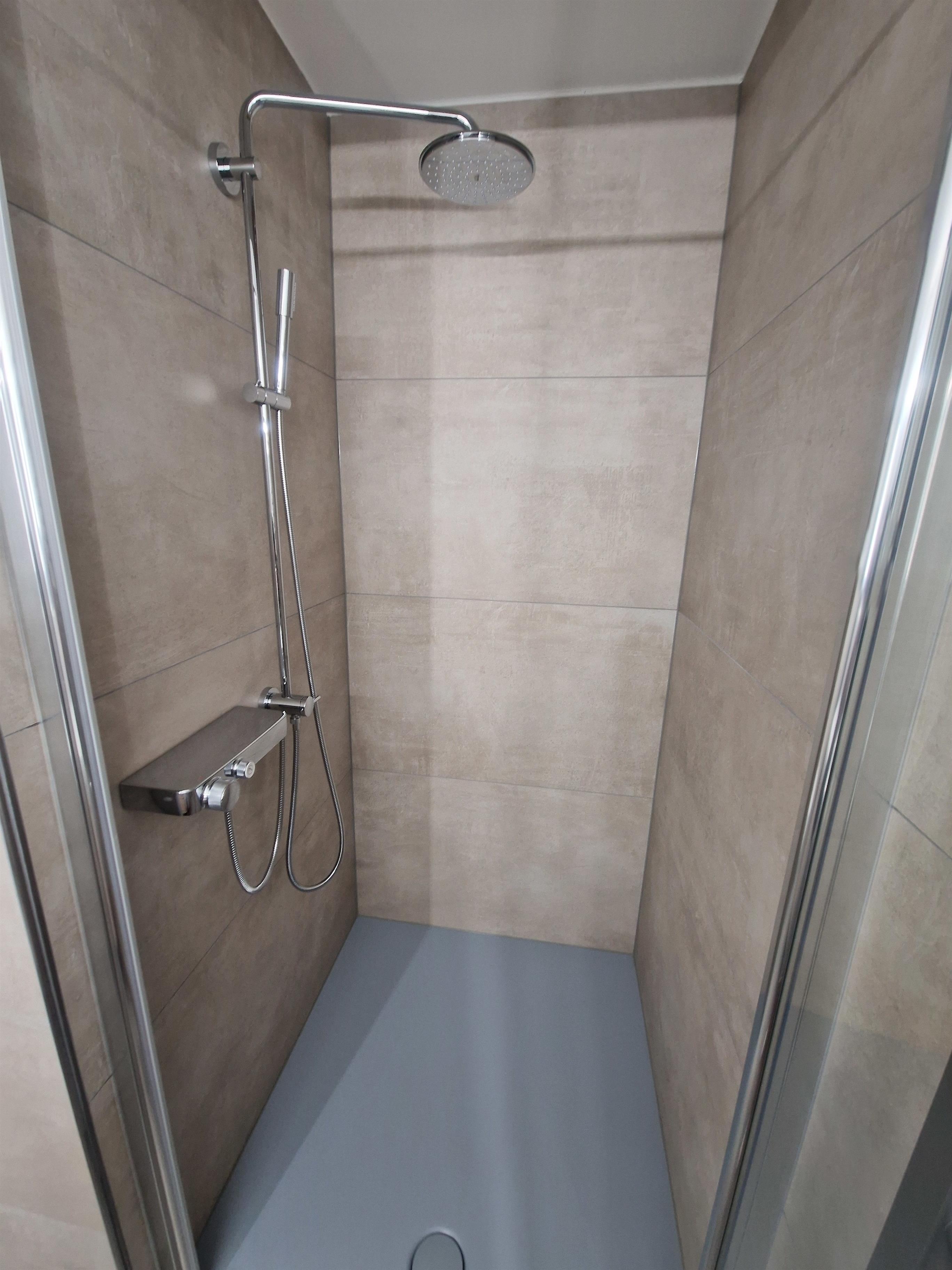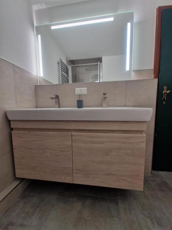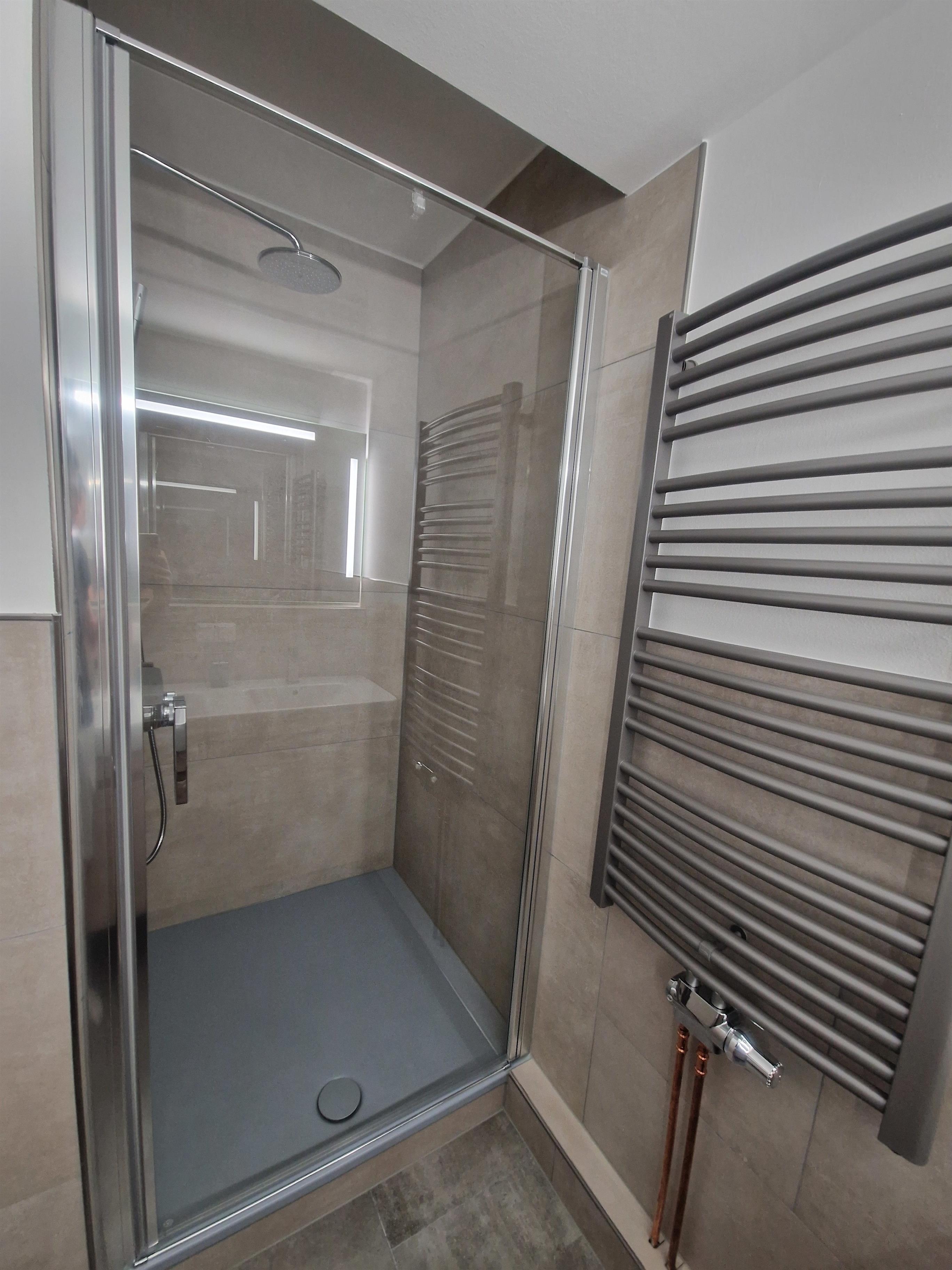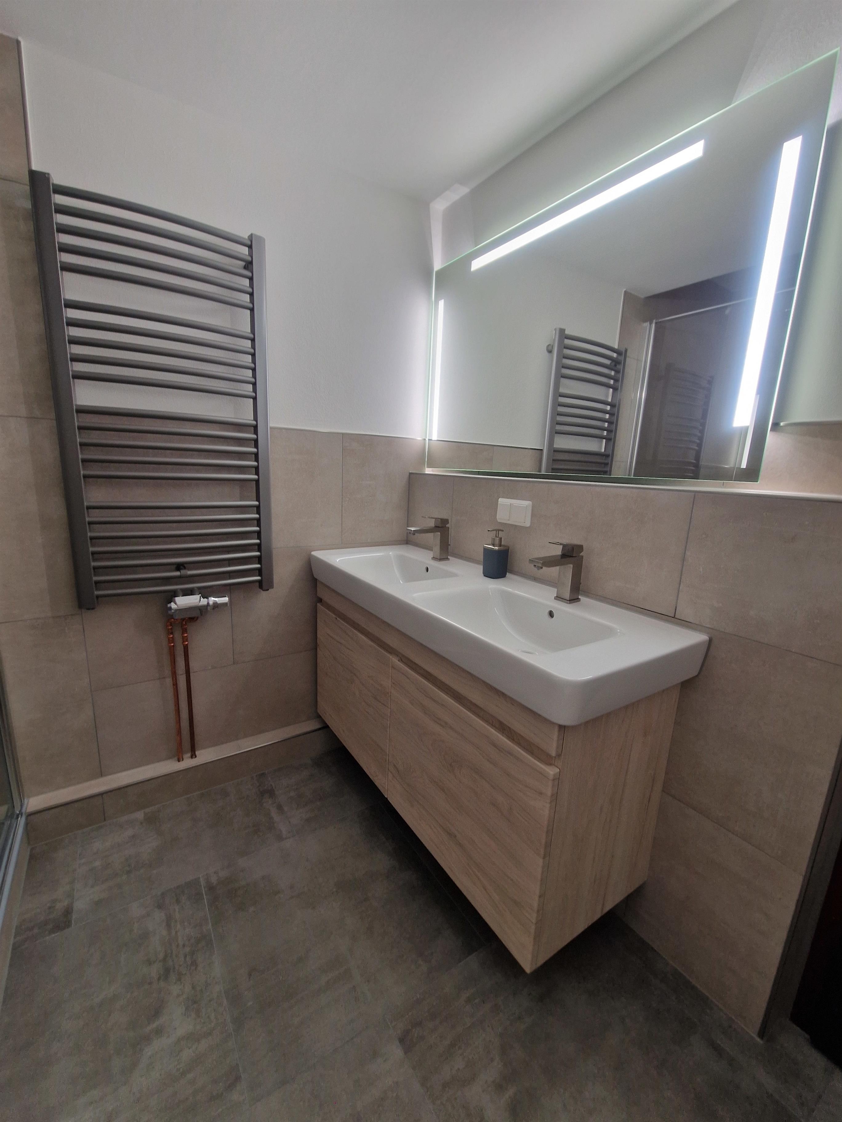 Das Haupt-Badezimmer ist mit einer großen (Regen-)Dusche, einem Doppelwaschbecken, WC und Handtuchheizkörper ausgestattet. Darüber hinaus gibt es noch ein weiteres, kleines Badezimmer mit WC und Waschbecken.