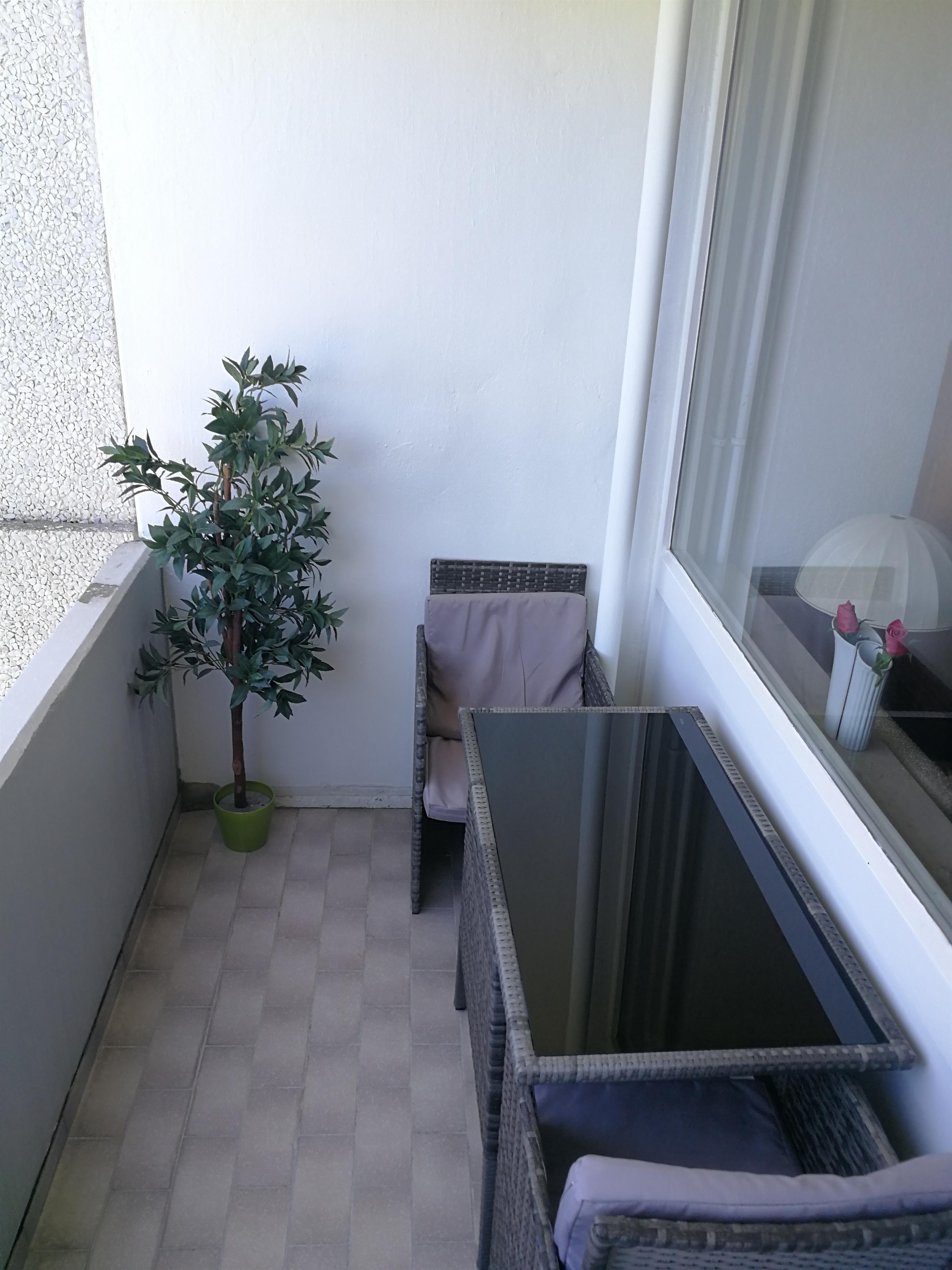 Auf dem Balkon kann man in der Morgensonne wunderbar frühstücken und den etwas versteckten Blick auf den Bocksberg und aufs Grüne mit Minigolfanlage genießen.