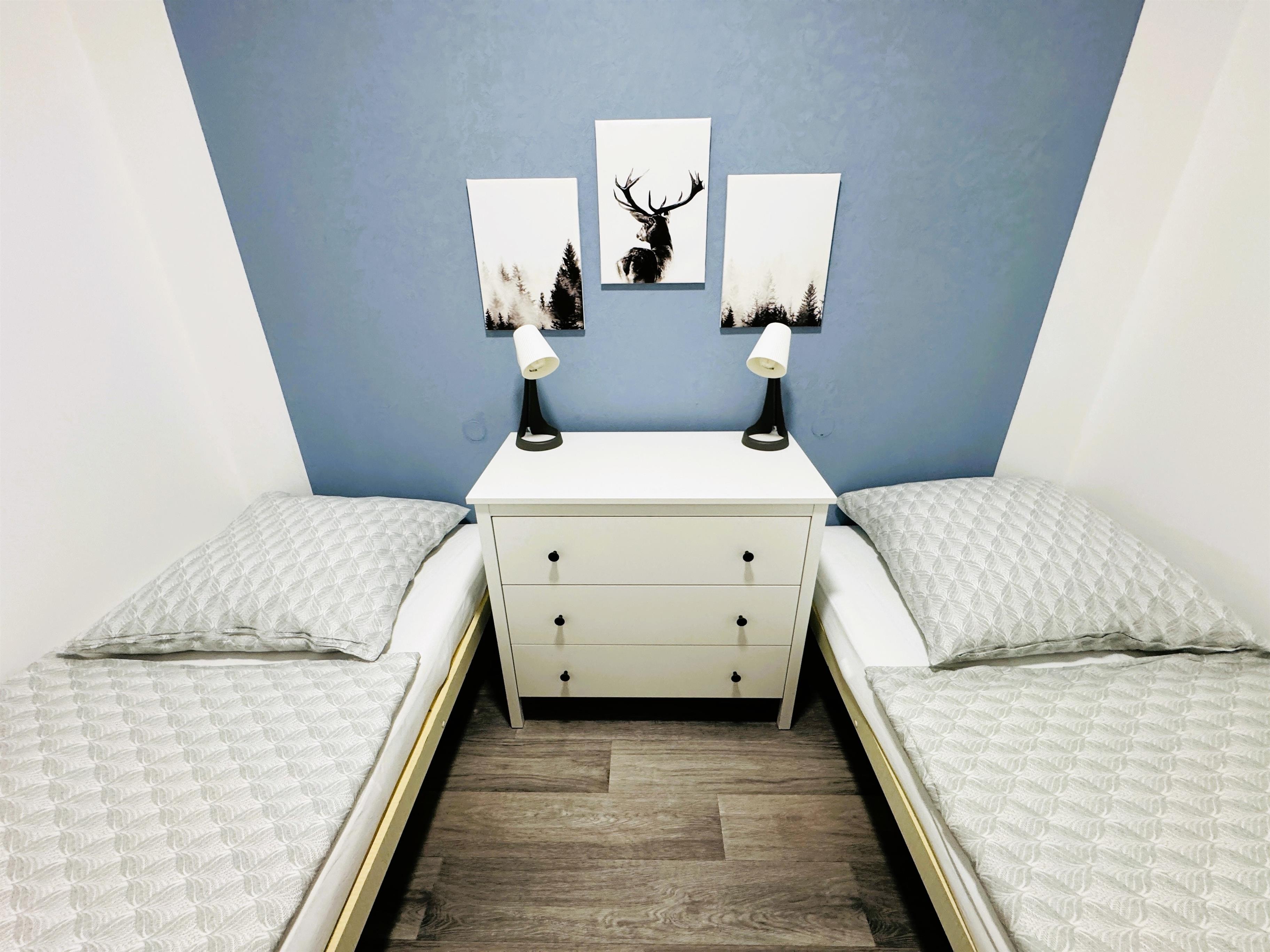 • 2 separate Schlafzimmer (1 Doppelbett, 2 Einzelbetten, 1 Extra-Gäste-Klappbett)